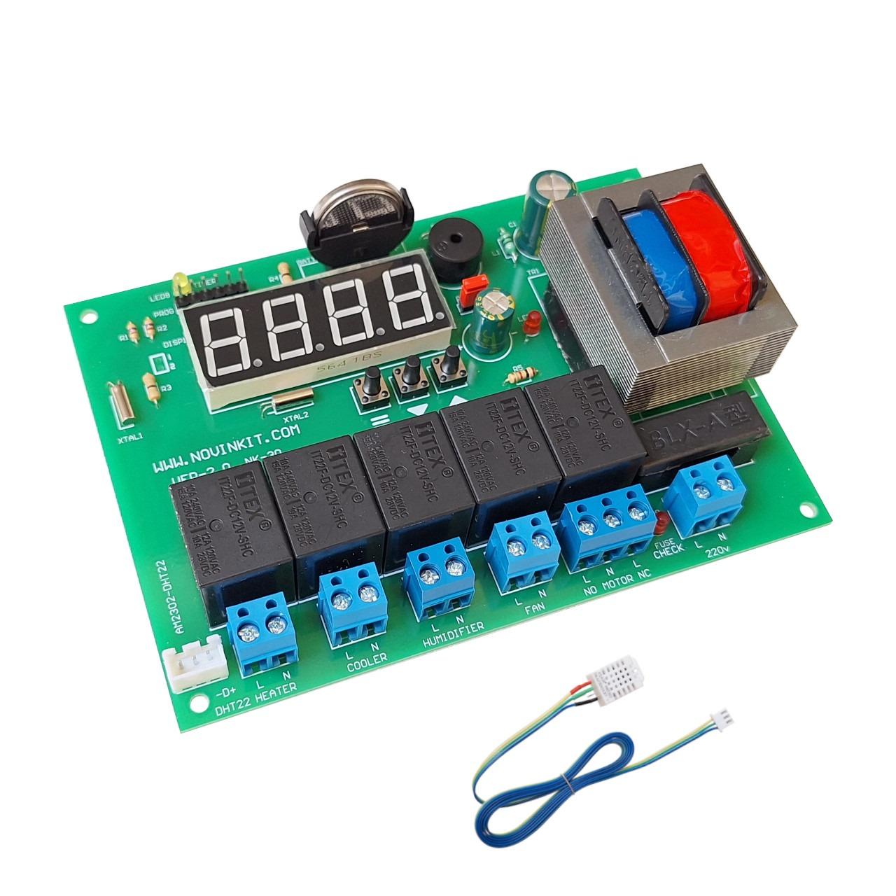 این برد جدیدترین و کاملترین (نسخه 2.0) برد کنترلر دما، رطوبت و تایمر است که برای ساخت ماشین جوجه کشی، گلخانه، سالن پرنده، پرورش قارچ، میلورم، اتوماسیون صنعتی و... بکار میرود. در این برد از سنسور قدرتمند و اورجینال AM2302 که با نام DHT22 نیز شناخته میشود استفاده شده است. این سنسور دیجیتال دقت و پایداری قابل قبولی داشته و میتوان آن را با سه رشته سیم تا بیشتر از 20 متر دورتر از برد قرار داد. (سیم پیشفرض سنسور 1 متر می باشد)