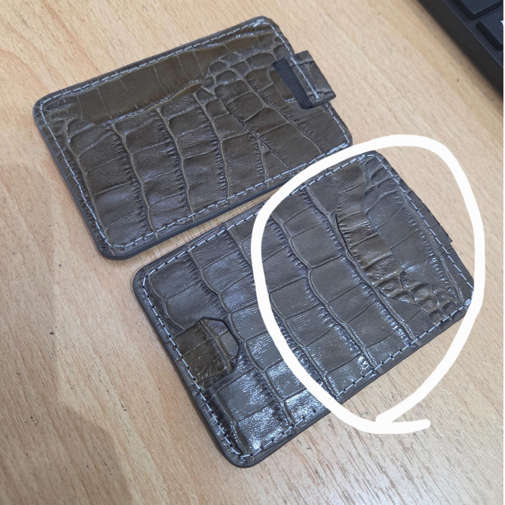 این جاکارتی خوشدست همانطور که در عکس 2 مشخص است دو رنگ بودن قسمت های چرم جاکارتی باعث عدم تایید در تیم کنترل کیفیت مجموعه تولیدی ما شده است.