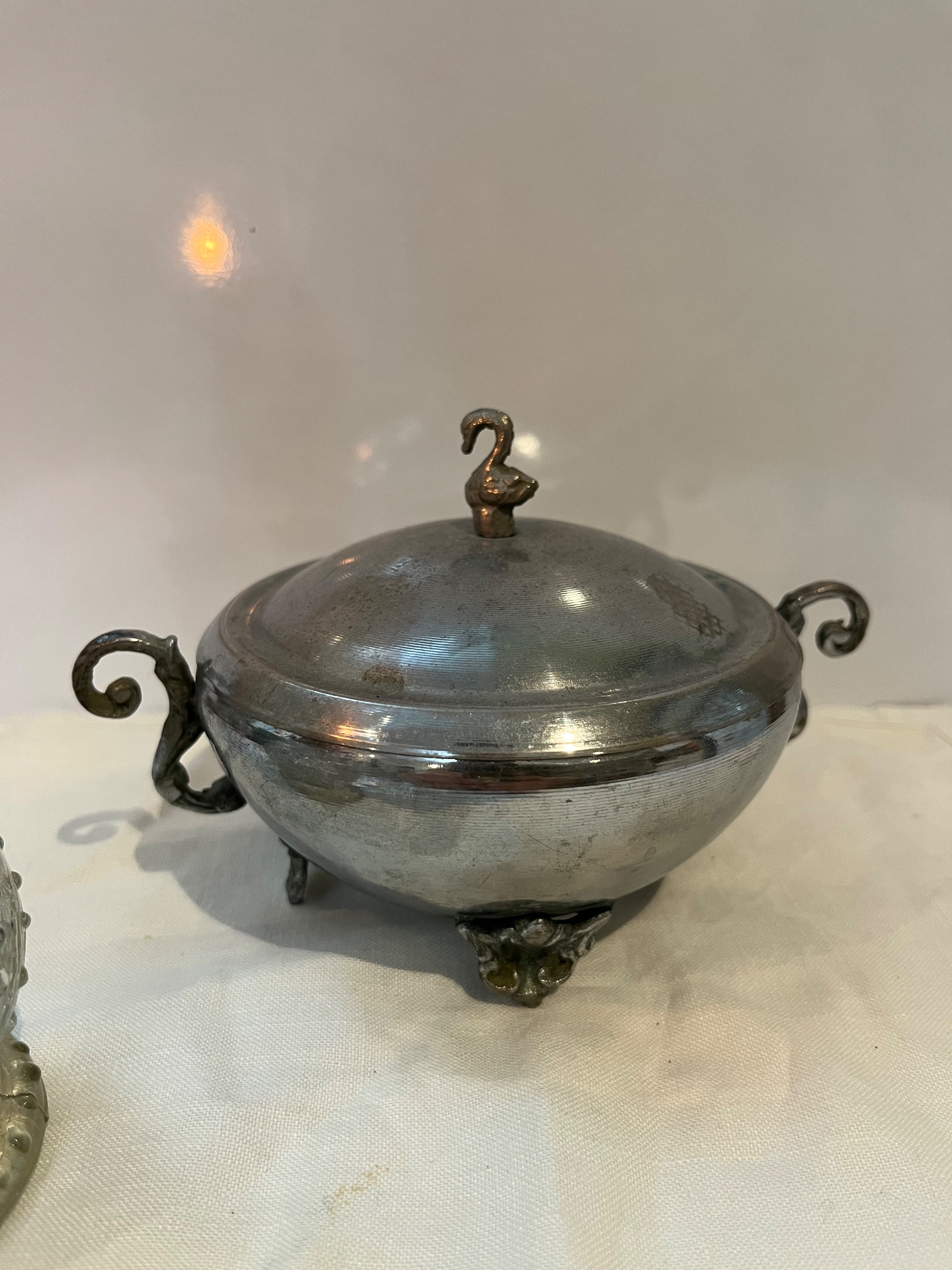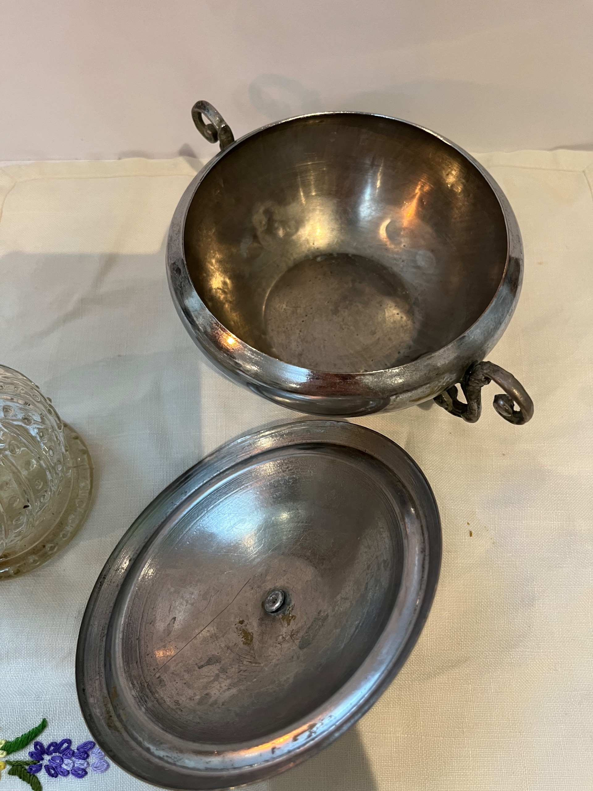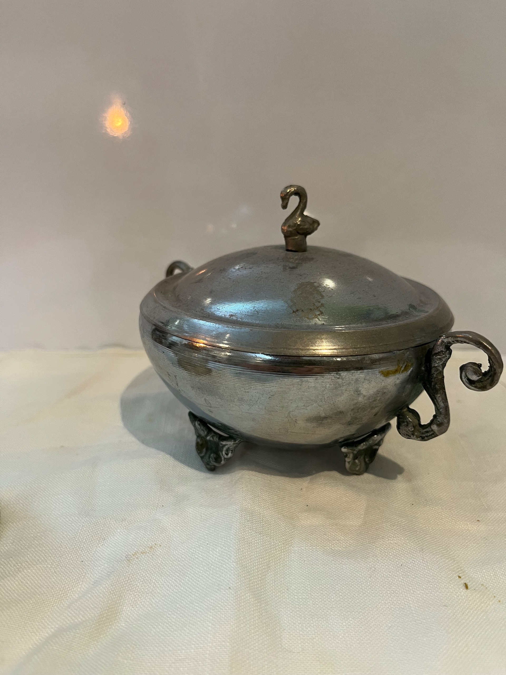 قندان بسیار قدیمی استیل با درب و پایه و دسته های کار شده.