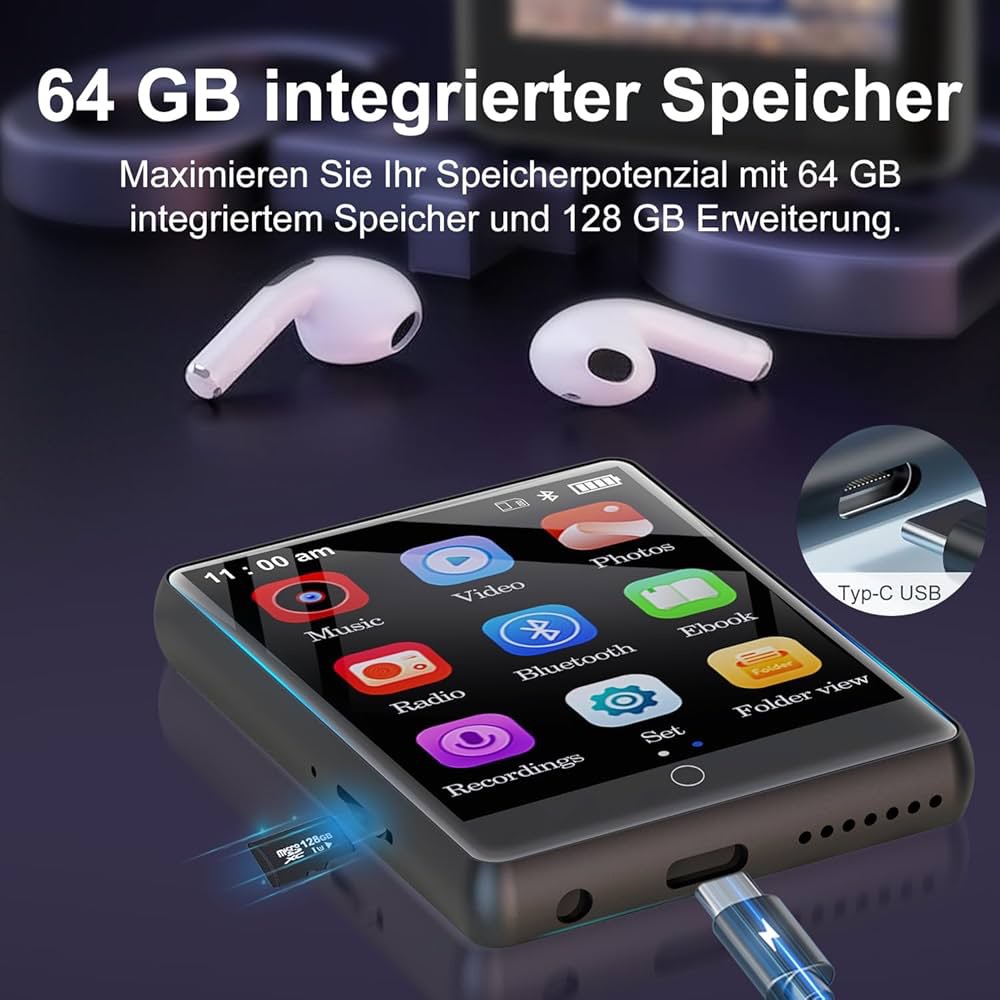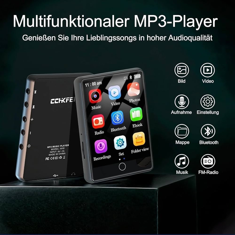 پخش کننده MP3 قابل حمل CCHKFEI با ظرفیت 64 گیگابایت، بلوتوث 5.1، صفحه نمایش لمسی 2.8 اینچی، بلندگوهای HD، صدای بدون افت کیفیت، رادیو FM، ضبط، کتاب الکترونیکی، پشتیبانی از 128 گیگابایت