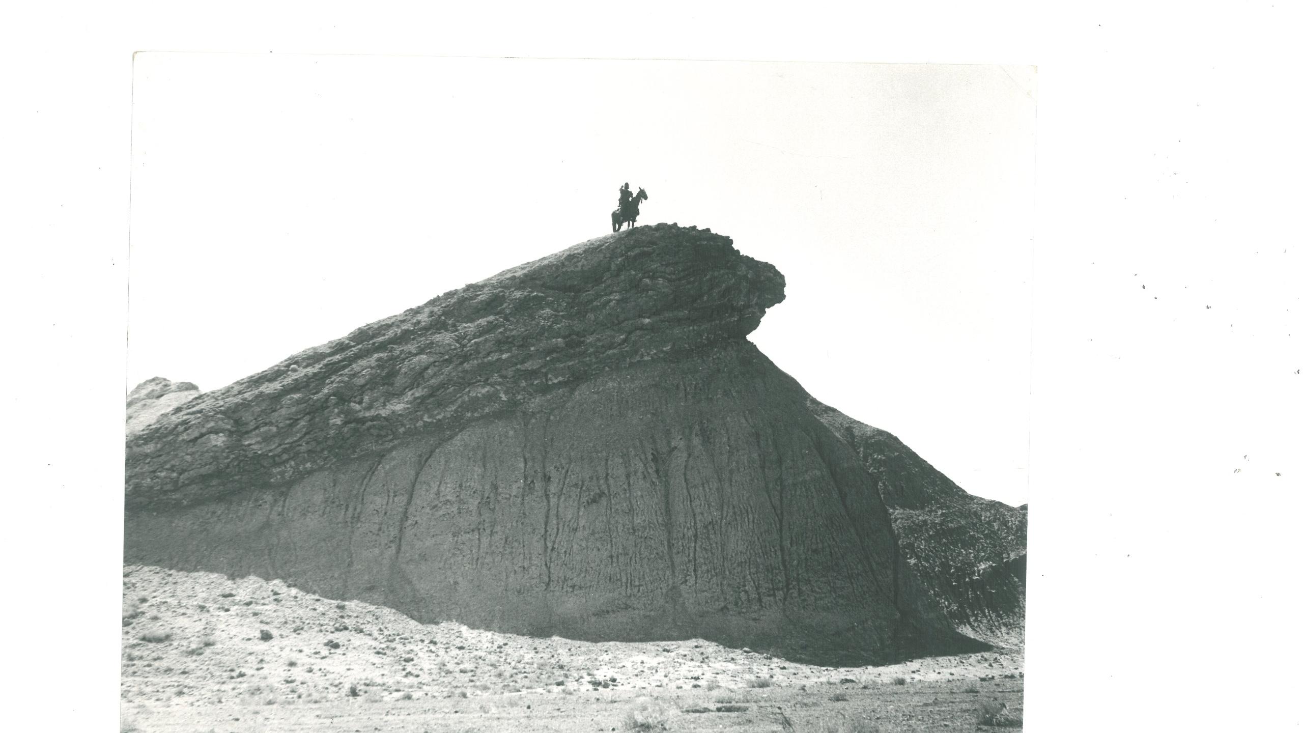 عکس سیاهوسفید اصل و قدیمی سینمایی؛ نمایی از سواری بر اسب بر فراز صخرهٔ سنگی.