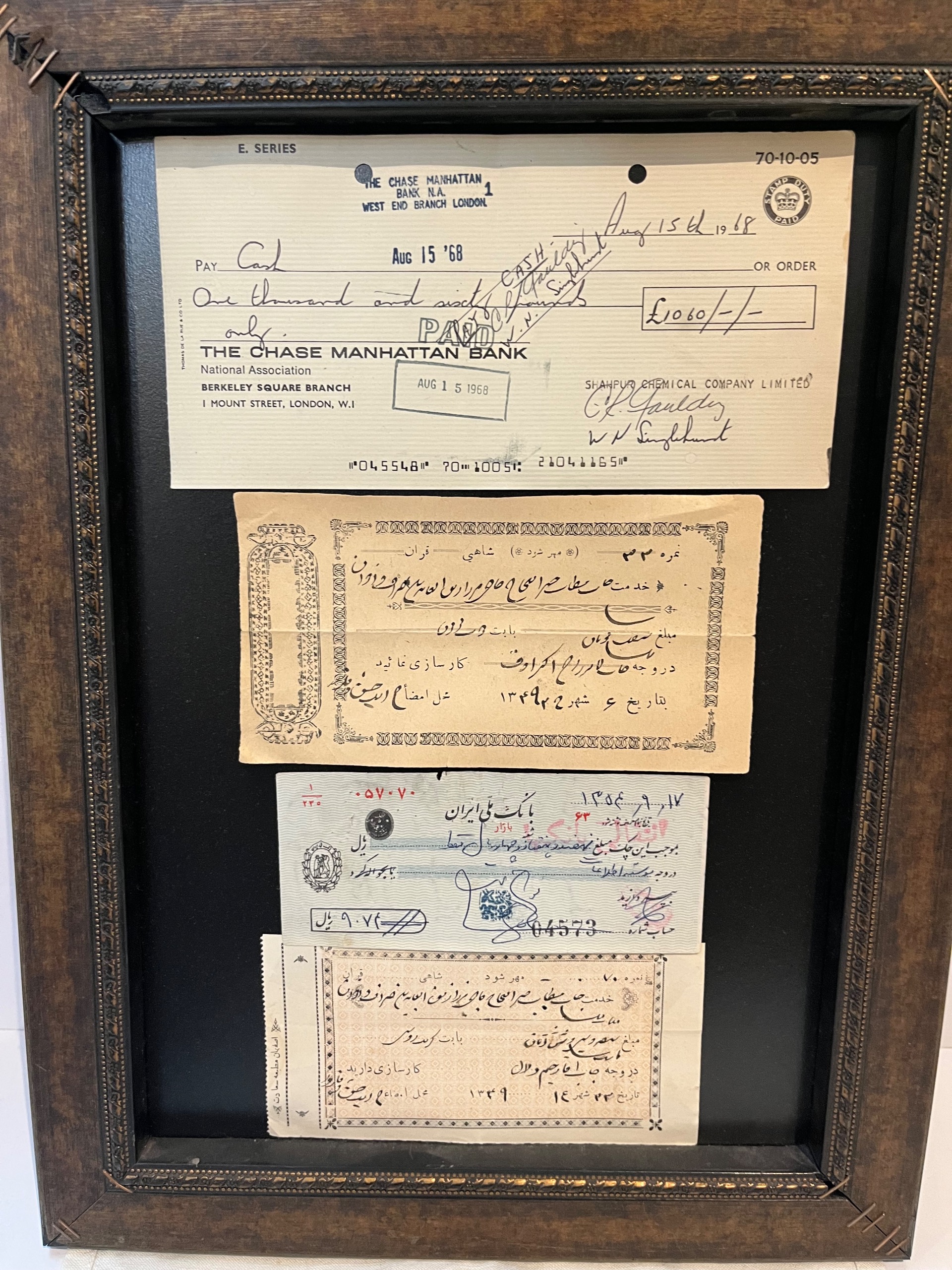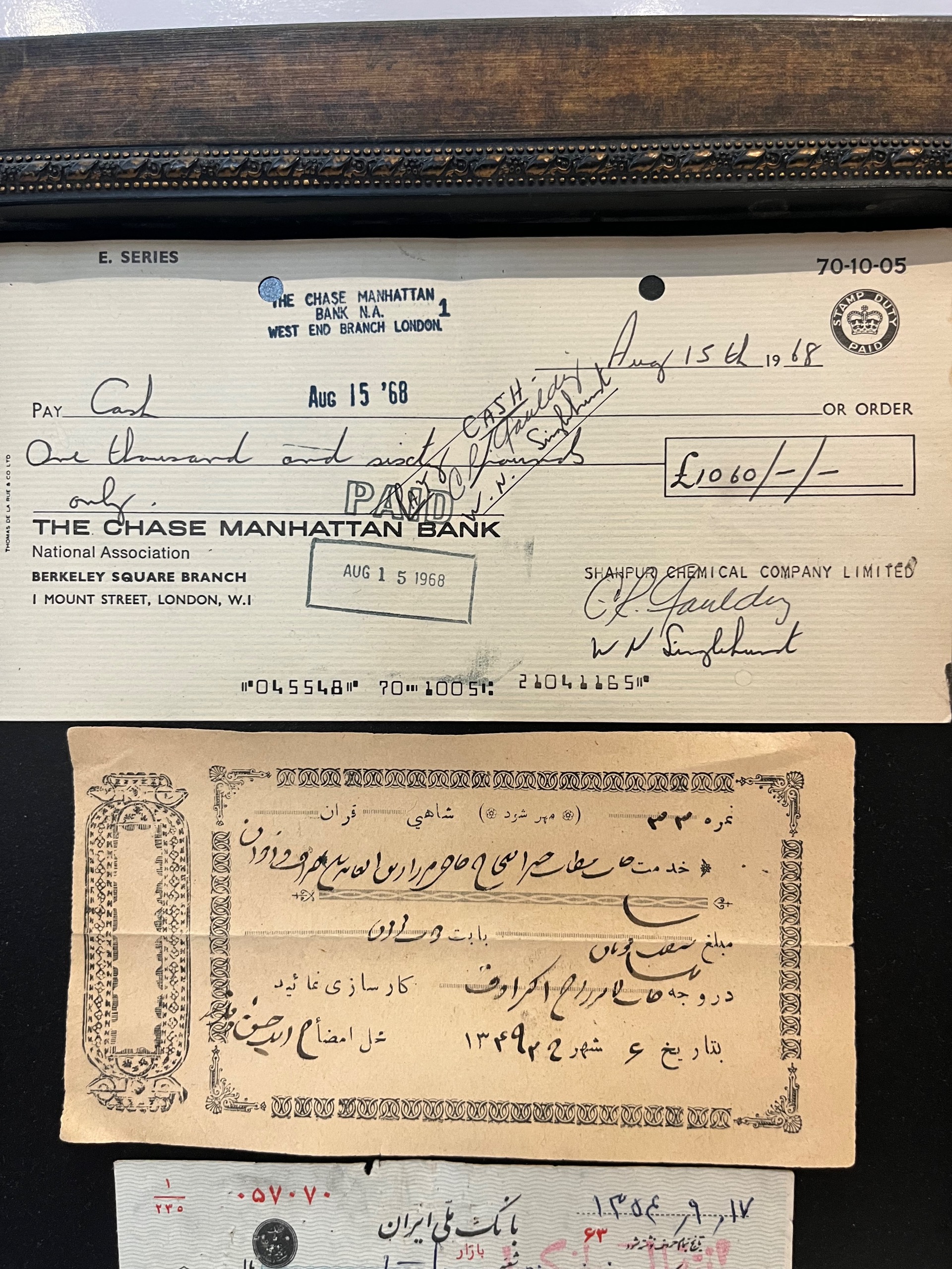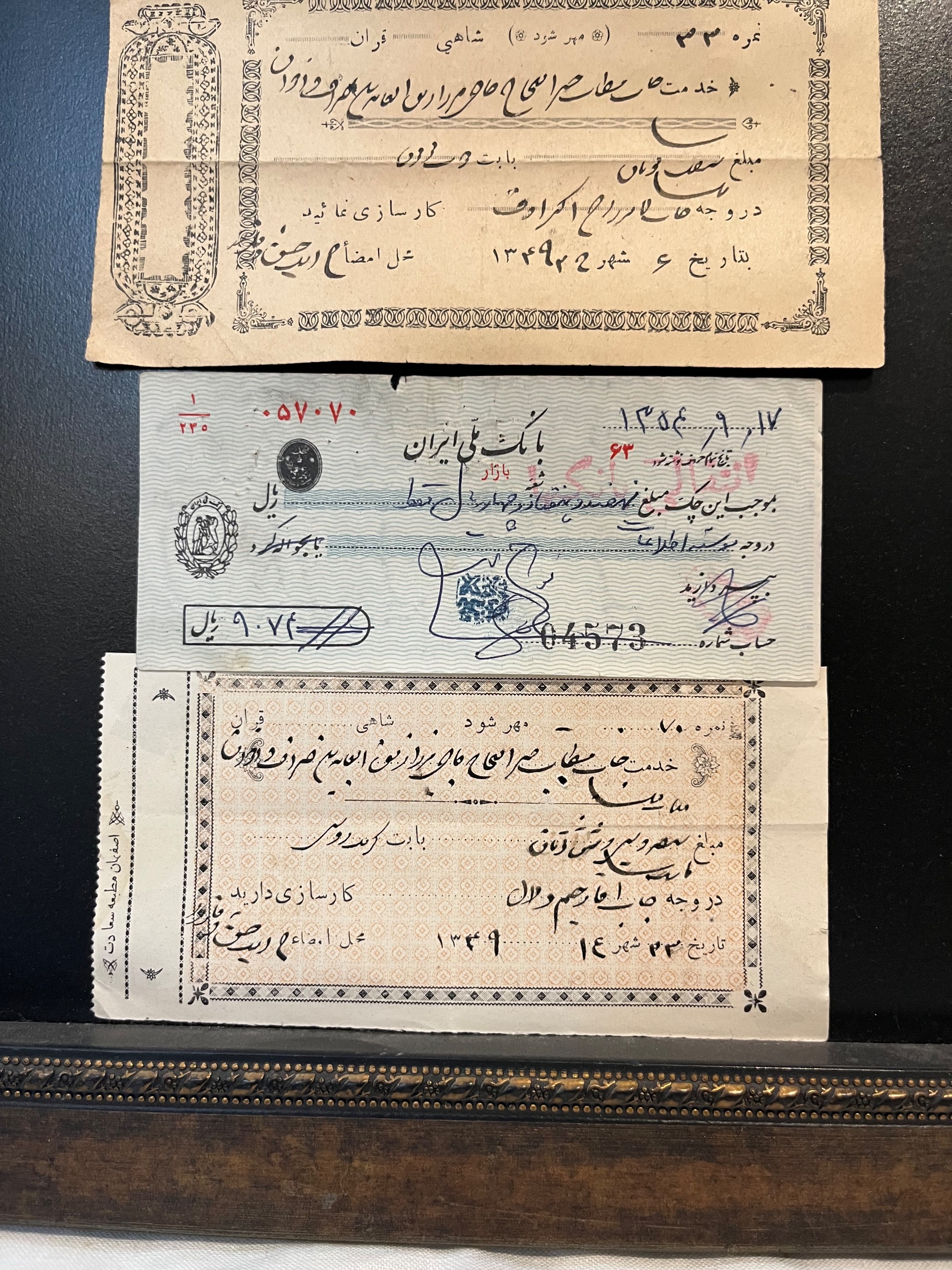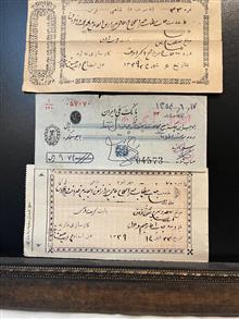 1 عدد فک می کنم چک باشه با قدمت رضاشاه بزرگ زیرا وجه را قران و شاهی زده و خط هم قاجاری هست اما تاریخ جدید ترهست در وجه اکراوف روسی به تاریخ 1349