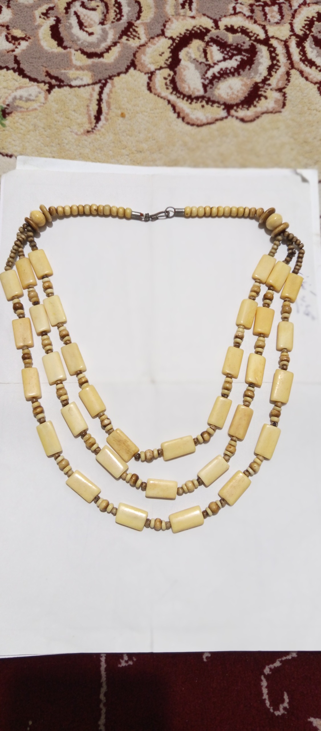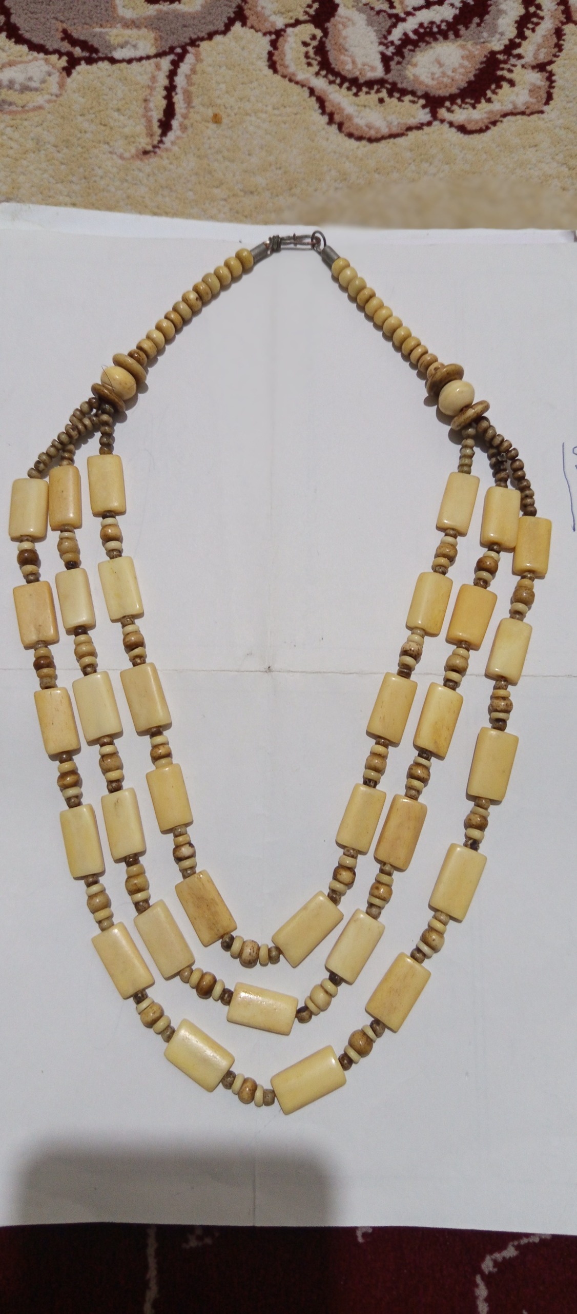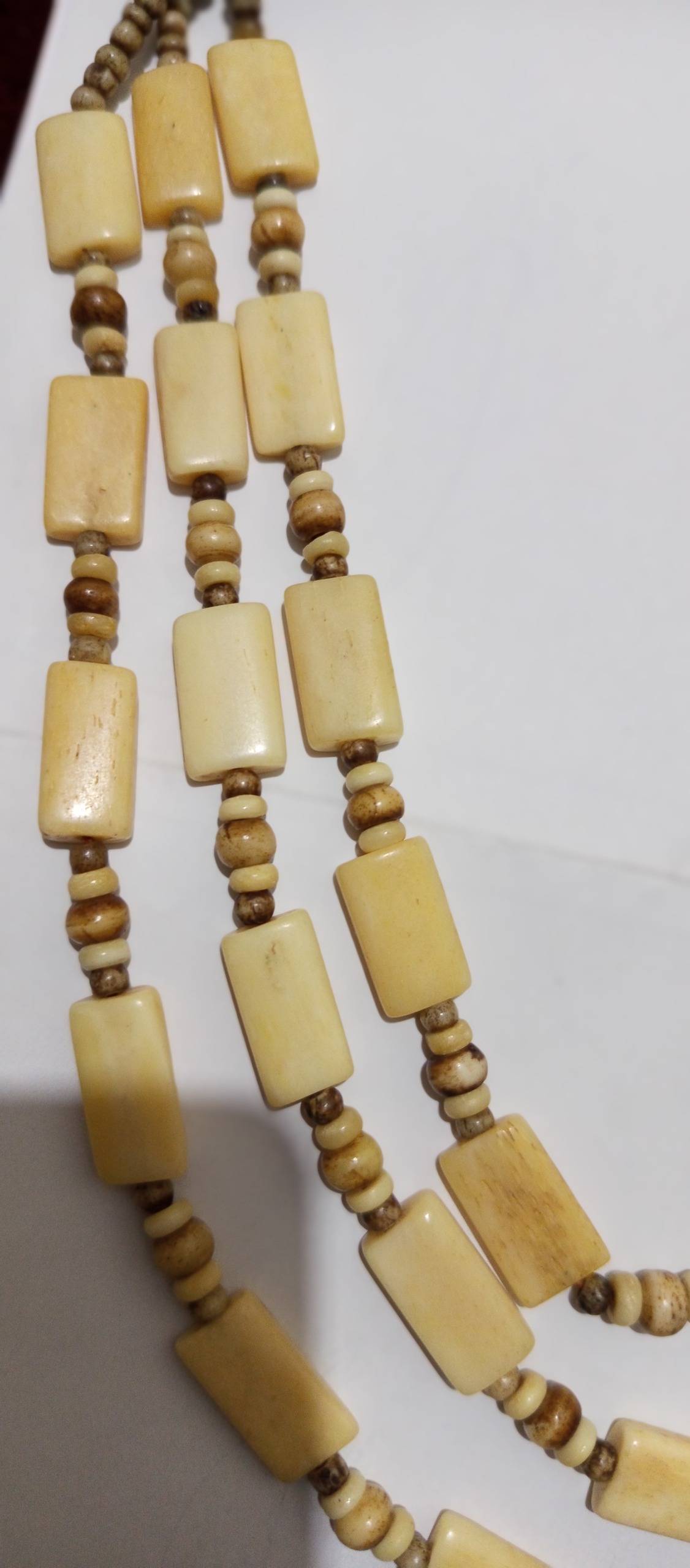 گردنبندی سهردیفه ساختهشده از عاج طبیعی فیل با قدمت حدود 30 تا 40 سال، ترکیبی از مهرههای مستطیلی براق و ریزدانههای ساچمهای که با نظم و سبکی خاص در کنار هم قرار گرفتهاند.