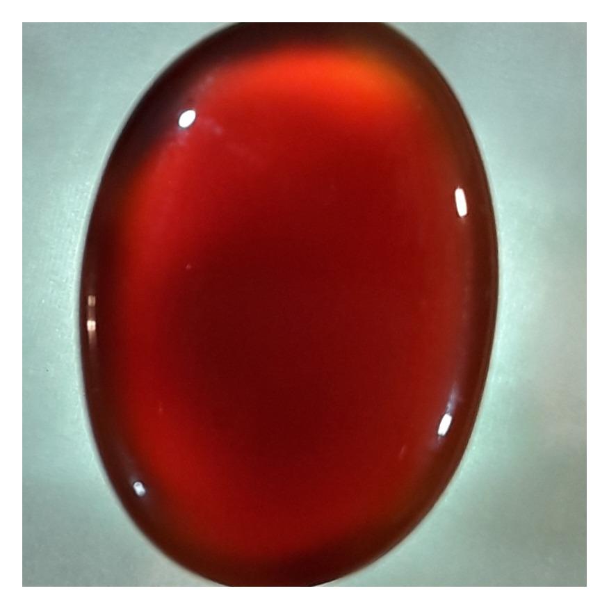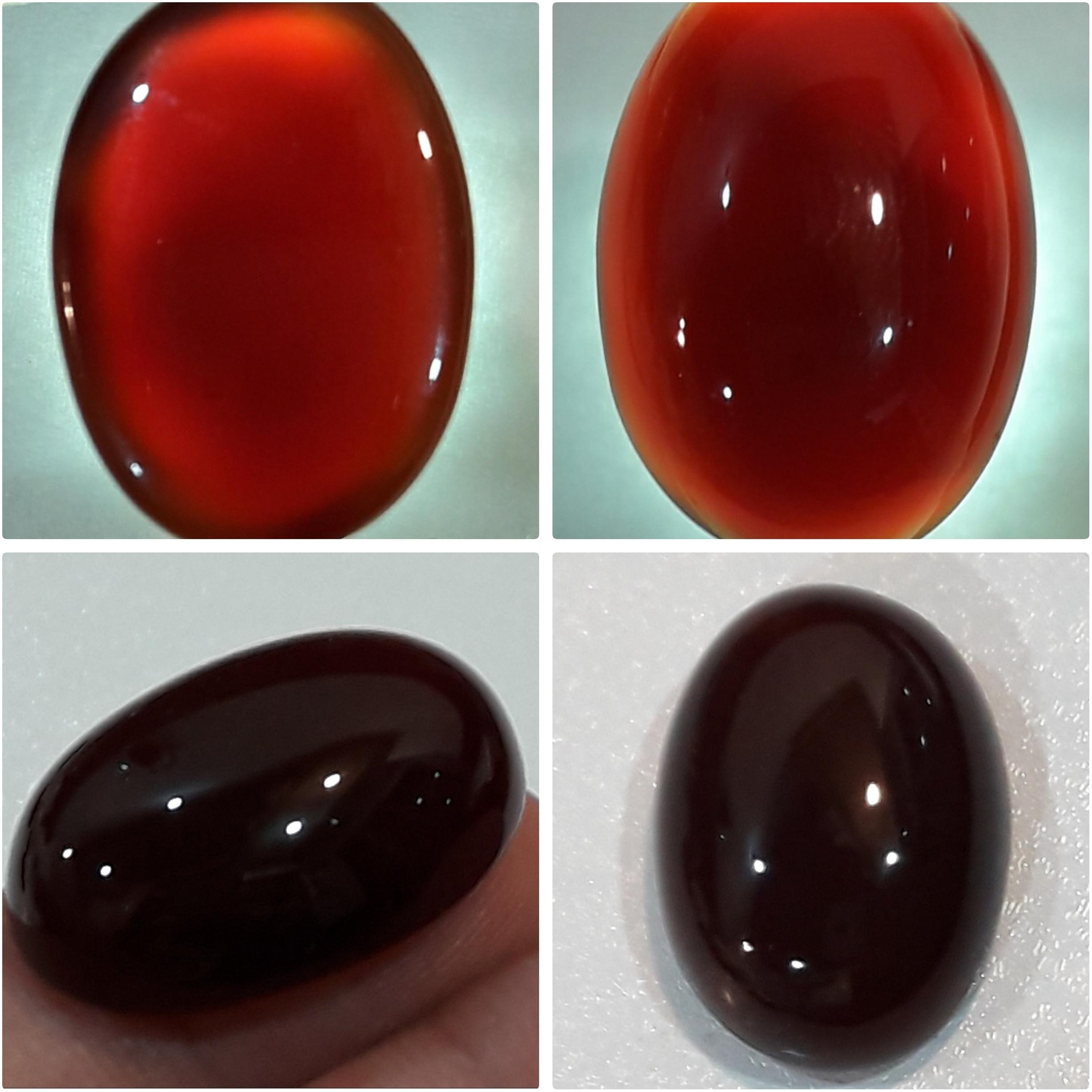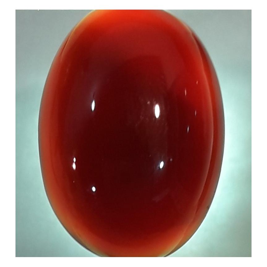 سنگ گلچین بار میباشد قواره دار (دارای اندازه و وزن مناسب) در تراش دامله دقیق و قرینه دارای جلای شیشه ای و براق و رنگ طبیعی ، رنگ یکنواخت و زنده و عمق رنگی (سنگین و تیره _ زنده و گرم ) و ویژگی اساسی و مهم و وجه تمایز عقیق کبدی از سایر انواع بطن نیمه مات قرمز تیره مایل به قهوه ای..