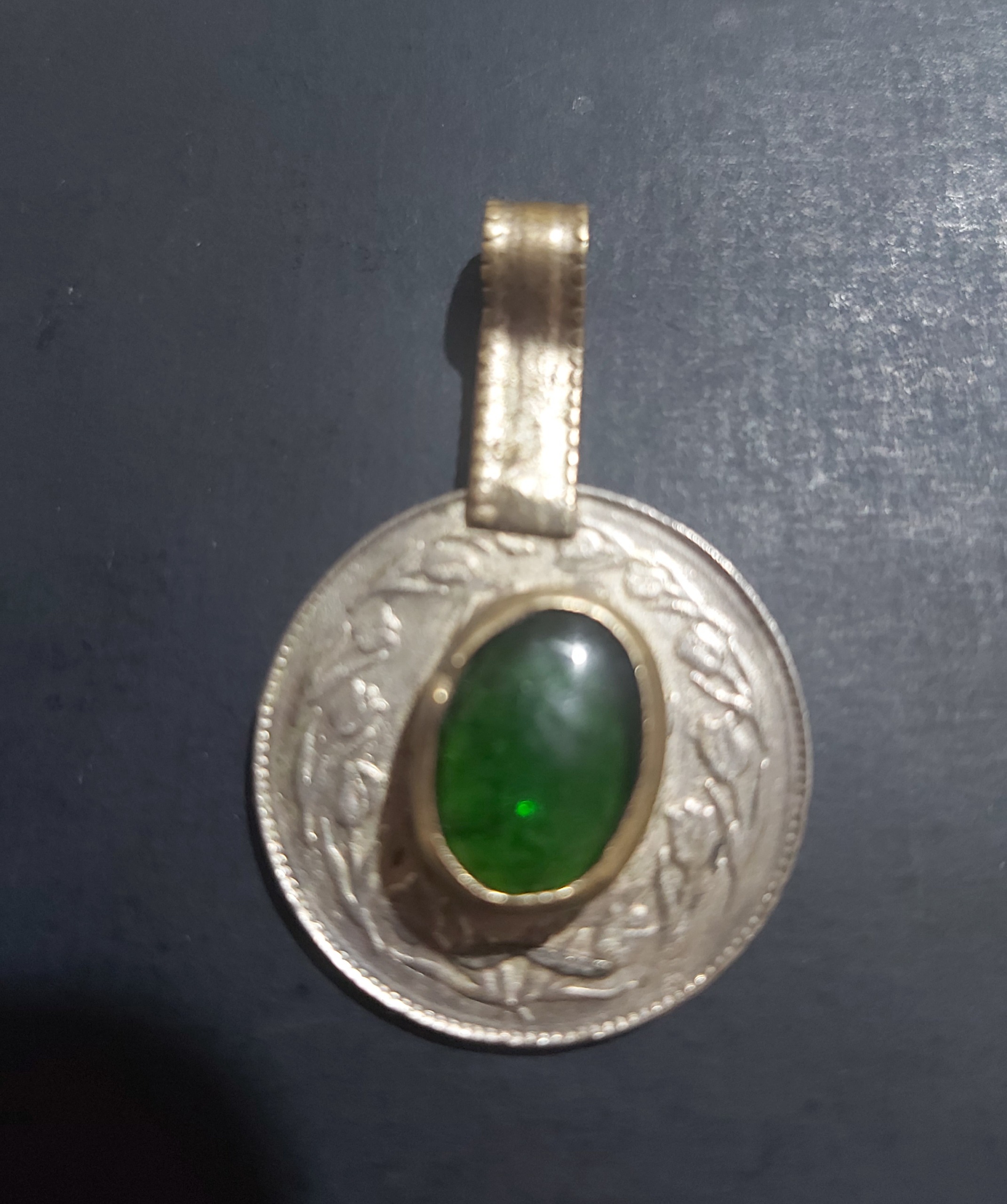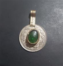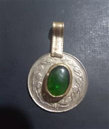 آویز گردنی بدون زنجیر.پایه و صفحه اجرا سکه 10ریال جمهوری سال1361...طرف خط سکه نگین آویز کار شده اطراف نگین و دستک گردنی.نگین مصنوعی نمیدونم جنسش چیه..و سبز رنگ.برنج ه..وزن گردن آویز 9گرم..اندازه دستک 13م م.