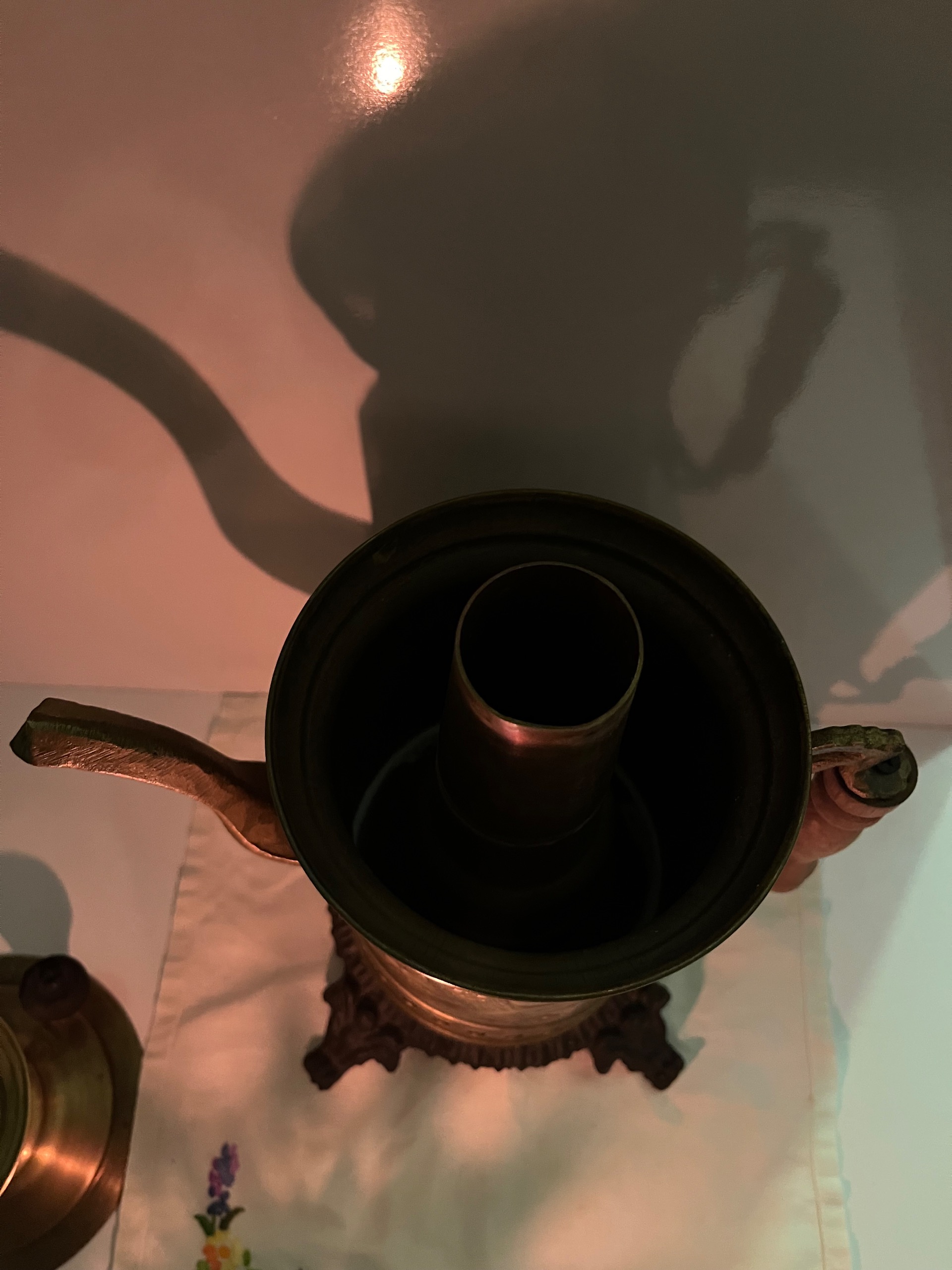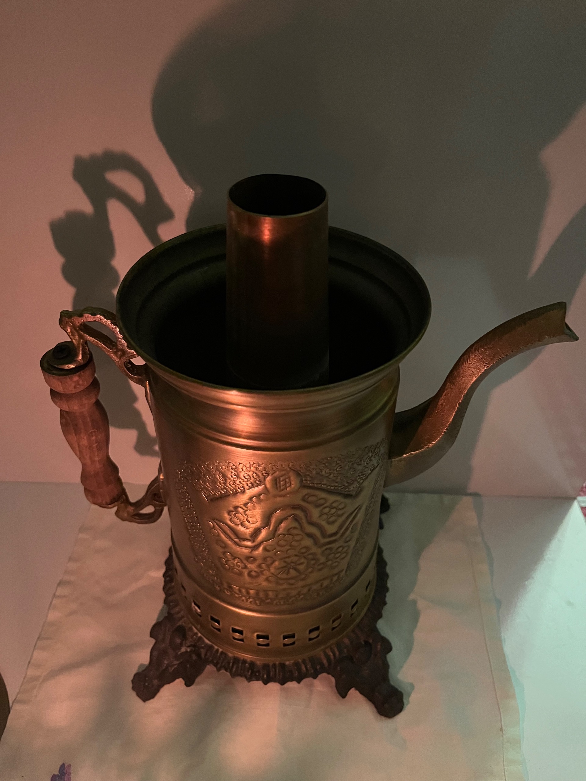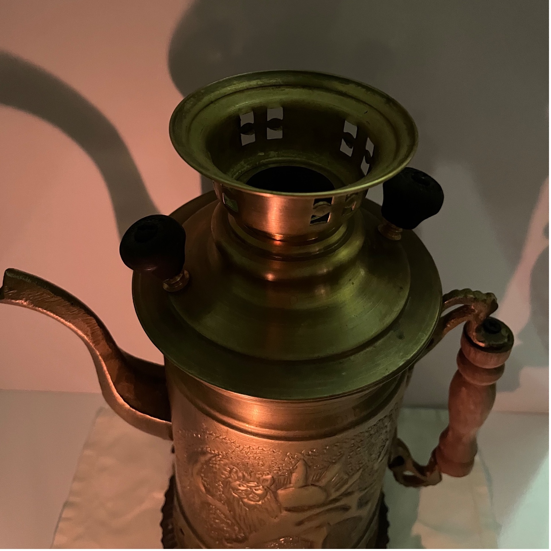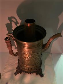 سماور زغالی برنجی سالم با پایه های چدنی. کار سنگین و جوندار و فعال با طرح های برجسته و کار شده و همچنین شیر و خورشید در یک طرف و تاج همایونی در طرف دیگر.