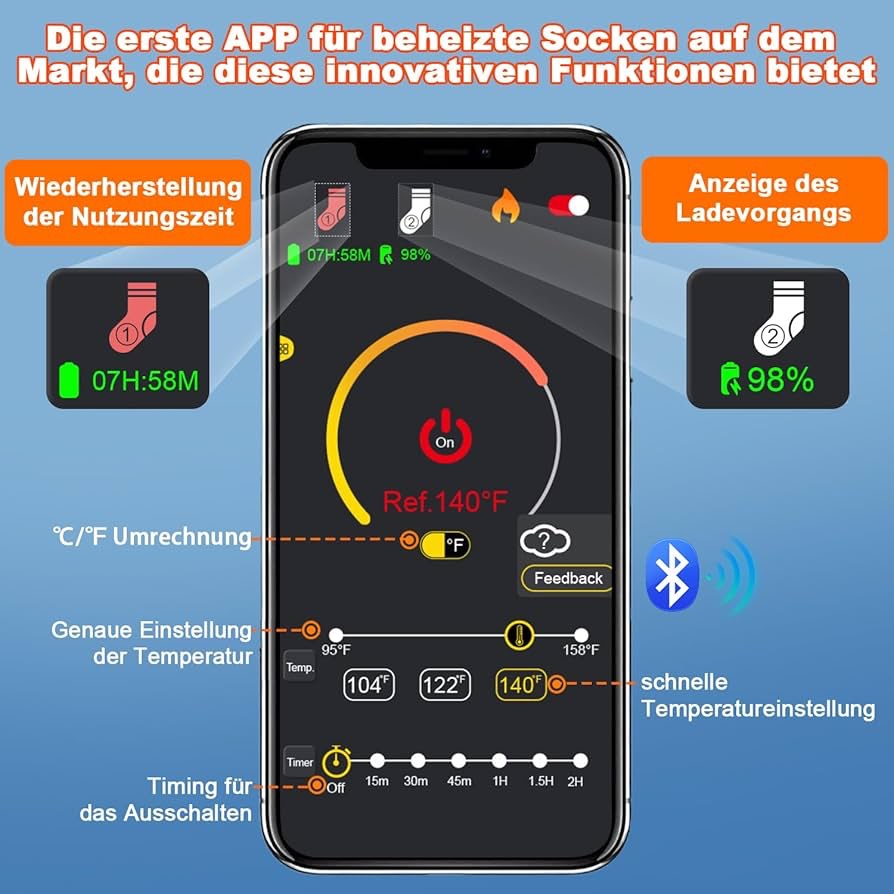 اپلیکیشن نوآورانه با نمایش زمان استفاده باقیمانده و پیشرفت شارژ: قابلیت تخمین زمان استفاده باقیمانده و نمایش وضعیت شارژ که به تازگی اضافه شده است، میتواند وضعیت جورابهای گرم شده را به وضوح نمایش دهد و شما را برای ماجراجوییهایتان آماده کند. دمای جورابهای گرم کننده را میتوان از طریق اپلیکیشن روی هر دمایی بین 35 درجه سانتیگراد / 95 درجه فارنهایت و 70 درجه سانتیگراد / 158 درجه فارنهایت تنظیم کرد. جورابهای گرم کننده همچنین میتوانند به طور خودکار با تایمر خاموش شوند. توجه: زمان استفاده باقیمانده بسته به محیط و وضعیت باتری به صورت پویا تغییر میکند.