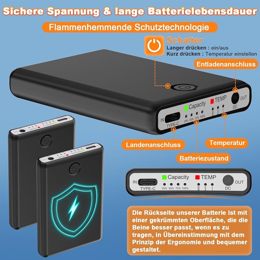 فناوری انحصاری گرم کردن انگشتان پا و ناحیه گرمایش حلقوی 360 درجه: سیم گرمایش 34 اینچی بلندتر، یک ناحیه گرمایش 360 درجهای ایجاد میکند که مجهز به مواد هدایت حرارتی بهتر و جورابهای ضخیمتر است، به طوری که گرما به طور کامل در کل پای شما حتی تا انگشتان پا پیچیده میشود و از اتلاف گرما جلوگیری میکند. این جورابهای گرم کننده را میتوان با دست یا ماشین لباسشویی با کیسه لباسشویی شست. توجه: لطفاً قبل از شستشو، باتری را از جورابها خارج کنید. باتری قابل شارژ 6000 میلیآمپر ساعتی و 9 ساعت کارکرد: جورابهای گرمایشی قابل شارژ مجهز به یک باتری لیتیوم-یونی با ظرفیت بالای 6000 میلیآمپر ساعتی هستند که تا 5 تا 9 ساعت گرمایش را پشتیبانی میکند. طراحی سبک و نازک باعث میشود باتری کاملاً در جورابها جا شود. میتوانید به راحتی با دکمههای کناری بزرگ روی باتری، حتی بدون تلفن همراه، دما را روشن/خاموش یا تنظیم کنید. نشانگرهای انرژی و دما را پاک کنید. وضعیت باتری را نیز بدانید. معمولاً 3.5 تا 5 ساعت طول میکشد تا باتری به طور کامل شارژ شود.