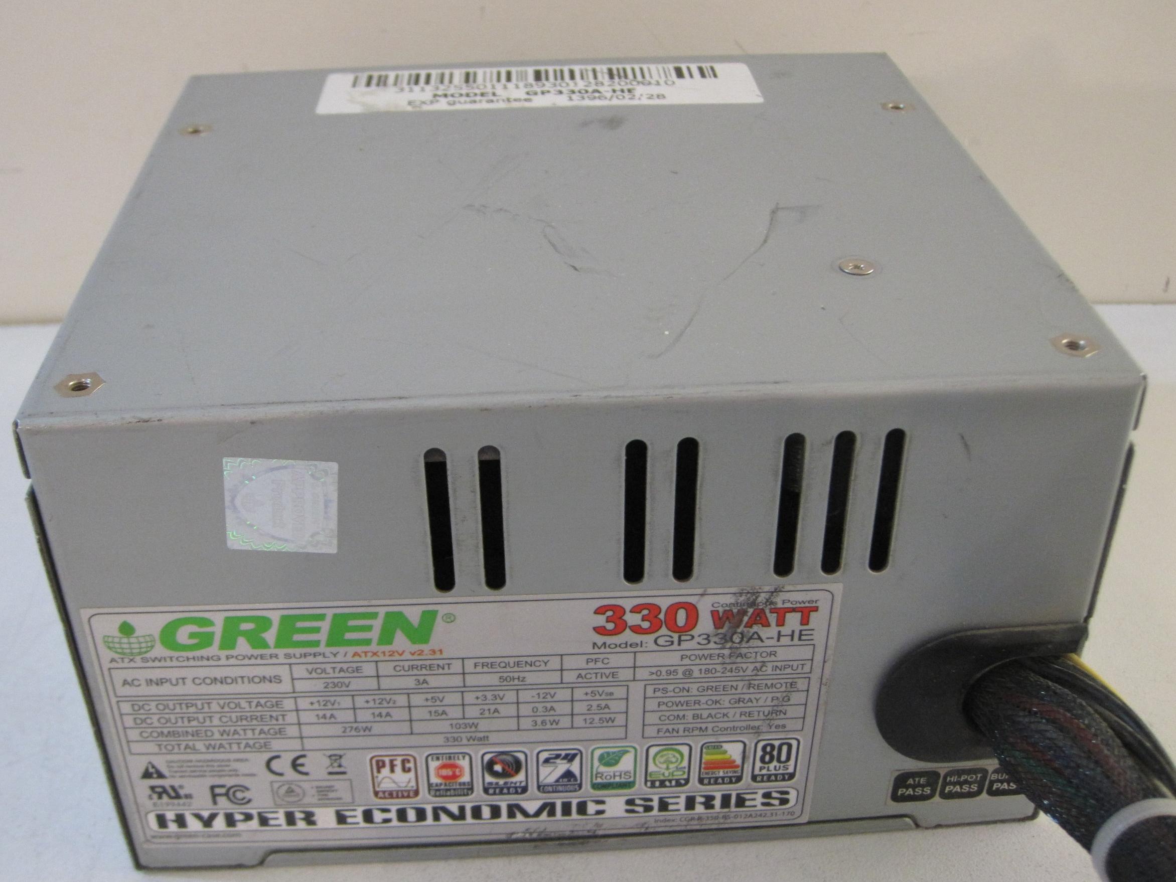 کالا یکعدد پاور 330 وات واقعی از برند گرین مدل GREEN GP330A-HE میباشد، سوکت برق مادربرد 24 پین و سه عدد ساتا و دو عدد چهار پین مادربرد دارد.