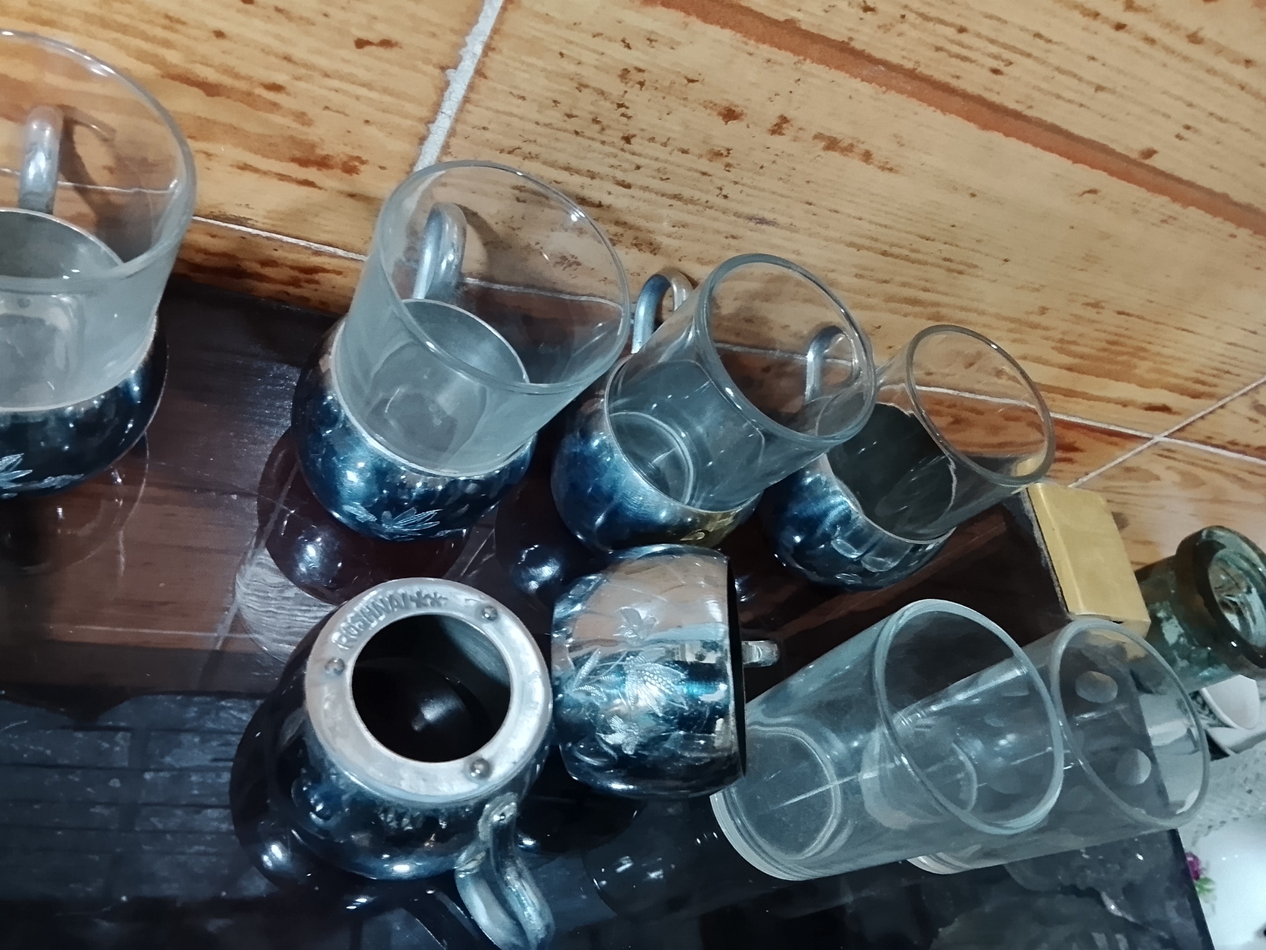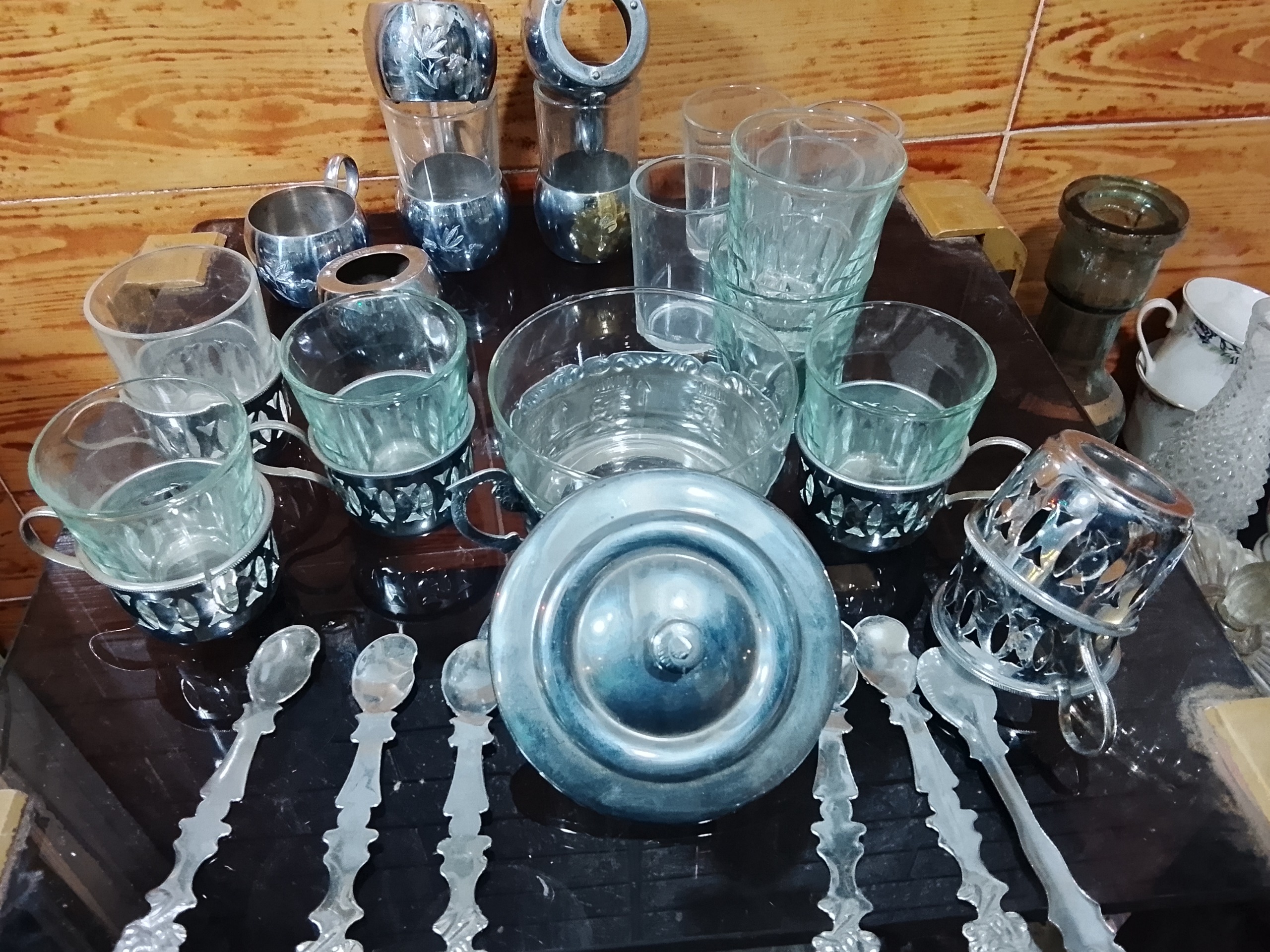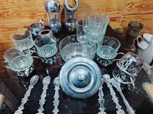 تعداد 2دست (12پارچه) سرویس چای خوری قدیمی شامل 12عدداستکان که قدیمی و آنتیک هستند به همراه پایه های برنجی (انگاره)که 6عدد بسیار تمیز و ضخیم و مارک دار میباشند و 6عدد دیگر هم قدیمی و برنجی و6عددقاشق برنجی و یک عدد قندان برنجی که جمعا 33پارچه می شوند هم کلکسیونی و آنتیک هستند و همچنین قابل استفاده هستند استکان ها هم قدیمی و فرانسوی هستند