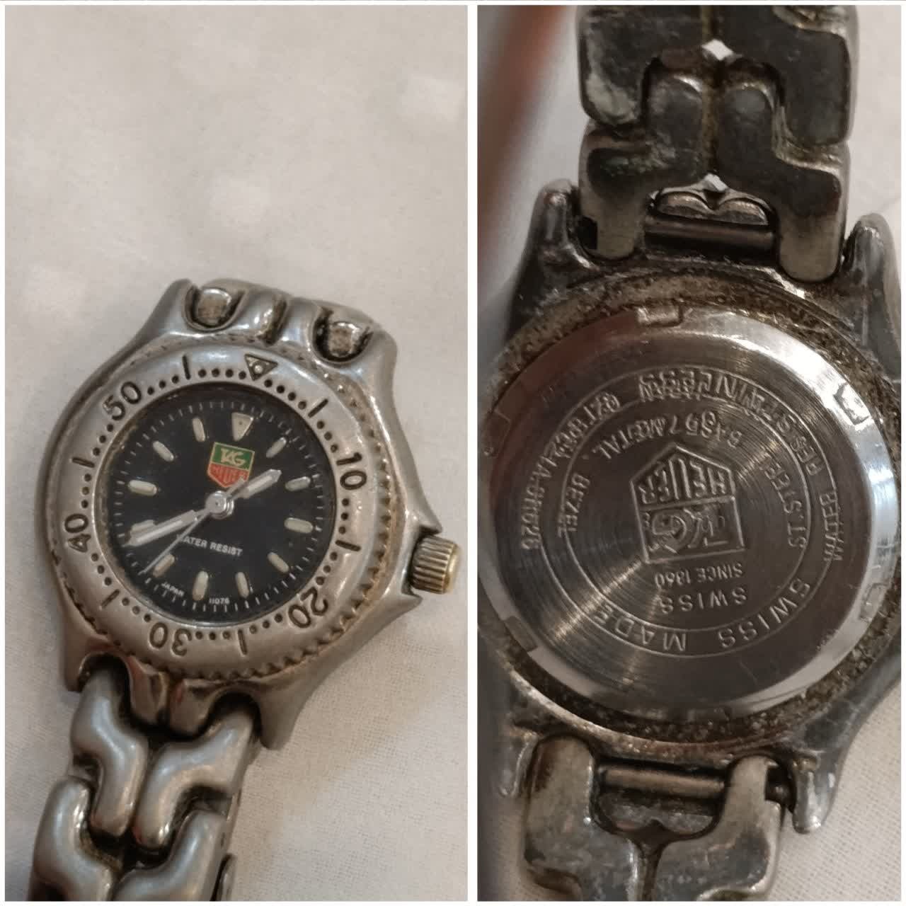 ساعت سوئیسی تگ هویر موتور ژاپن زه چرخان دستبند کهنه شده و باید پولیش بشه باتری نداره خاص و انتیک