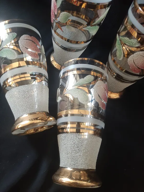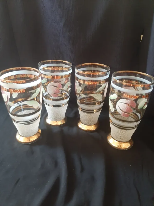 یک عدد لیوان اب طلا برفی و نقاشی با آب طلا کار چک ارتفاعد 15 قطر 7 سالم دست دوم رنگ رفتگی یا خط روی قسمت طلایی در بعضی قسمتها با دقت دیده میشود فقط  برای یک عدد مانده