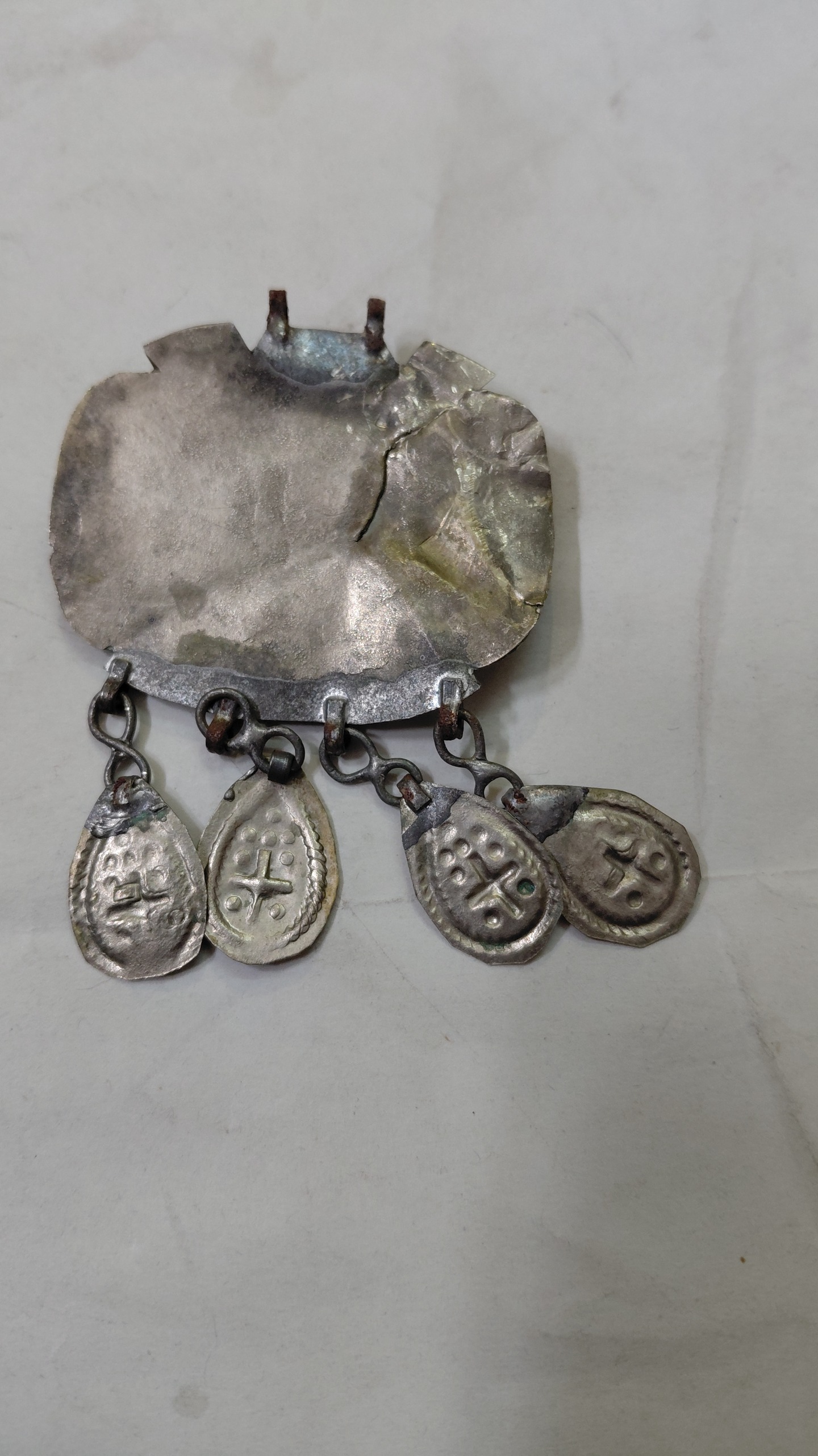 پلاک گردنبند ورشو قدیمی متعلق به دوره پهلوی اول ازگوشه پاره شده تو عکس مشخص هست و روی کار 3تا نگین شیشه معمولی قرمز کار شده مخصوص گردنی یا روی لباس بوده 5سانت طولش هست.