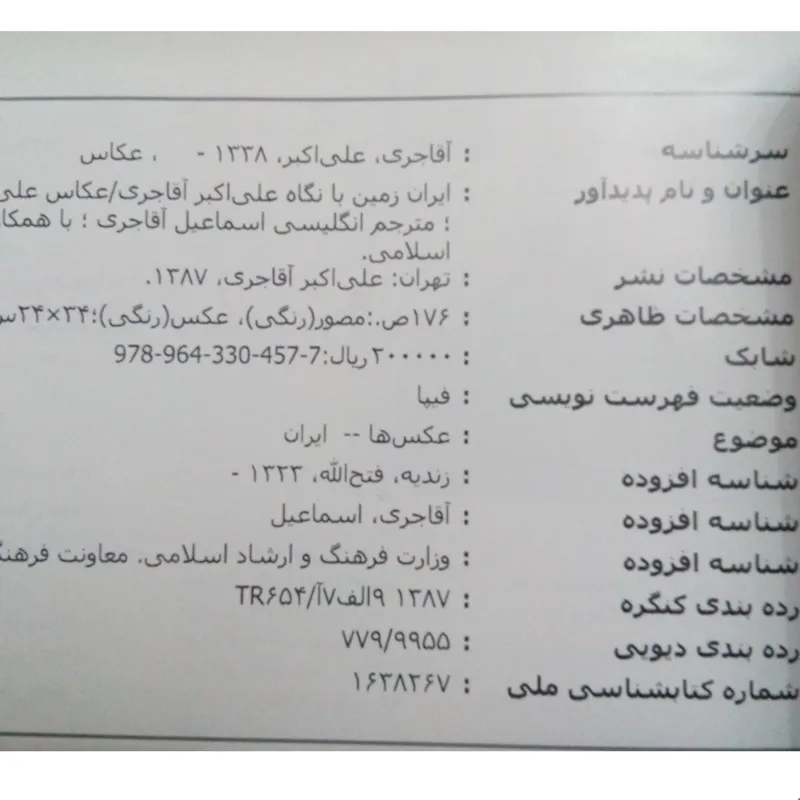 کتاب مصور رنگی ایران زمین در 176 صفحه مصور بدون اب خوردگی و کیفیت مطابق تصویر بوده و تمام صفحه ها موجود هست وچون کتاب کارکرده و دست دوم هست افرادی که حساس به کیفیت عالی و نو بودن کتاب دارند مورد پسند آنها نخواهد بود. ولی کتاب در کل کتاب خوبی بوده ودر وضعیت متوسط هست و بنده بعنوان دست دوم خدمت علاقمندان کتابهای مصور تقدیم میکنم تا انشاالله مقبول طرفداران این قبیل کتابها قرار گیرد تمام صفحات مربوط به اثار باستانی و زیبایی های طبیعی استانهای کشور میباشد و بعلت کلکسیونی بودن و هزینه های بسته بندی و ایاب و ذهاب مرجوعی به هیچ عنوان نداریم لطفا قبل از خرید سوال داشتید بفرمائید. تشکر فراوان از دوستان عزیز