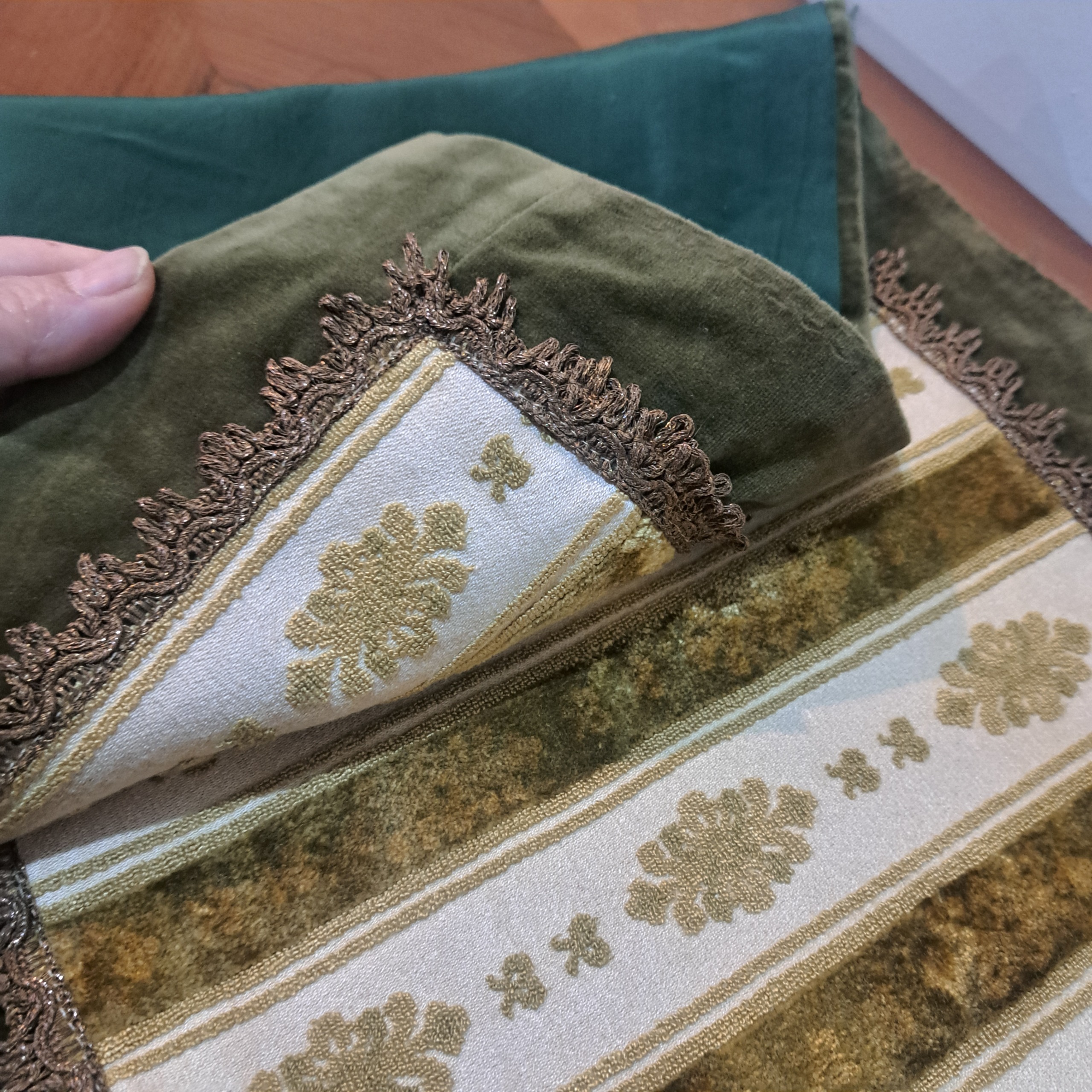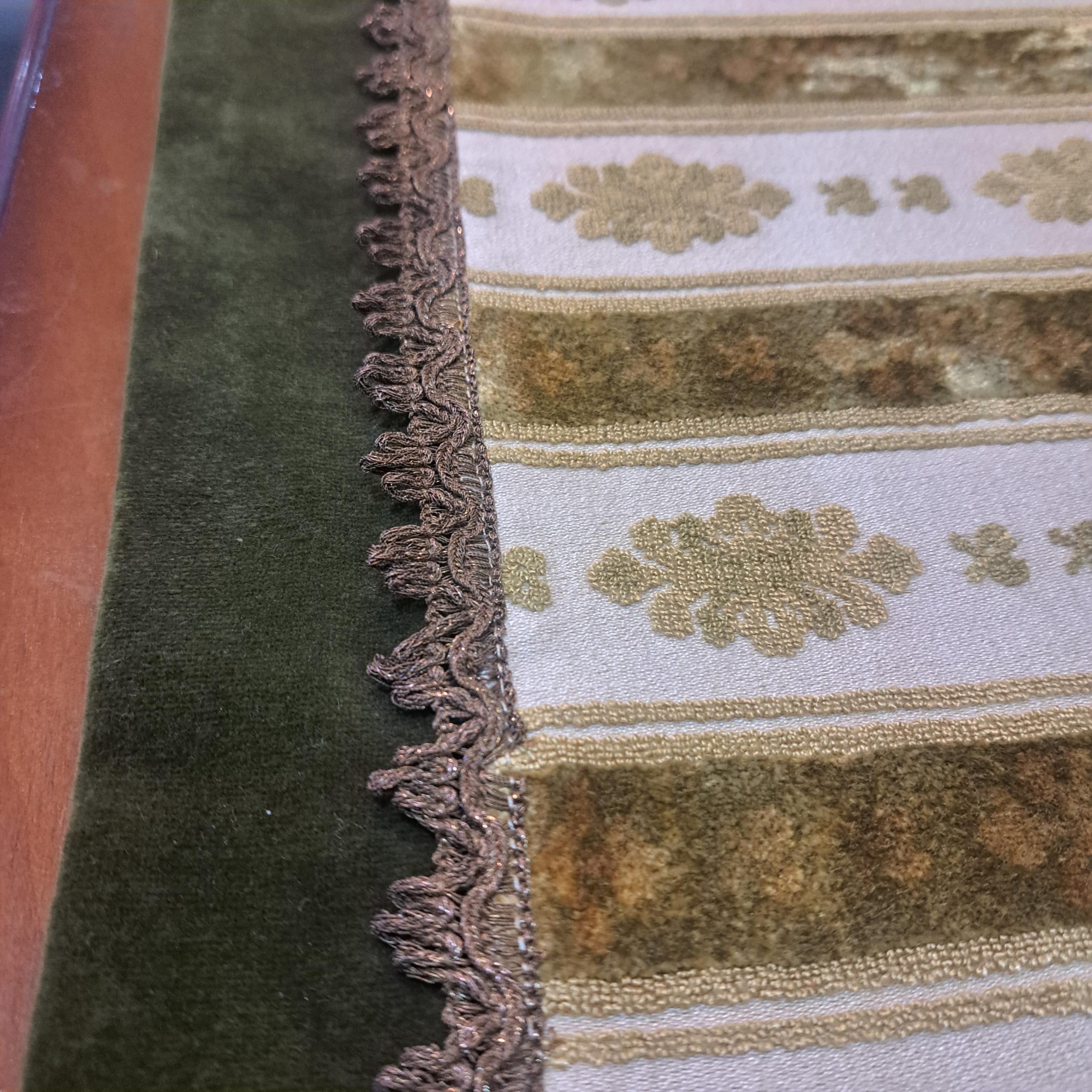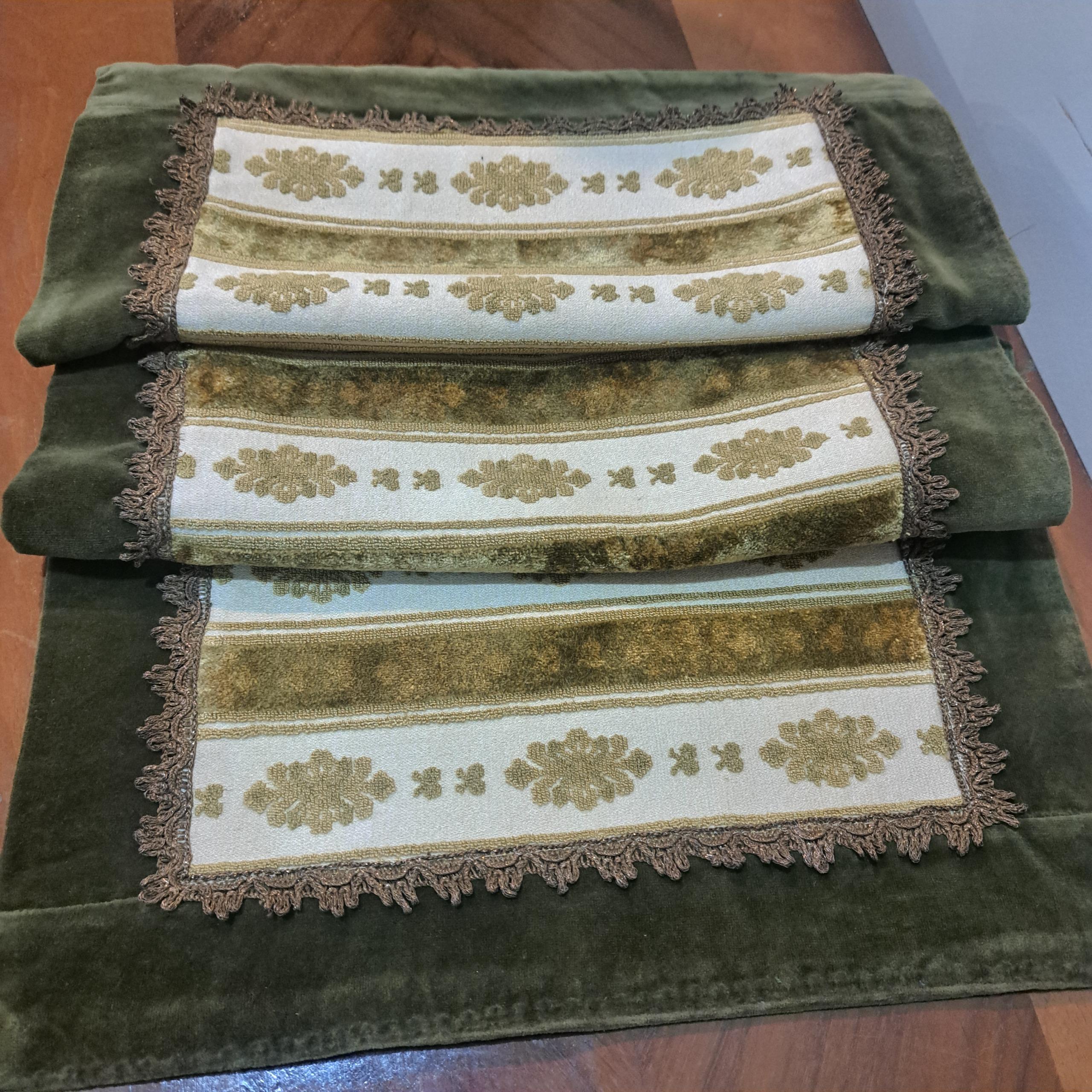 رومیزی یا رانر مخمل فاخر سایز بزرگ قدیمی ترکیب مخمل برجسته بلژیکی و ساده سبز یشمی با یراق سیمی آنتیک و قدیمی