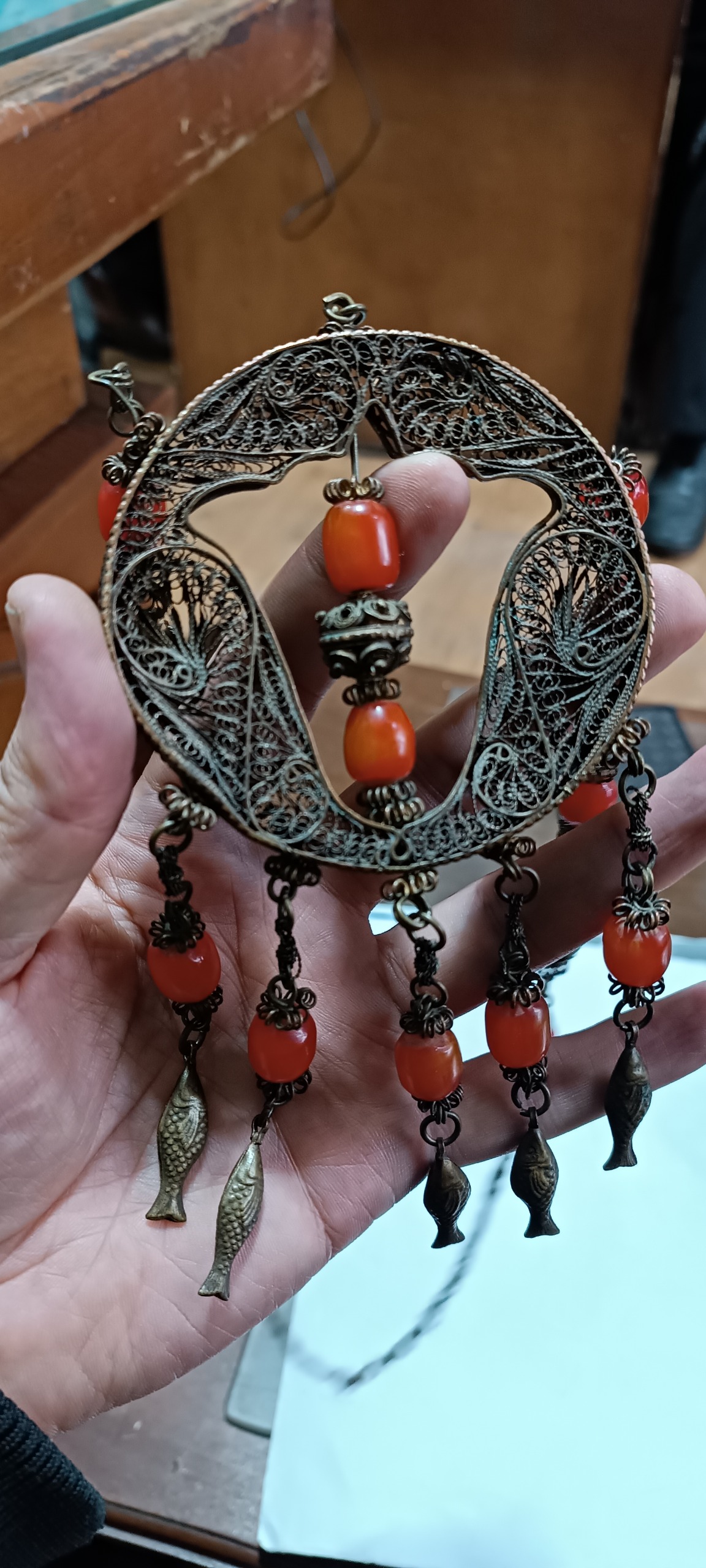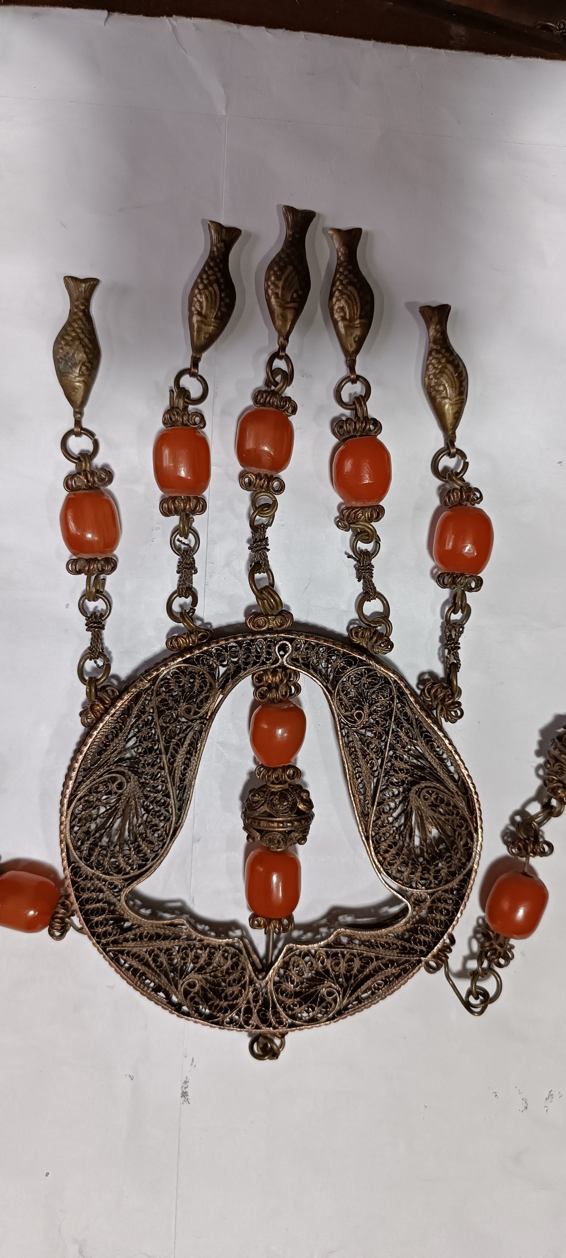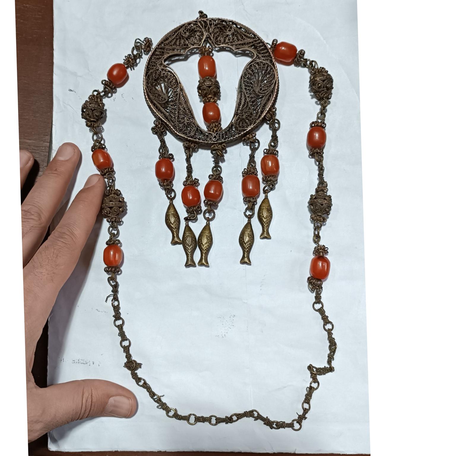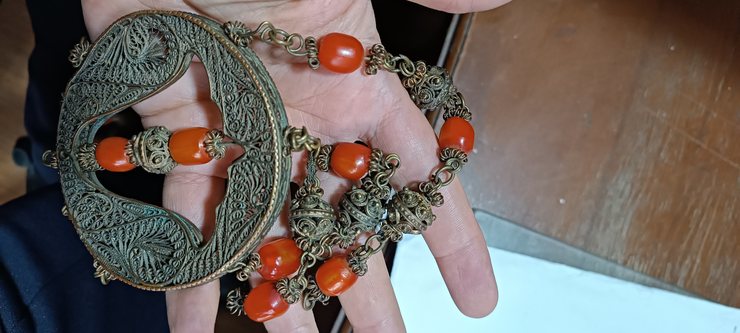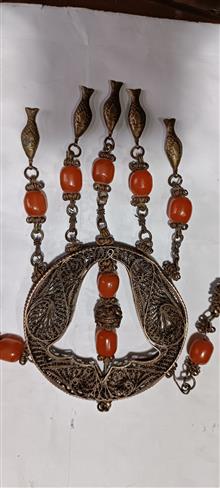 سنگ ها کهربا قدیمی پایه مسی ملیله ولی احتمالا کم عیار باشه بالای 120 سال قدمت
