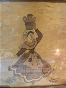 نقش کاراز روی هم قرار دادن تیکه های چوب طرح دار تشکیل شده و طرح نهایی بانو کوزه به دست را تشکیل میدهد.