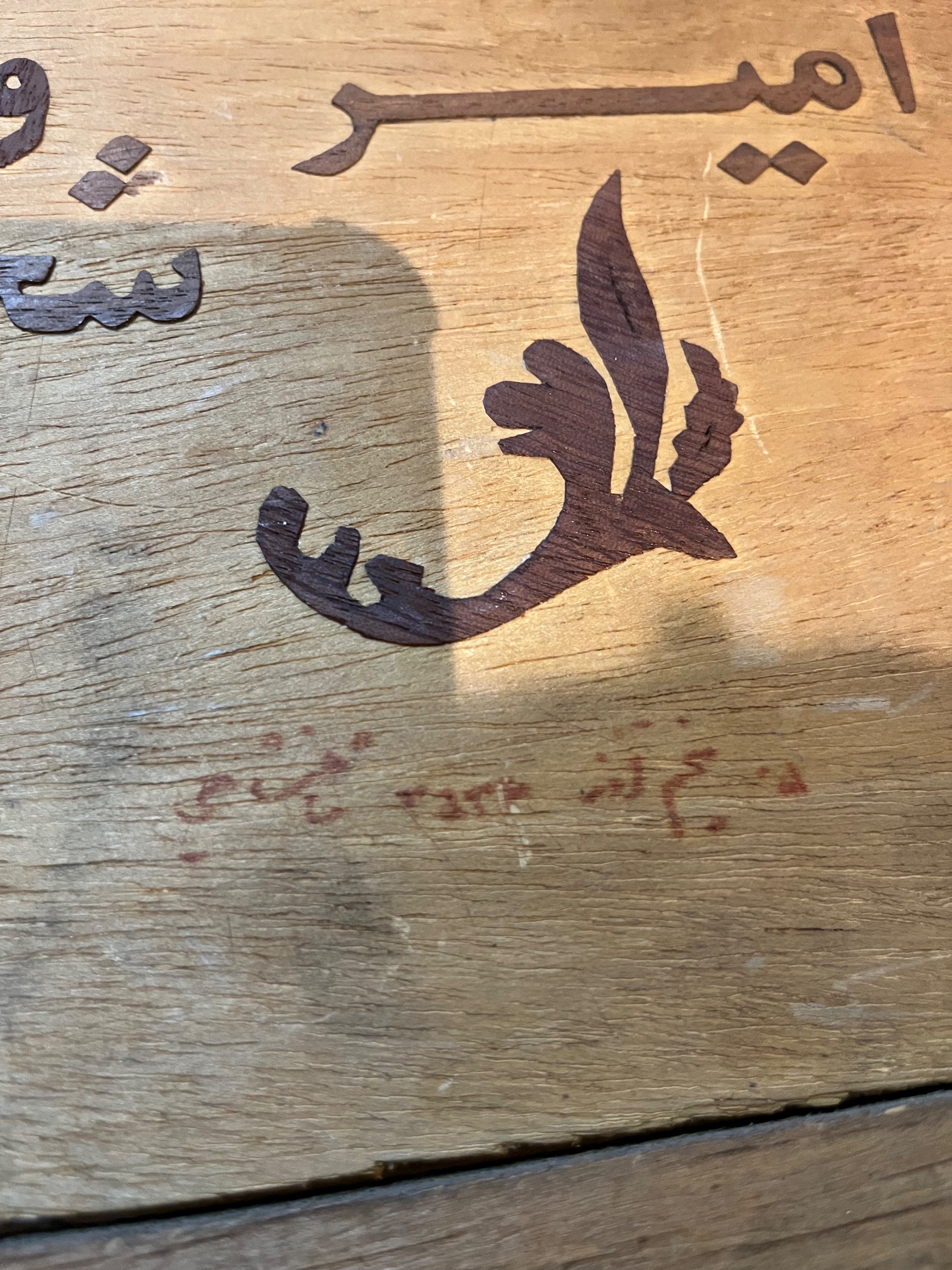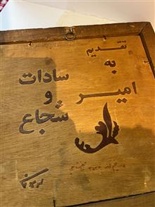 پشت کار هم با چوب متن تقدیم به امیر سادات و شجاع با همان هنر قرار دادن تکه های چوب کنار هم نوشته شده و پایین کارهم تاریخ پنجم اذر 2536 خورده است. اطلاعات کامل داخل عکس ها
