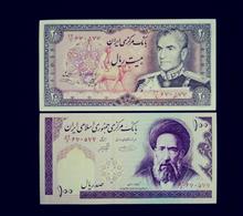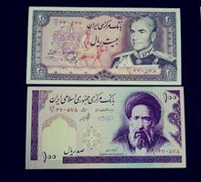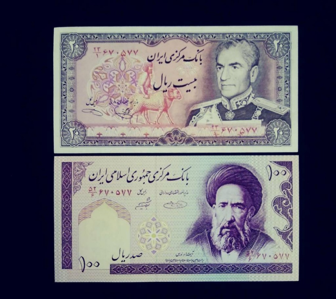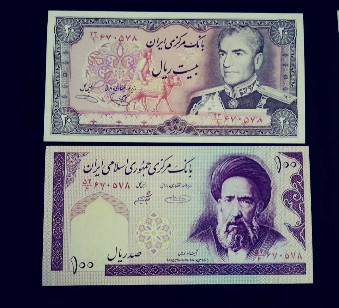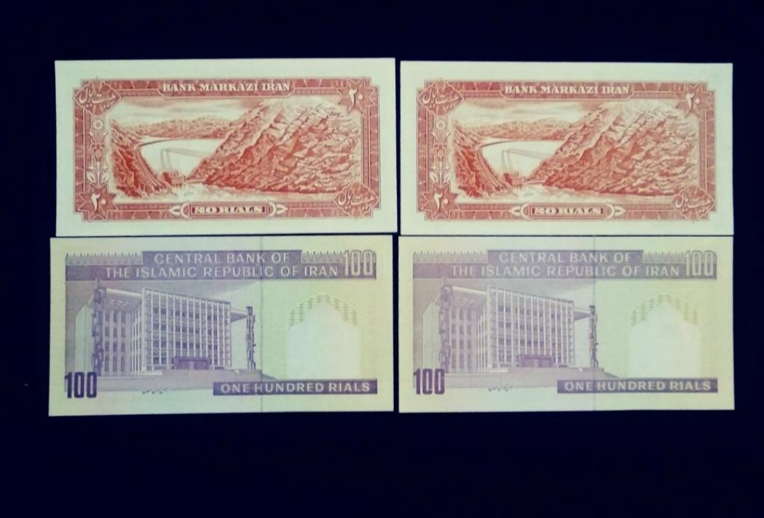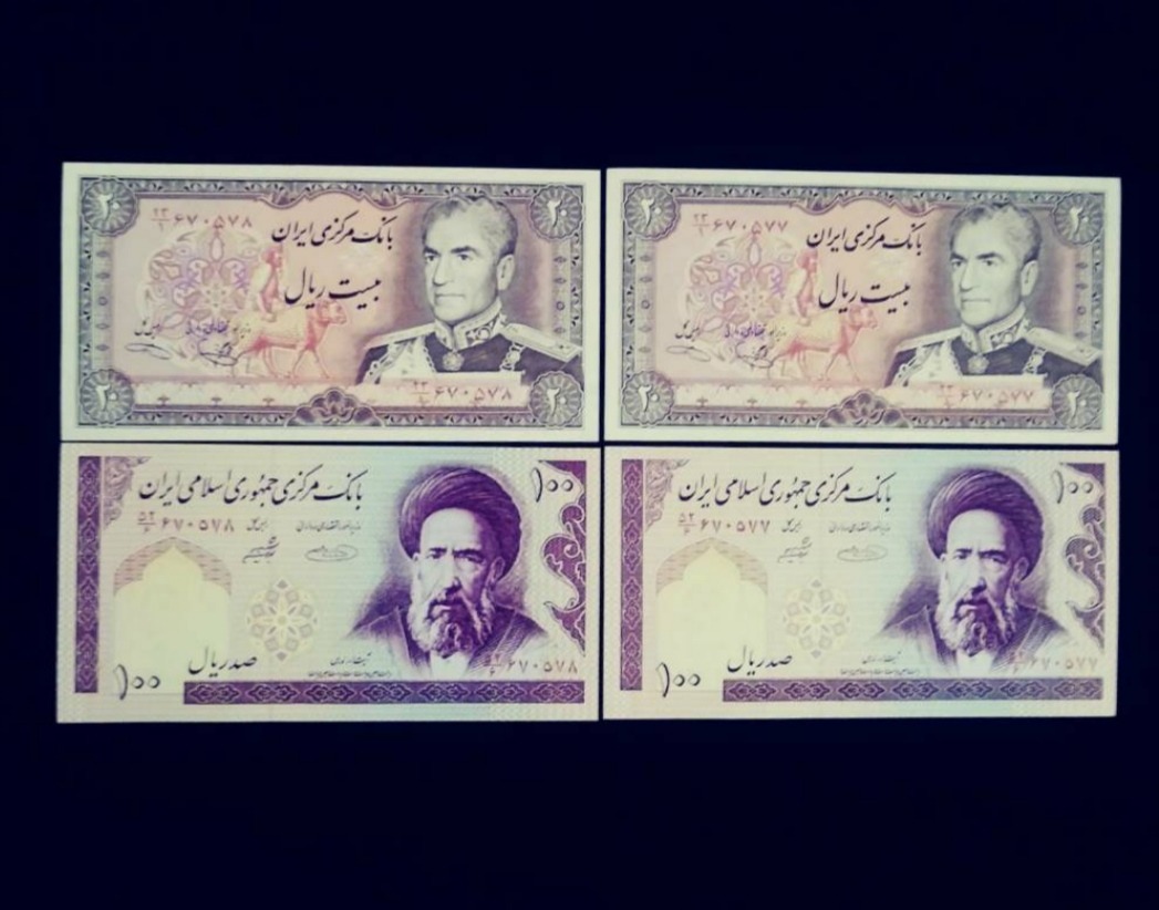 جفت اسکناس بیست ریال پهلوی و جفت اسکناس ده ریال جمهوری با شماره های یکسان