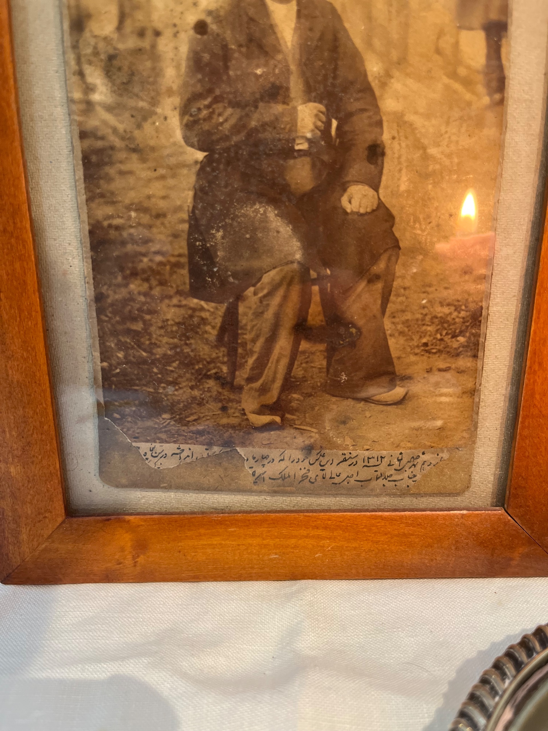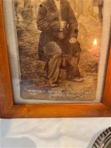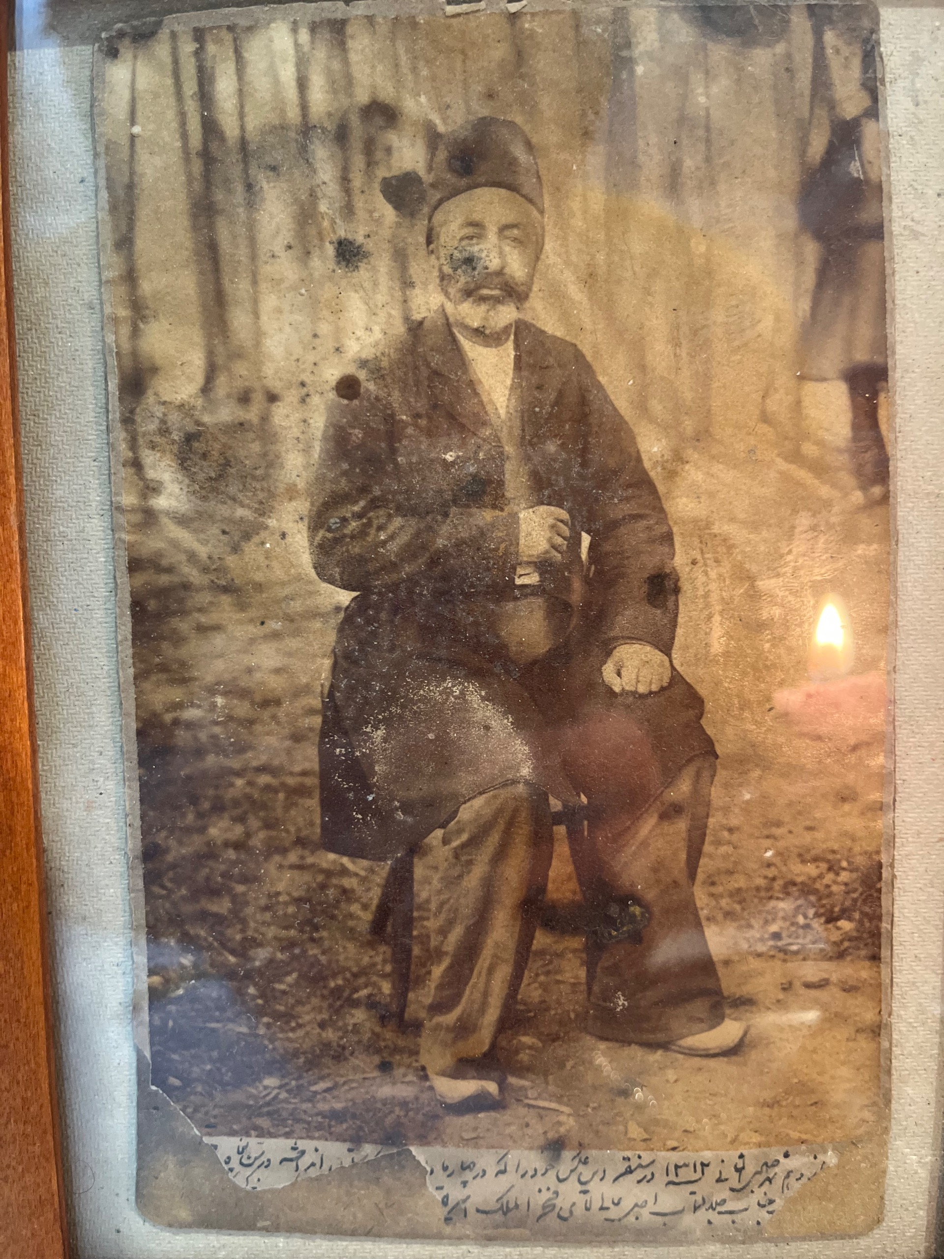 عکس احتمالا یکی از تجارقدیمی باشد که در پایین عکس توضیحات به قلم پهلوی نوشته شده ولی قسمت هایی از ان کنده شده . فقط میتوان سال را تشخیص داد و توضیح اینکه در سنقر رو چهارپایه نشستن.