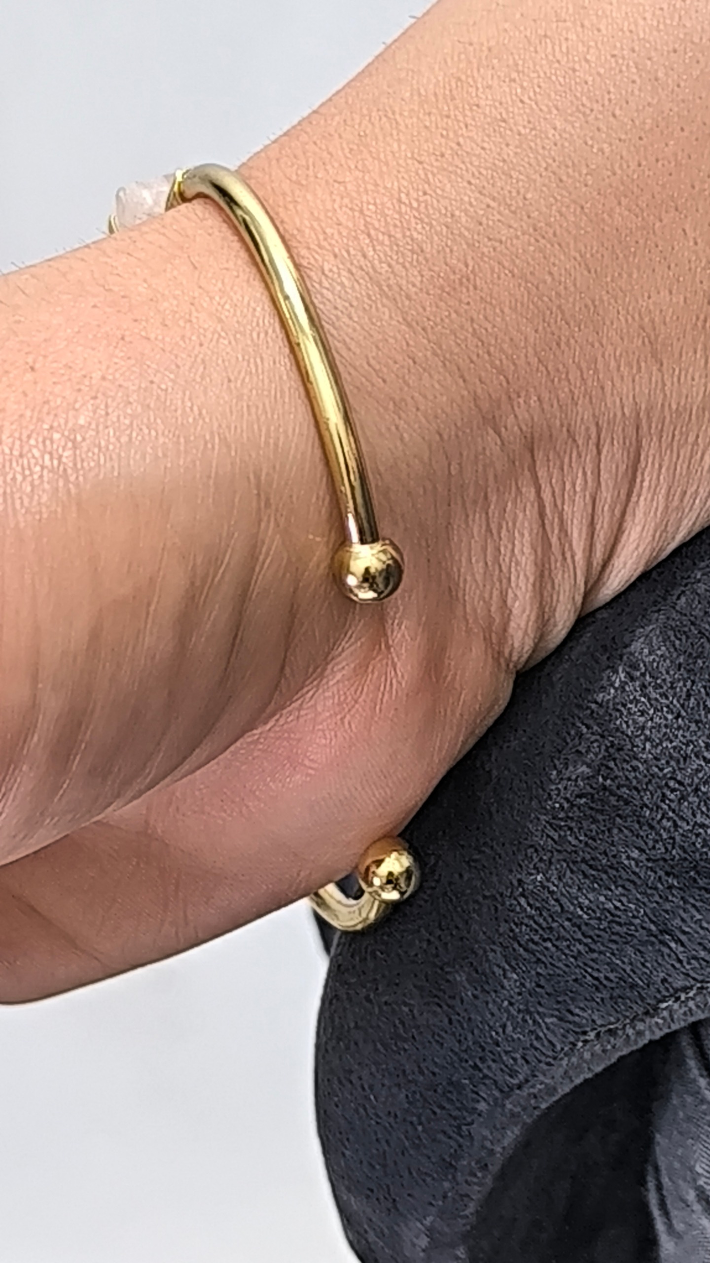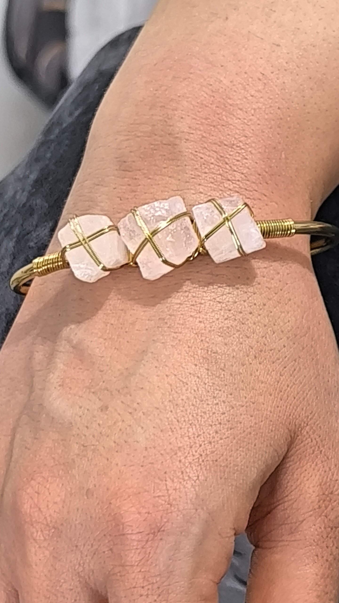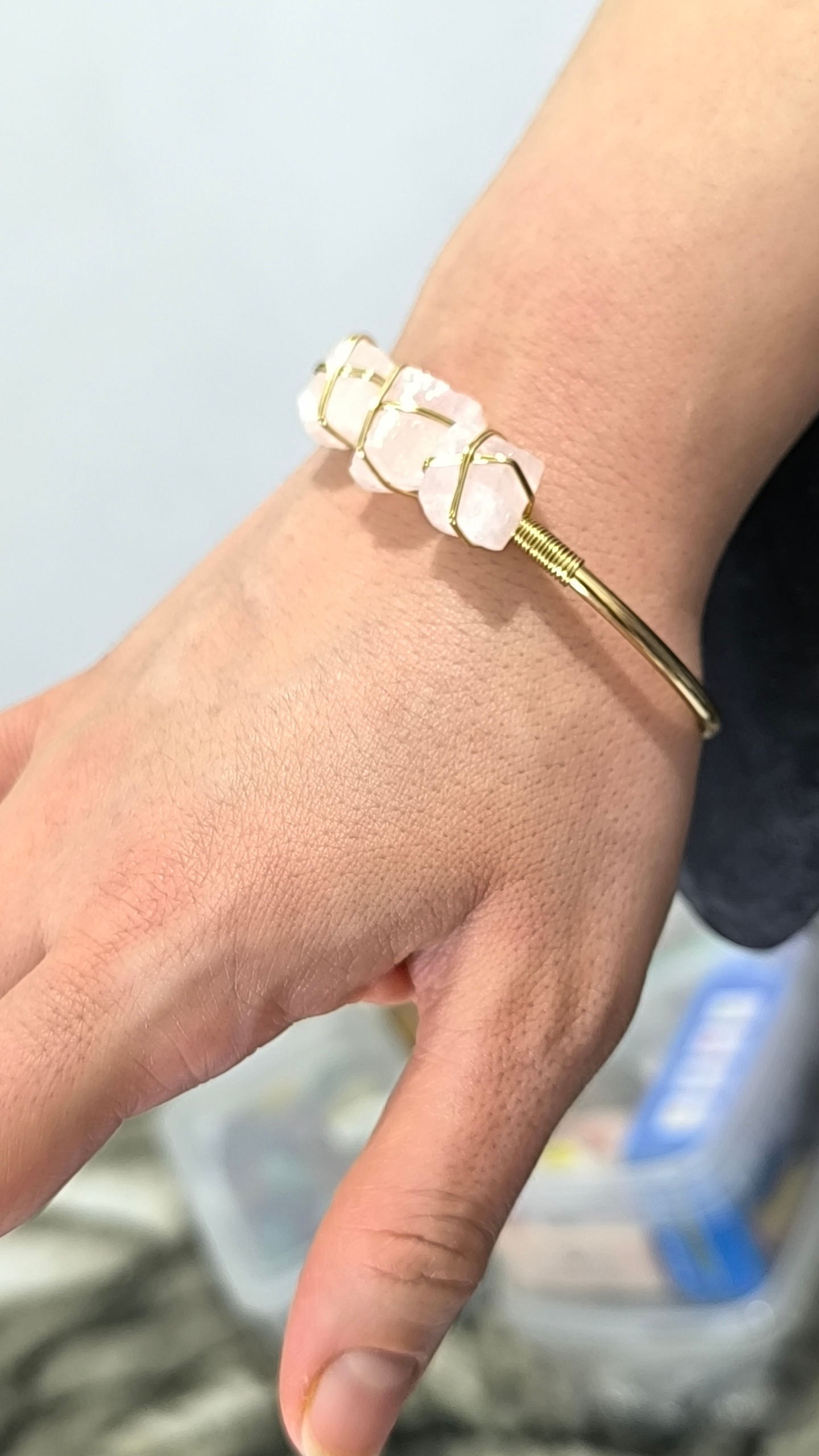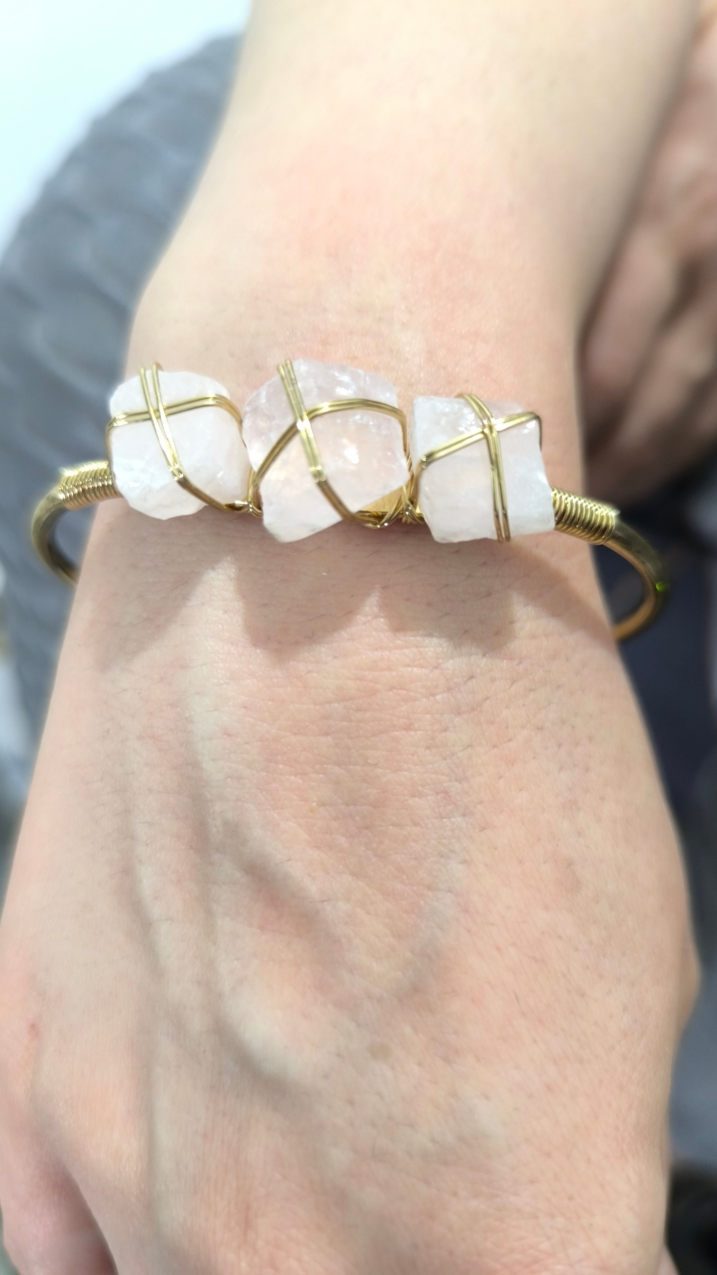 جنس دستبند طلا روسی و سه عدد نگین سنگ روش کار شده به اسم رز کوارتز خیلی شیک و سنگی قشنگ و خاص با کلی انرژی