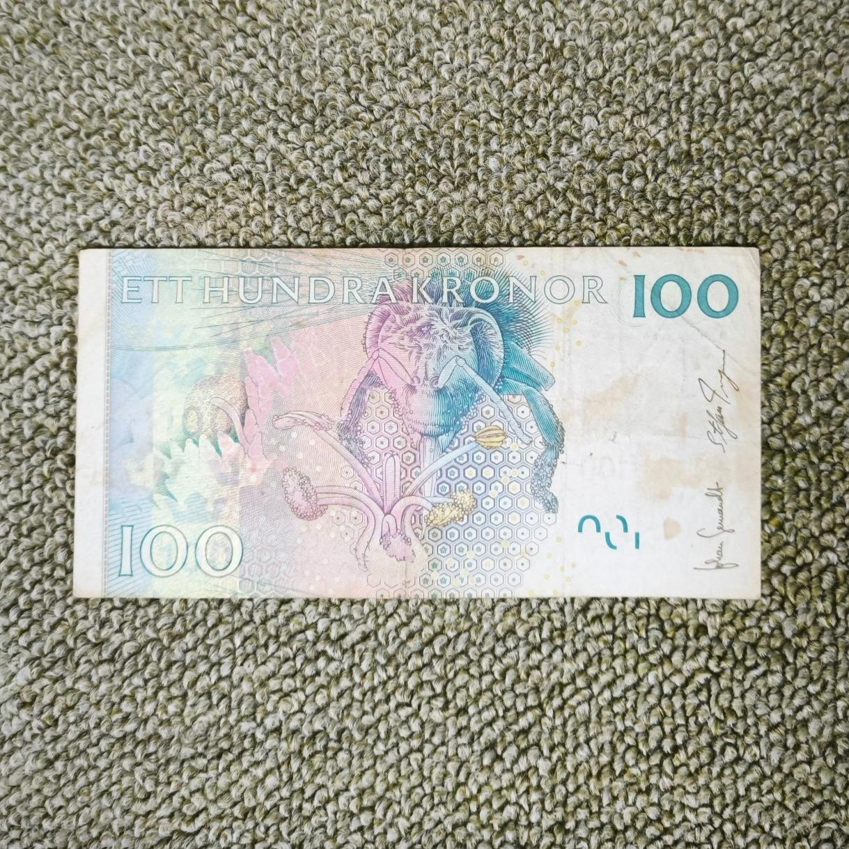 100 کرون سوئد با تصویری از کارل لینه گیاه شناس سوئدی، اسکناس بدون پارگی یا خط خوردگی خودکار هست و به جز چند تای معمول فقط کمی لک پشت اسکناس وجود دارد کیفیت مطابق تصویر.