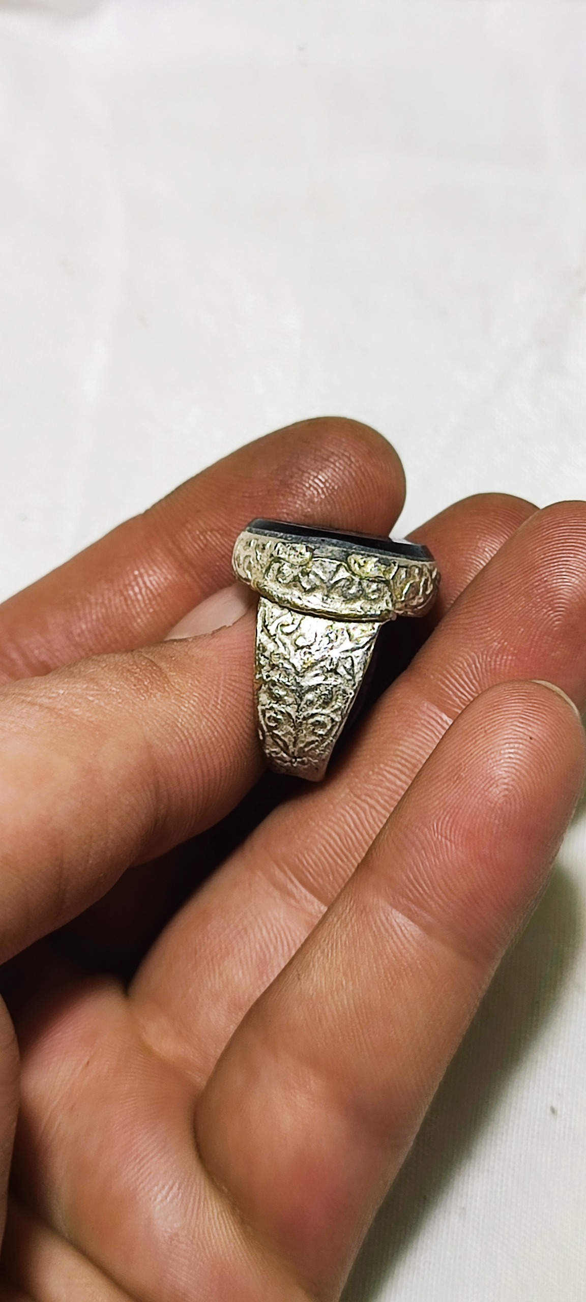 دو عدد انگشتر نشان عقرب عقیق سیاه افریقایی سلیمانی رکاب دست ساز نقره عیار پایین و یک عدد انگشتر برنج دست ساز طرح اروپایی اسکندر روش حکاکی شده