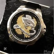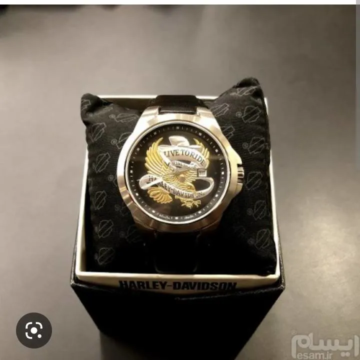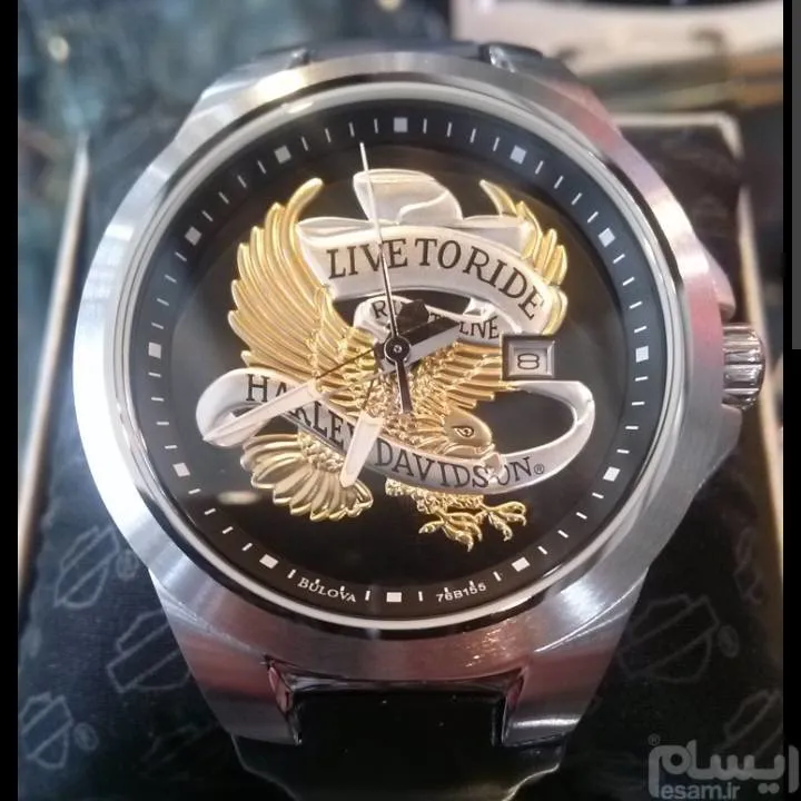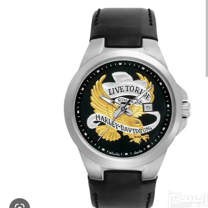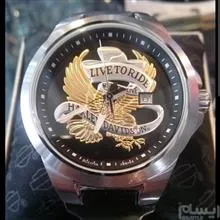 ساعت مچی هارلی دیویدسون با لوگوی طلایی عقاب برجسته و شعار ride to live و live to ride