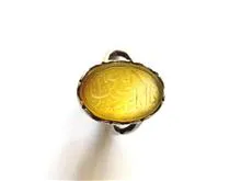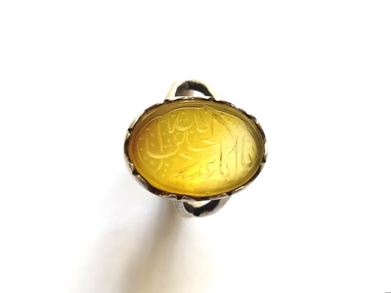 عقیق زرد حکاکی خط دستی استادانۀ «یا اباعبدالله الحسین» و رکاب دستساز سبک و ظریف