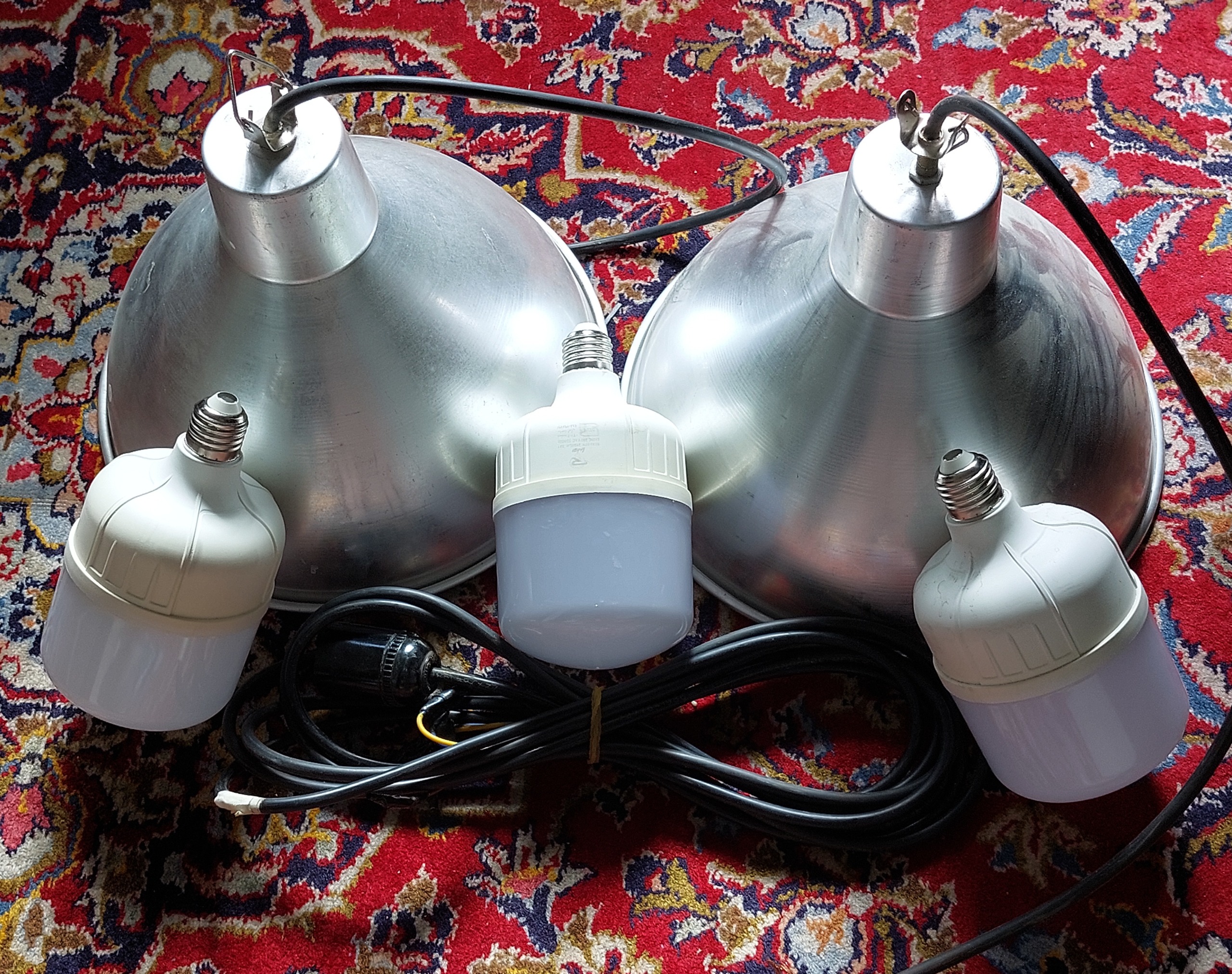 دو عدد آویز سقفی صنعتی قطر 28 در حد نو سه عدد لامپ و سرپیچ که لامپ ها کارانتیشان گذشته و 5 متر کابل 1.5 به طول 3و2 متر