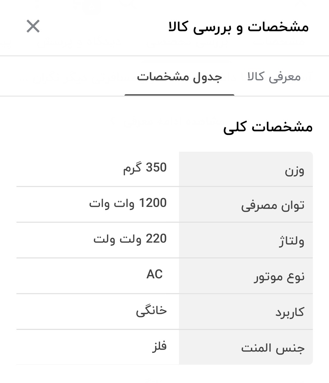مشخصات کالا