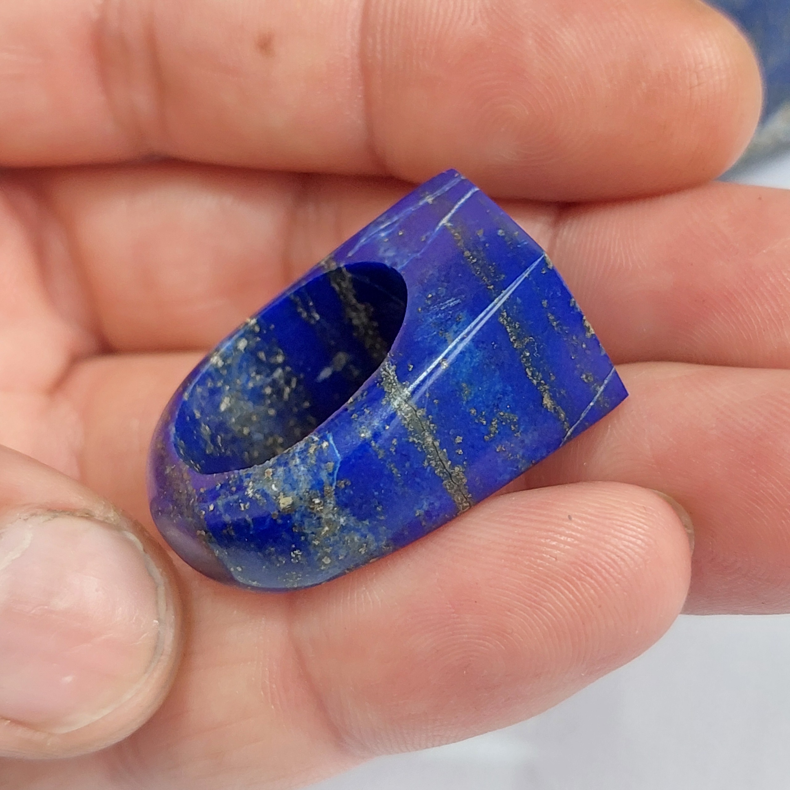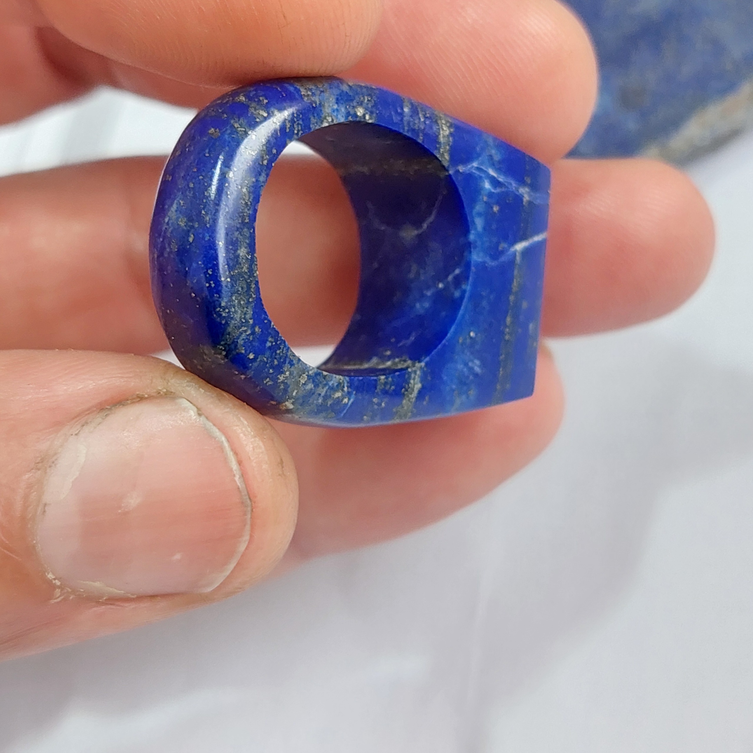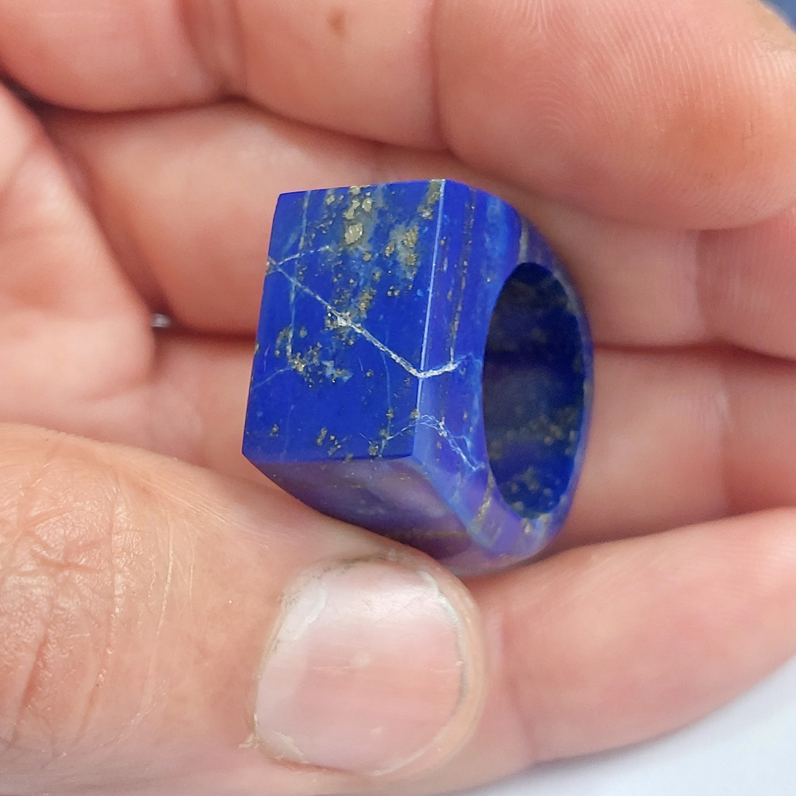 انگشتر تمام سنگ معدنی لاجورد افغان اصل فوق العاده خاص و نایاب ابعاد دهانه داخلی انگشتر 18میلیمتر هست البته تا 22 میلیمتر هم میتونیم بزرگترش کنیم دوستان این انگشتر تراش دست هست و 2 روز تراشش زمان برده تا تونستم این اثر هنری رو خلق کنیم