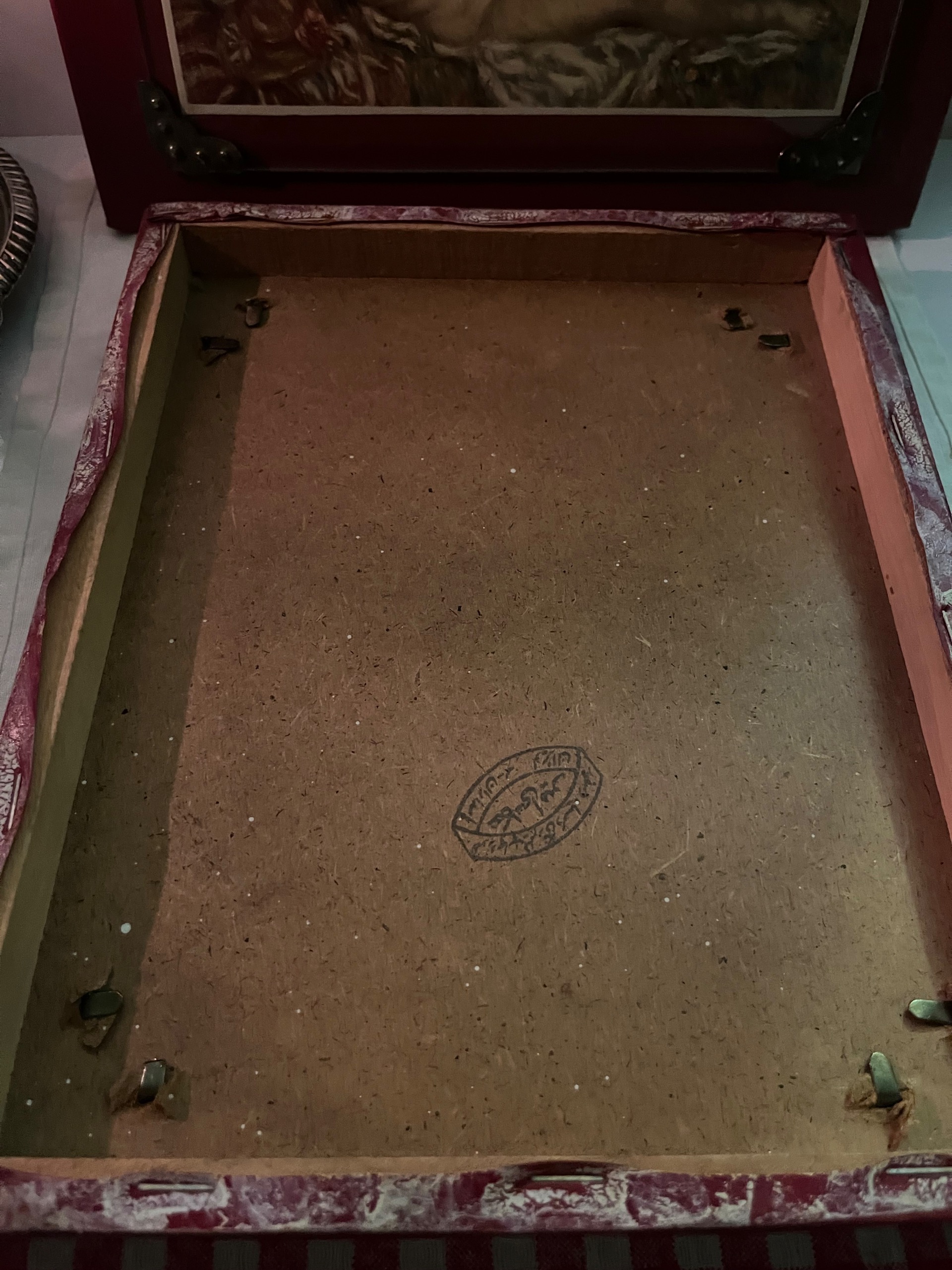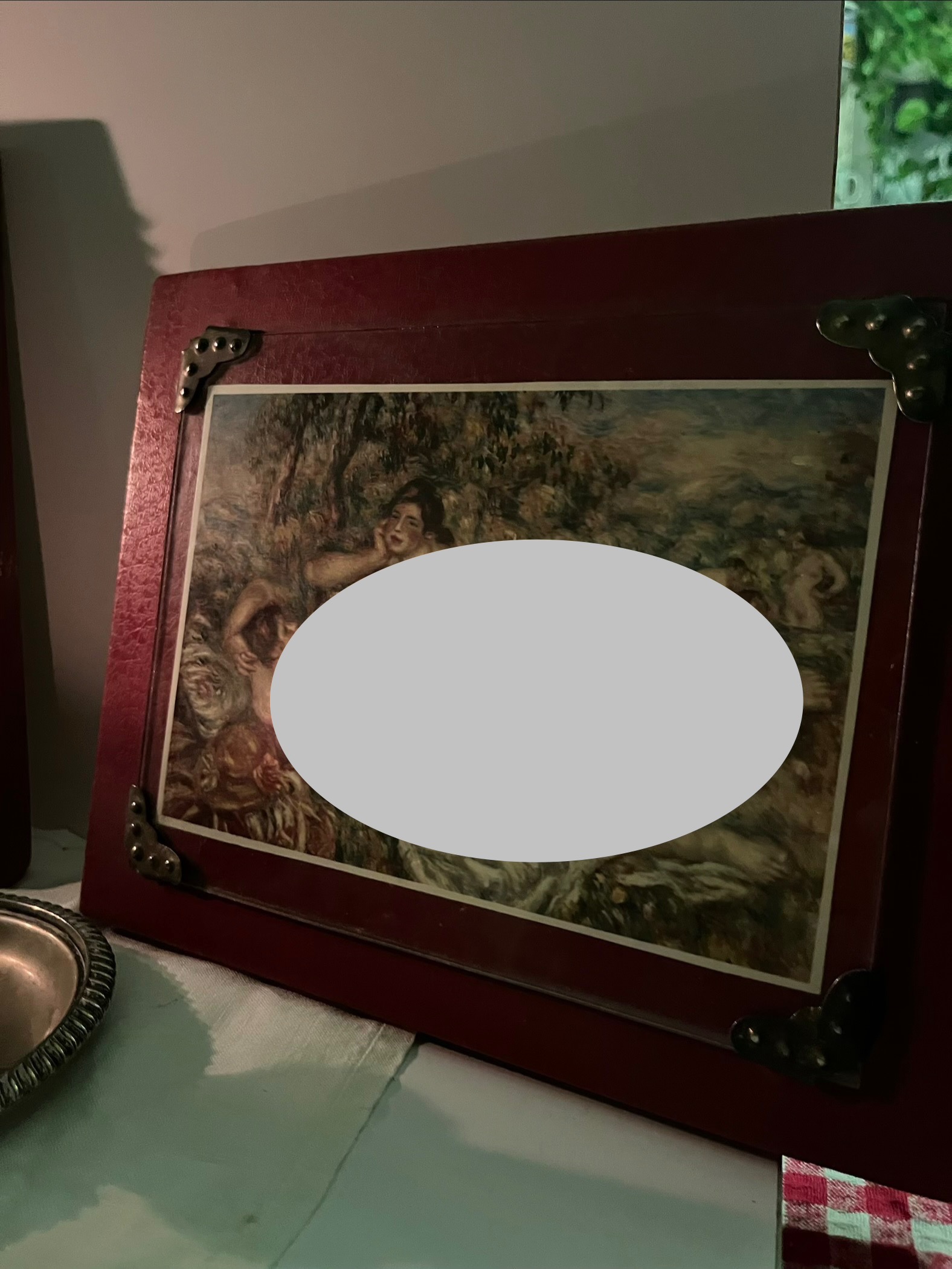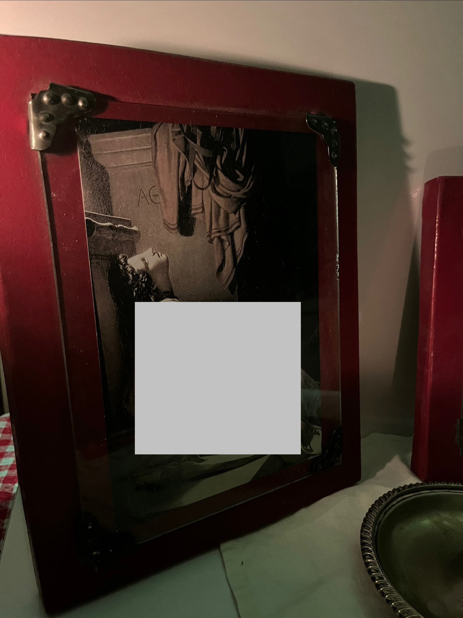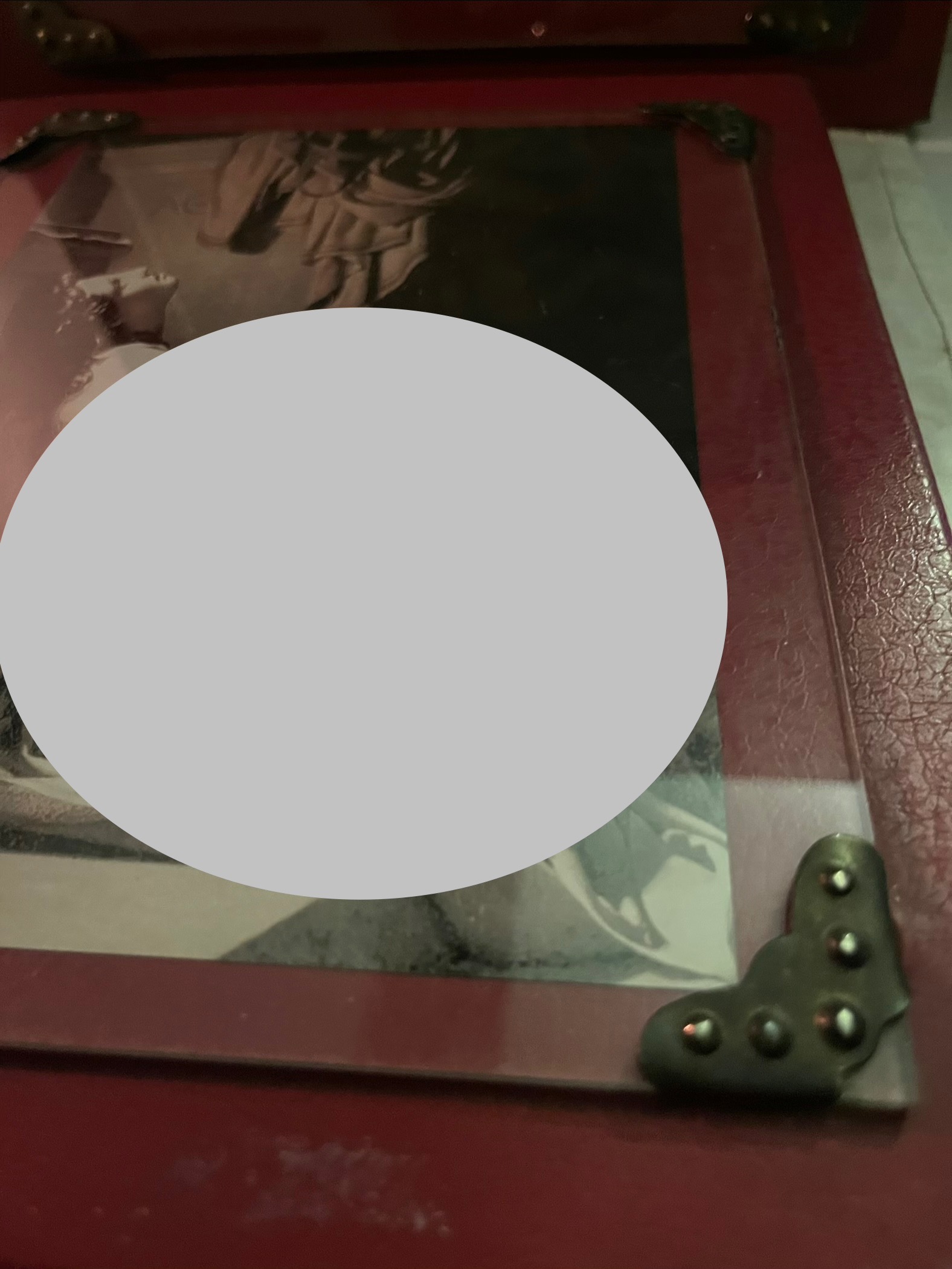 قاب کار چوبی با پس زمینه چرمی و همچنین گیره هایی که عکس را در وسط قاب نگه میدارد و حالت پاسپارته به آن بخشیده.