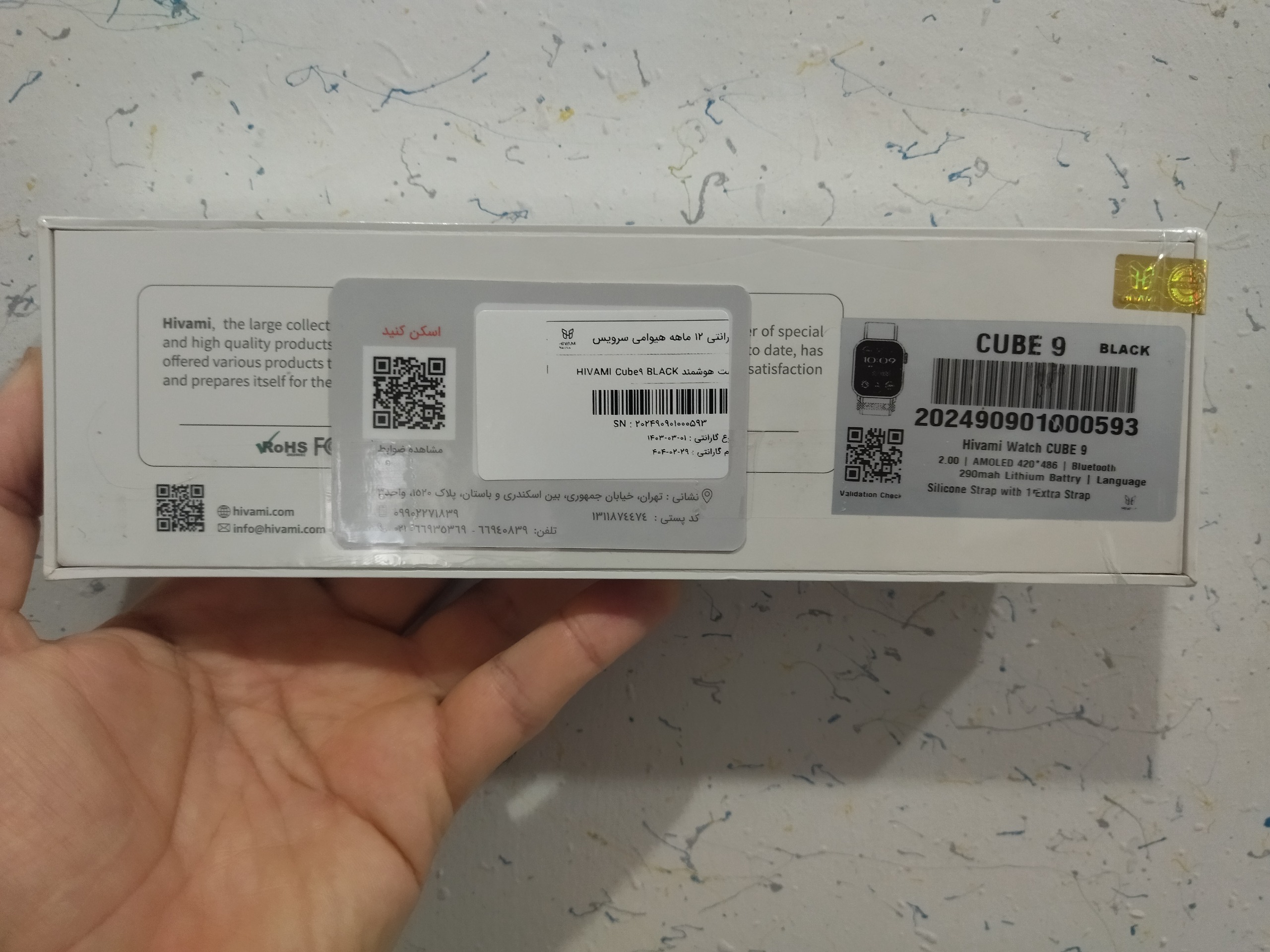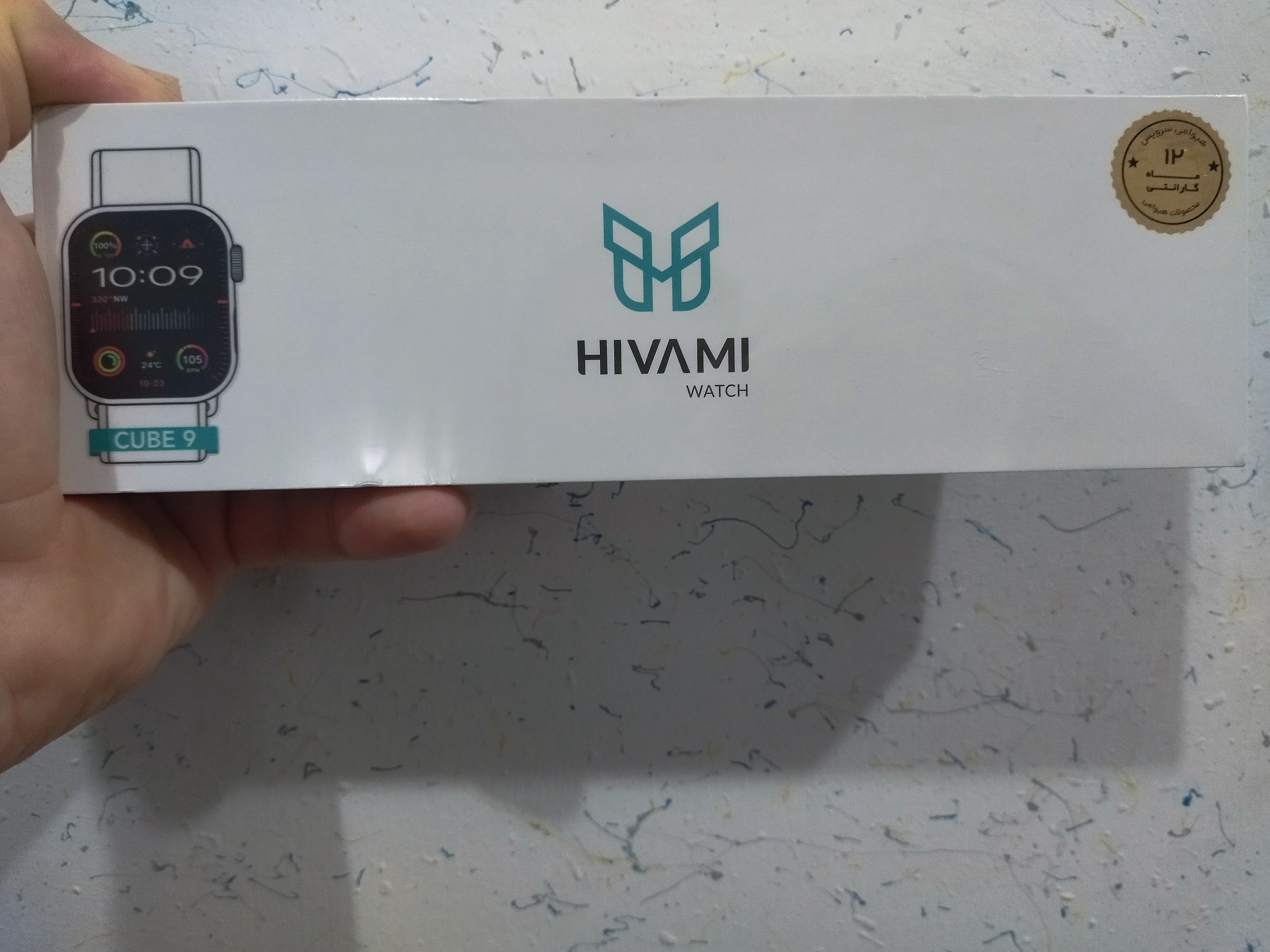 هنگام باز کردن جعبه ی ساعت Cube 9 در کنار خود ساعت به دو بند پارچه ای و سیلیکونی، کابل شارژر وایرلس، دفترچه راهنمای فارسی و انگلیسی و کارت گارانتی 12 ماهه هیوامی سرویس برمیخوریم.