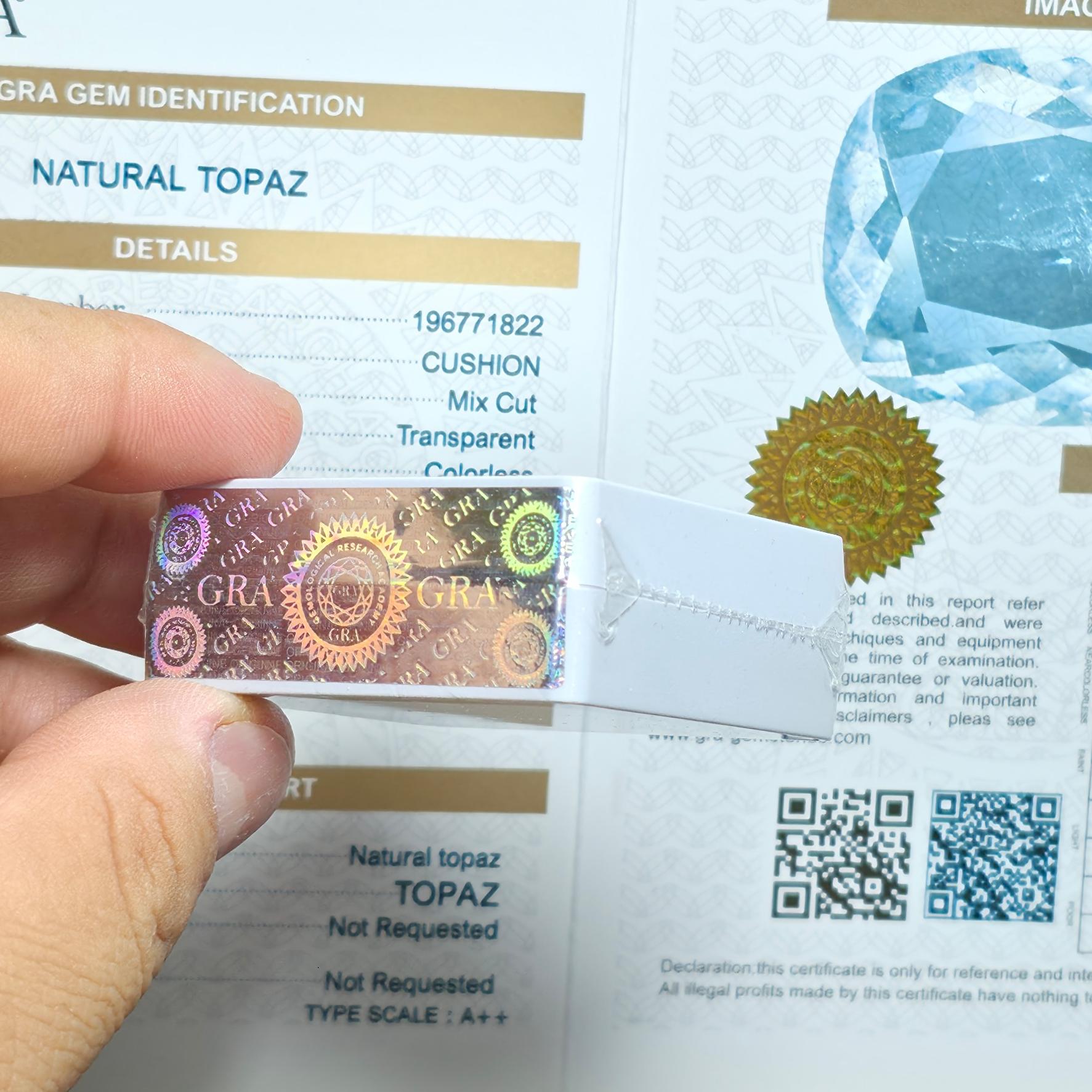 شناسنامه دارای جعبه مخصوص خود شرکت و بسیار لاکچری خاص میباشد و همچنین دارای کارت وارانتی عابربانکی به صورت PVC کارت و هولوگرام امنیتی و شناسنامه آنالیز گوهر میباشد . گوهر داخل باکس مخصوص با هولگرام امنیتی شرکت GRA پلمپ هست و امکان تعویض و یا عوض شدن گوهر به هیچ عنوان وجود ندارد
