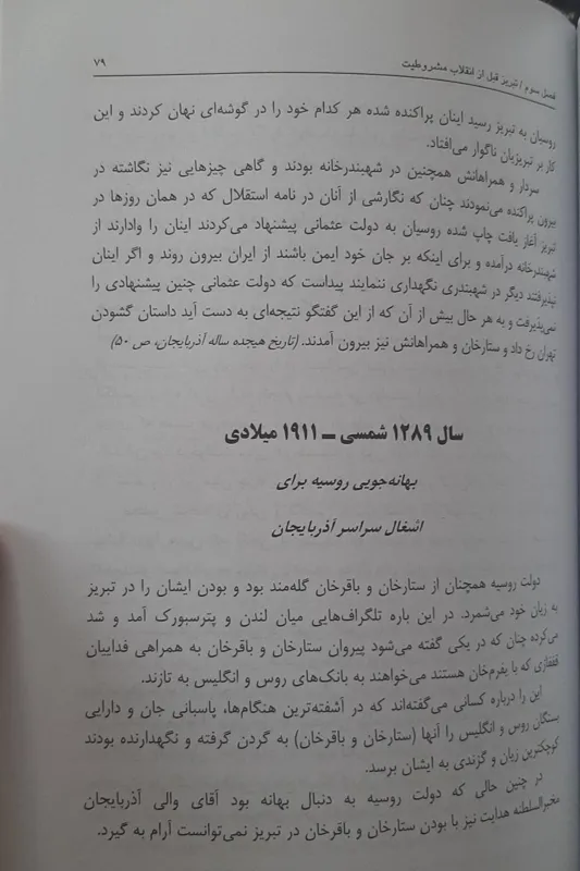 این کتاب گرانسنگ مشتمل بر تبریز و دومان ایلخانی، قره قویونلو و آق قویونلو، در دوران صفویان و قاجار، جنگ ایران و روس، تبریز قبل مشروطیت، تبریز در انقلاب مشروطه، تبریز و روس ها، شورش و خروش آذربایجان، آمدن عثمانی یه تبریز ، ورود ارتش سرخ به تبریز، زمزمه رادیو لندن و استعفای رضاخان، جنگ جهانی اول و دوم و...