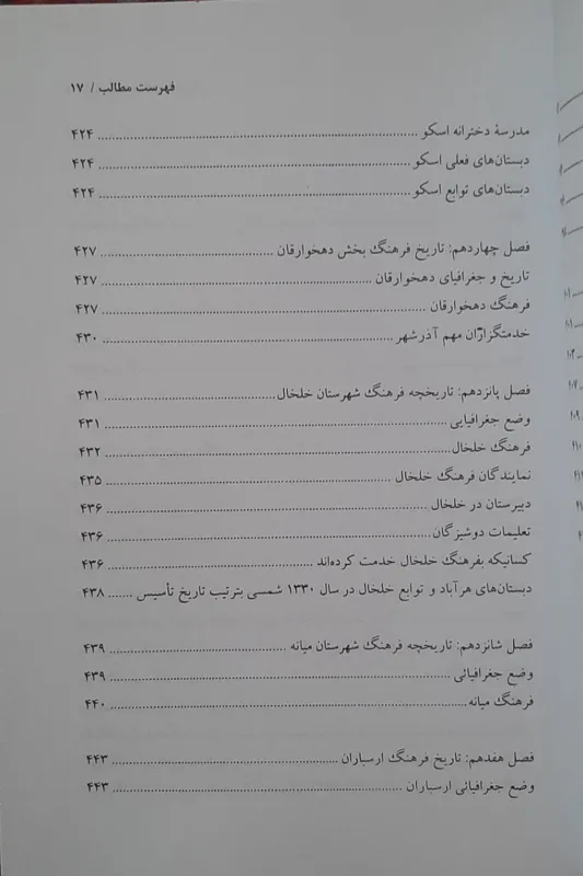 این کتاب گرانسنگ مشتمل بر: انواع مدرسه های آذربایجان، وضه تعلیم و تربیت قبل از ایجاد مکتبخانه، مدارس جدید تبریز قبل از شروع مشروطیت، مدارس خارجی و ارامنه در آذربایجان، مدارس تبریز در سالهای اول مشروطه، نخستین مدارس شهرستان های آذربایجان در اول مشروطیت، تشکیل اداره معارف آذربایجان، تشکیلات جدید معارف آذربایجان، تاریخ فرهنگ آذربایجان از 1312 تا 1320 شمسی، تاریخ ار 1320 تا اکنون، تاریخ فرهنگ شهرستان تبربز، اسکو، دهخوارقان، خلخال، میانه، ارسباران، اهر، سراب، اردبیل، مرند، علمدار، ارونق و انزاب، مراغه، میاندوآب، خوی، شاهپور، سلماس، ماکو، رضاییه و....