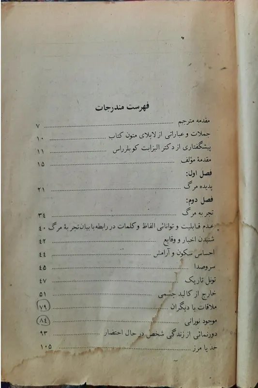 این کتاب شامل: پدیده مرگ؛ تجربه مرگ، تونل تاریک، ملاقات با دیگران، موجود نورانی، احساس سکون و ارامش، رجعت، کتب مقدس، توجیهات فوق طبیعی، توصیفات فیزیولوژیکی، توجیهات علم عصب شناسی، توجیهات علم روانشناسی، کتاب الاموات تبتی، دیدگاه هاب نوین مرگ و ....