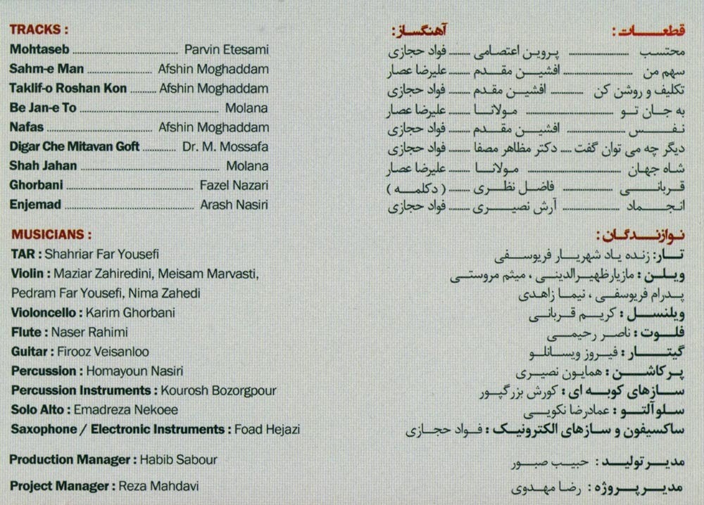 در این آلبوم نوازندگانی چون زندهیاد شهریار فریوسفی، مازیار ظهیرالدینی، میثم مروستی، پدرام یوسفی، نیما زاهدی، کریم قربانی،ناصر رحیمی، فیروز ویسانلو، همایون نصیری، کوروش بزرگپور، عماد نکویی و فواد حجازی همراهی داشتهاند.