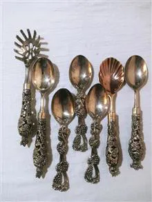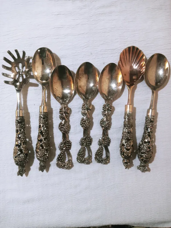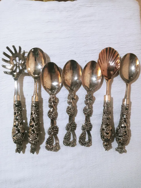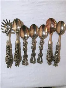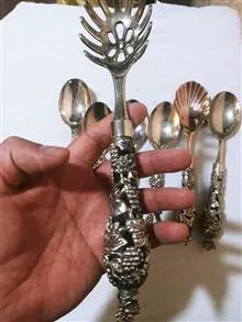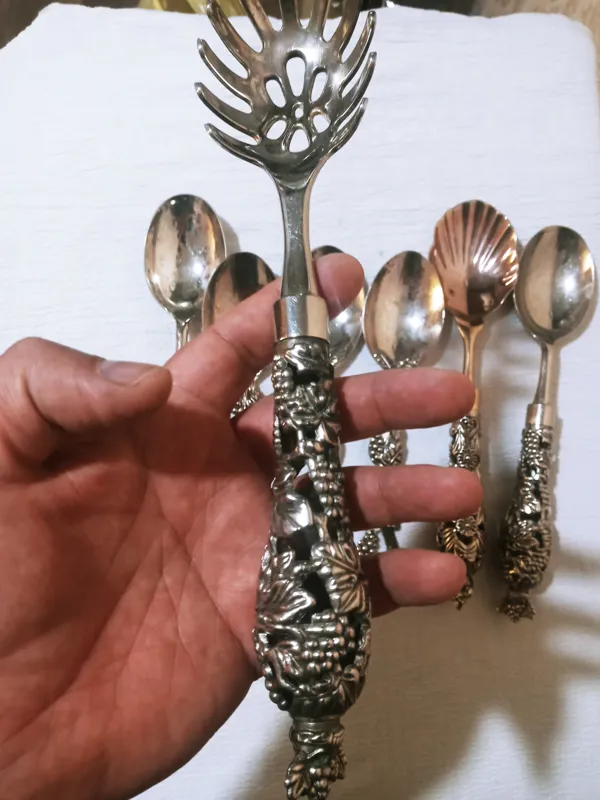 تعداد 6 عدد قاشق آجیل خوری و 2 عدد چنگال سالاد یا آجیل خوری دسته مدل انگوری جنس سیلور پلیت .فروش بصوت یکجا.