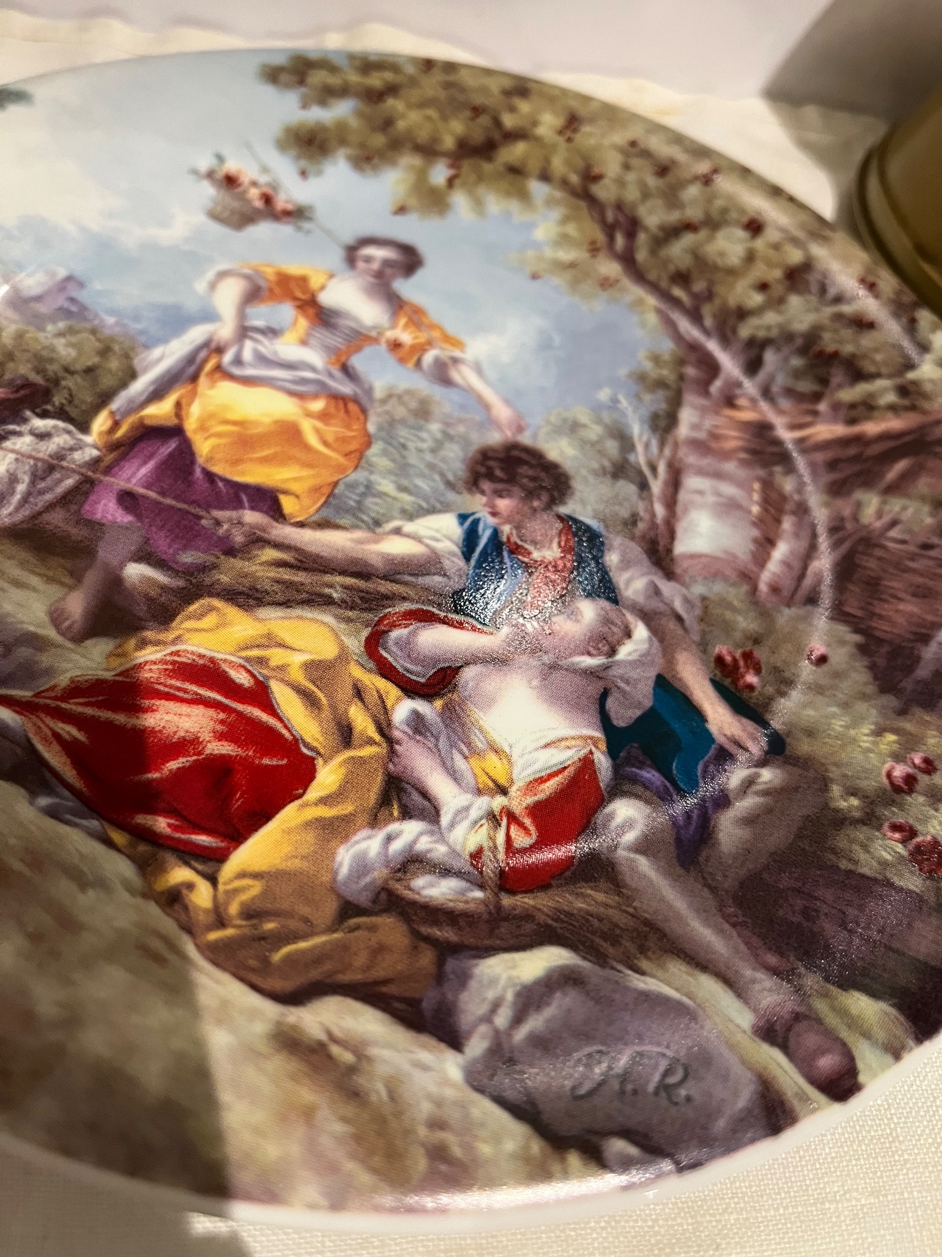 دیوارکوب زیبا نقاشی چاپ با طرح فیگور های فرانسوی قدیمی و منظره همراه با امضای روی کار.