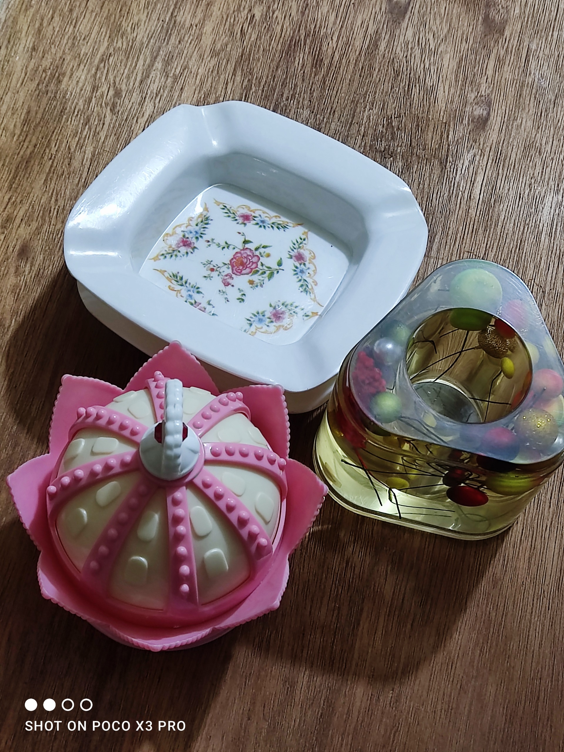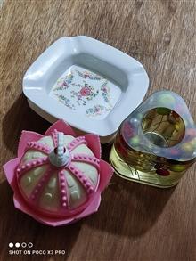 دو عدد زیرسیگاری قدیمی  استفاده نشده جنس ملامین بسیار محکم///یک عدد قندون بشکل تاجپادشاهی جنسش از پلاستیکه ///و یک عدد احتمالا جاخودکاری باشه خیلی قشنگه داخلش یه مایعی هست قیمت برای هرچهار عدد میباشد