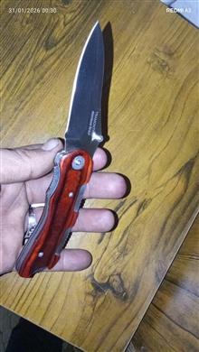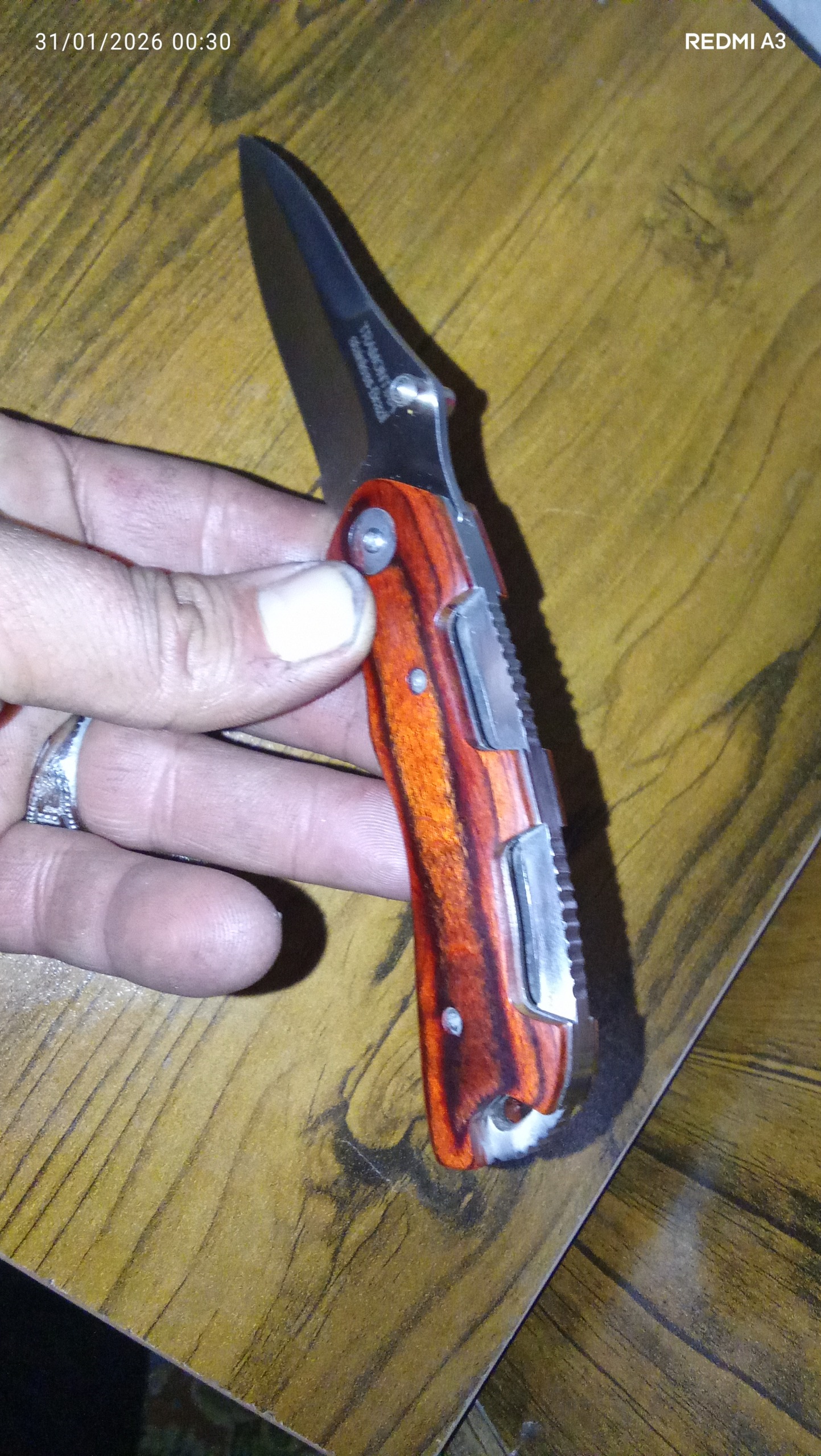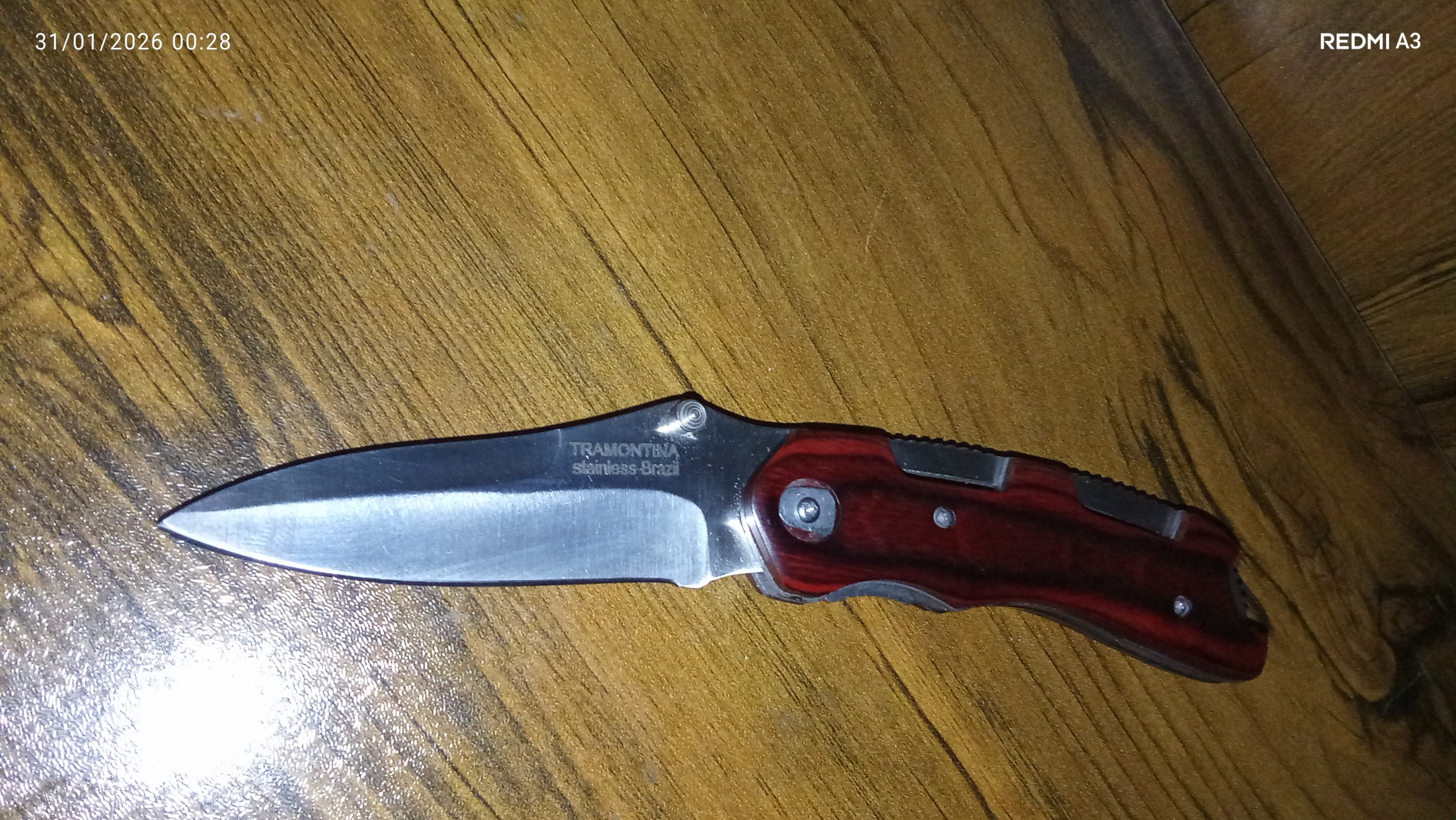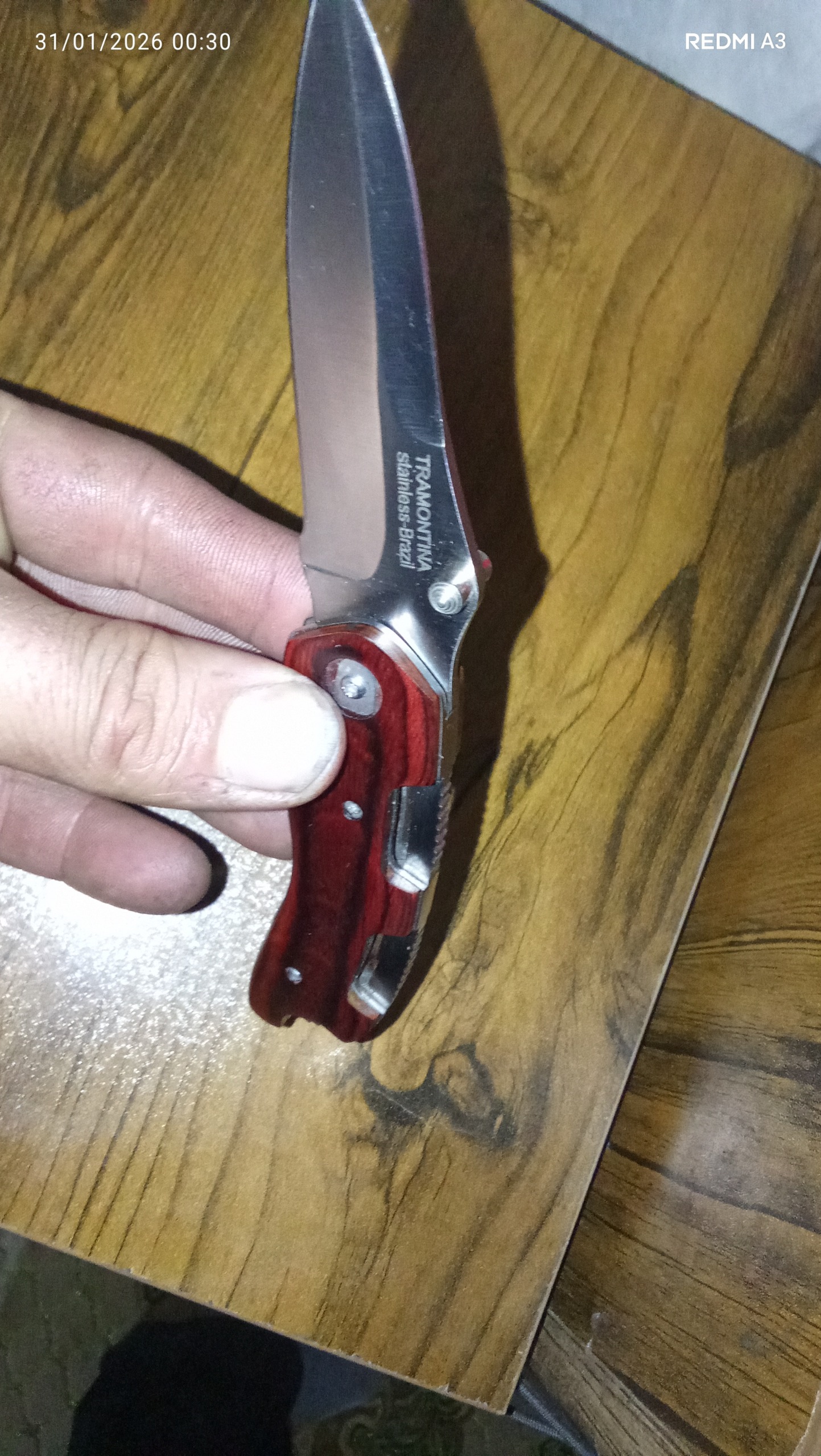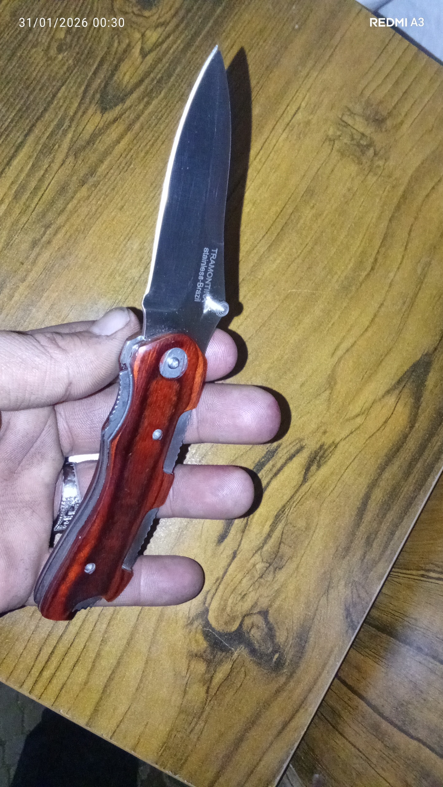 چاقو شکاری برزیلی اصل ترامون تینا ضامندارمدل لاینر دسته چوب پادوک تیغه استیل فولاد خشکه بسیارتیز وابدیده مثل تیغ جراحی سایز18سانت مناسب سفر وپیکنیک و گردشگری طبیعت گردی خوشدست فنرقوی بازوبست شلاقی وعکس بیشترو هر سوالی باشه درخدمتم