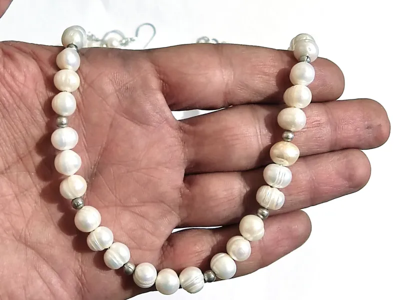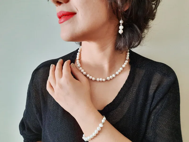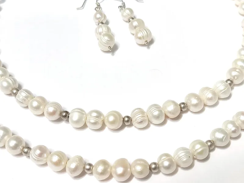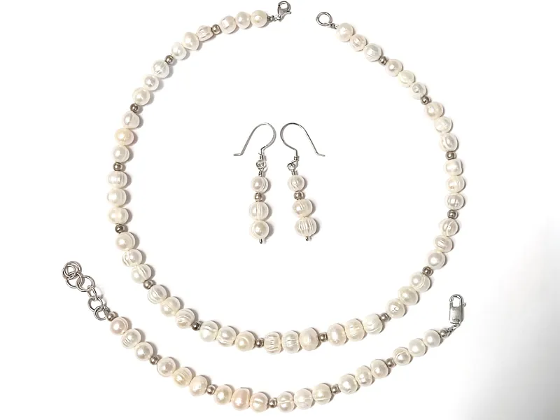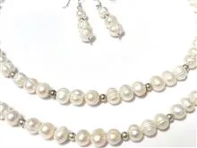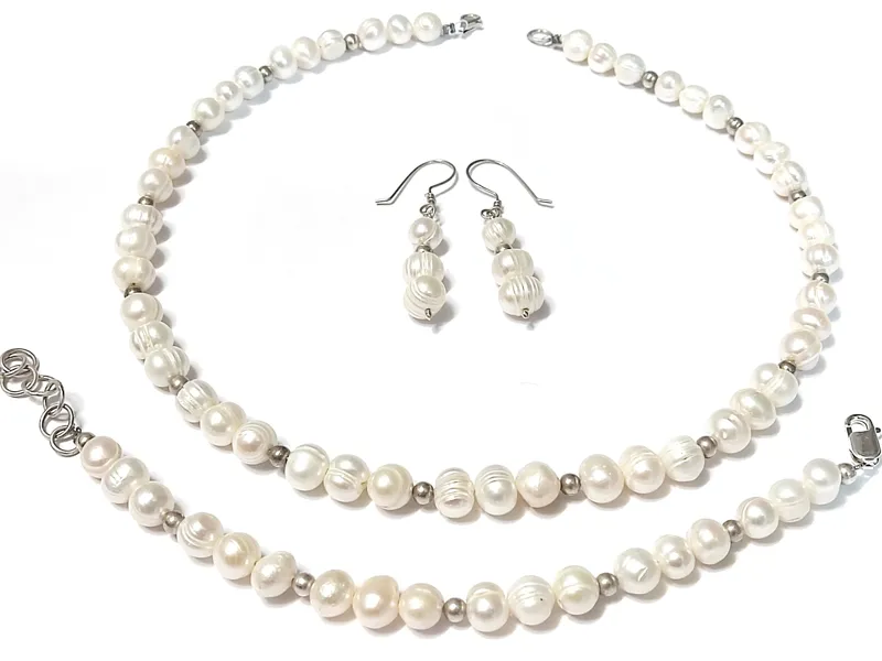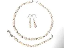 گردنبند و گوشواره و دستبند با مجموعا 72 مروارید باروک اصل پرورشی آب شور میانگین 8 میل و 24 مهره نقره 4 میل.