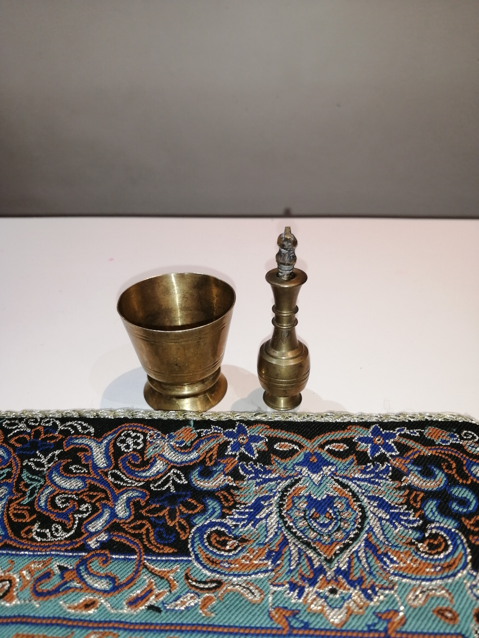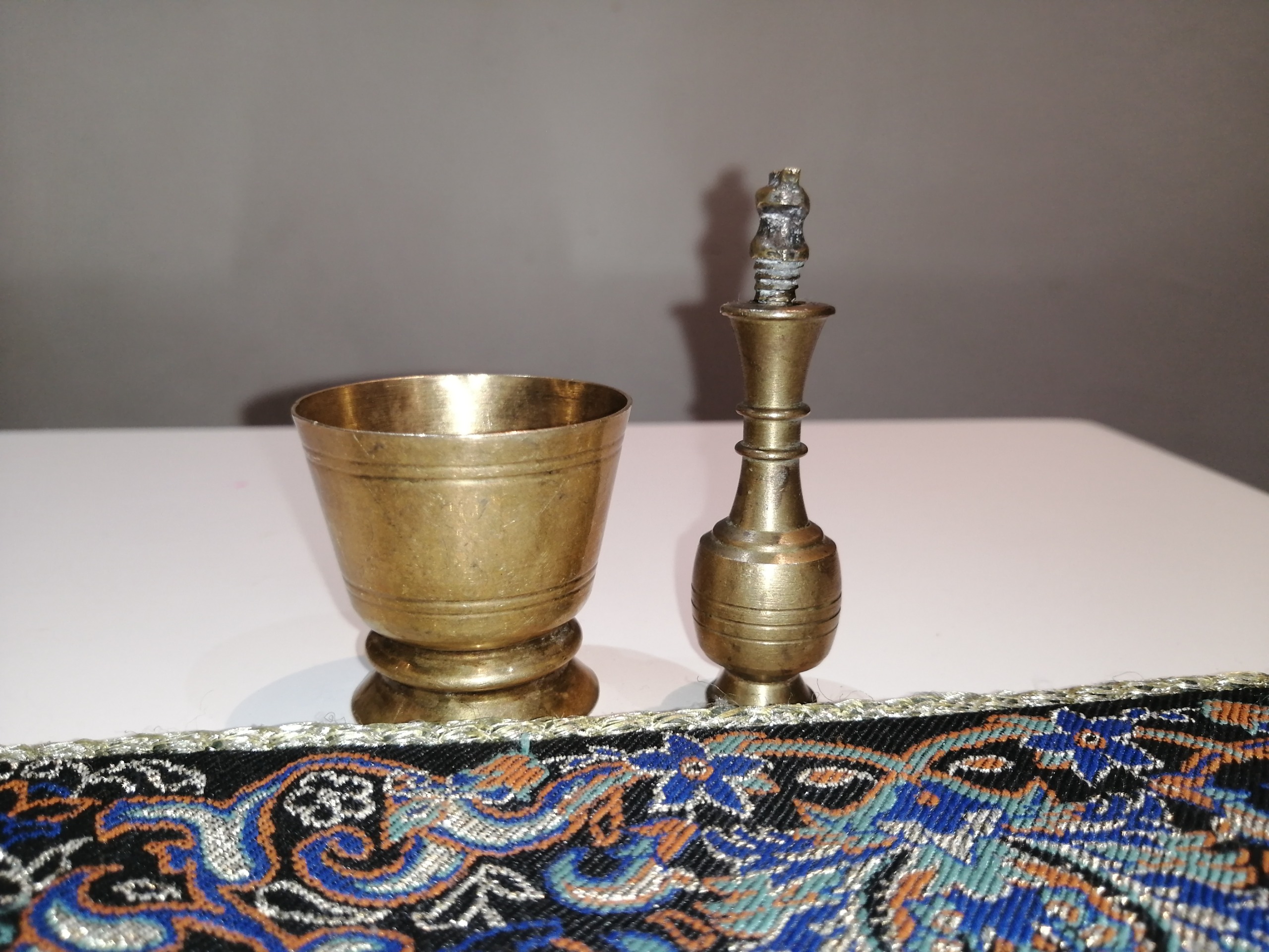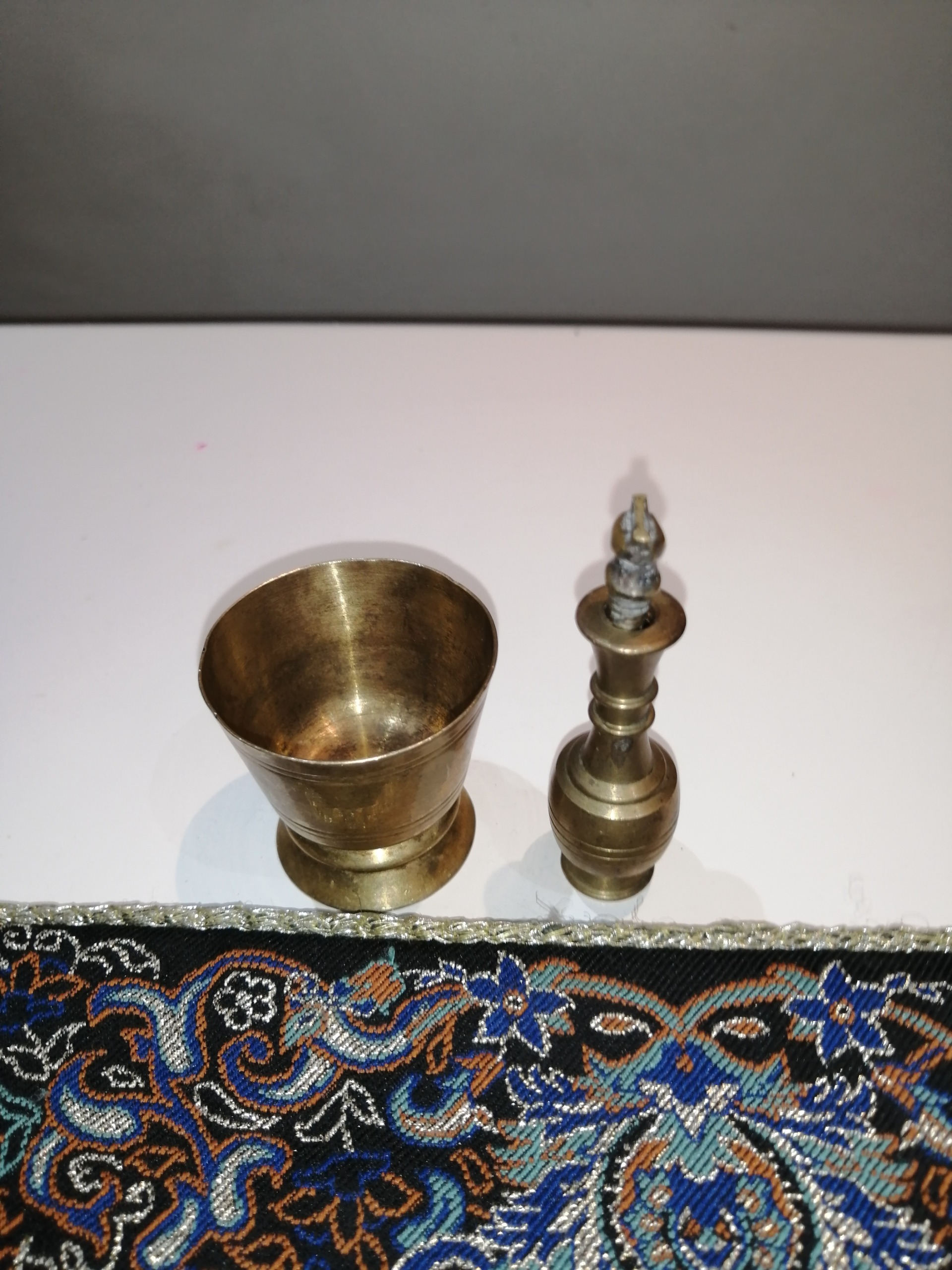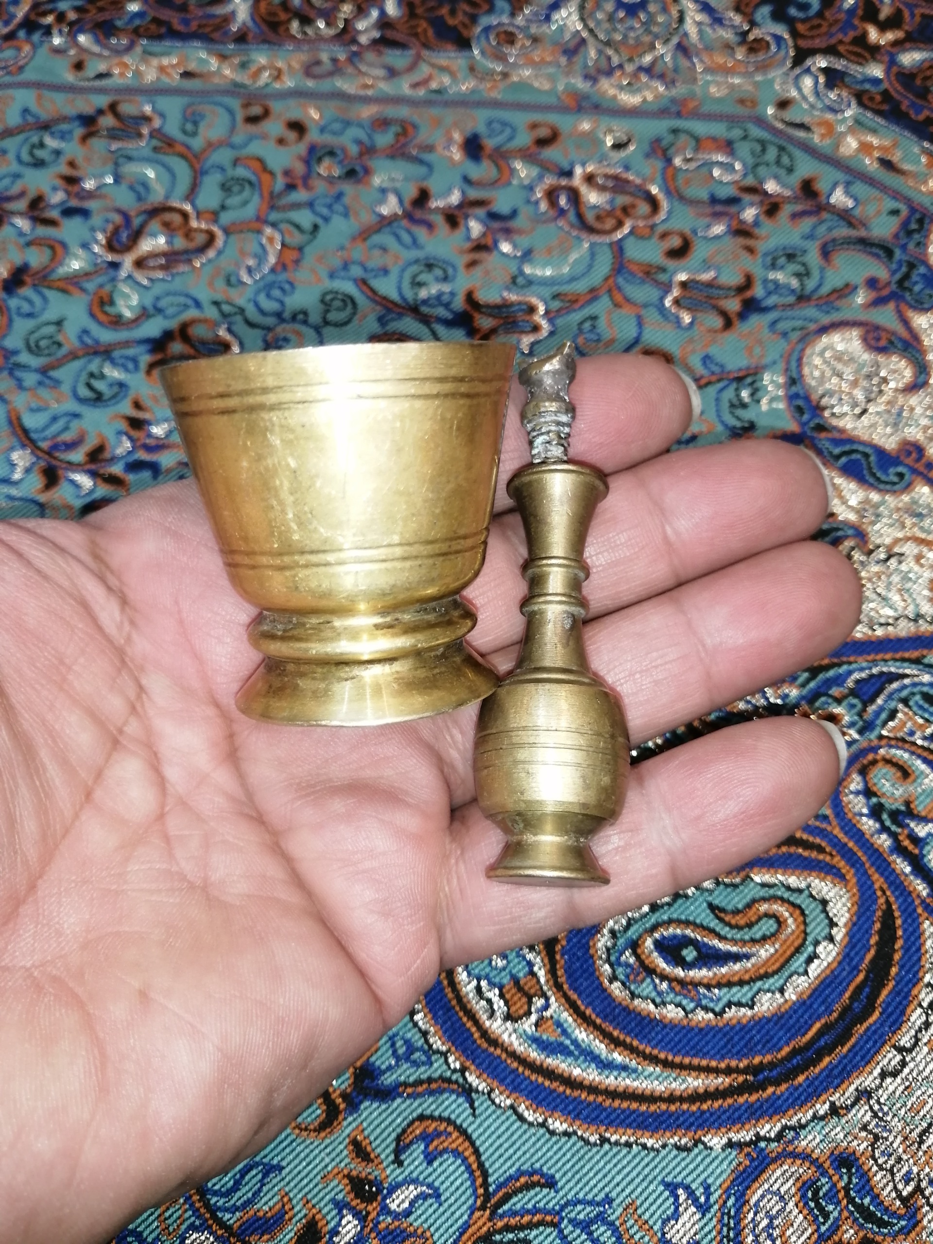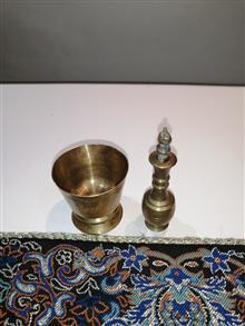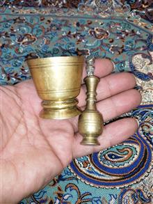 سورمه دان برنجی که در قسمت بالای میله سورمه دان شکستگی دارد مال خودش نسیت و لیوان مینیاتوری برنجی