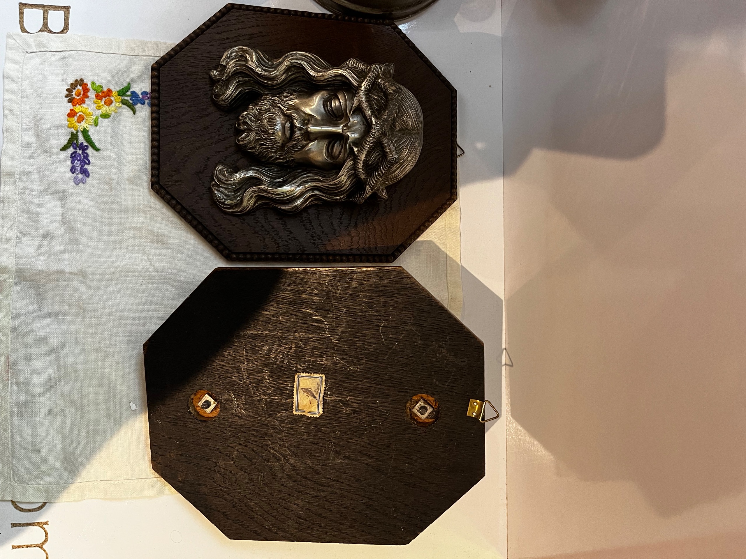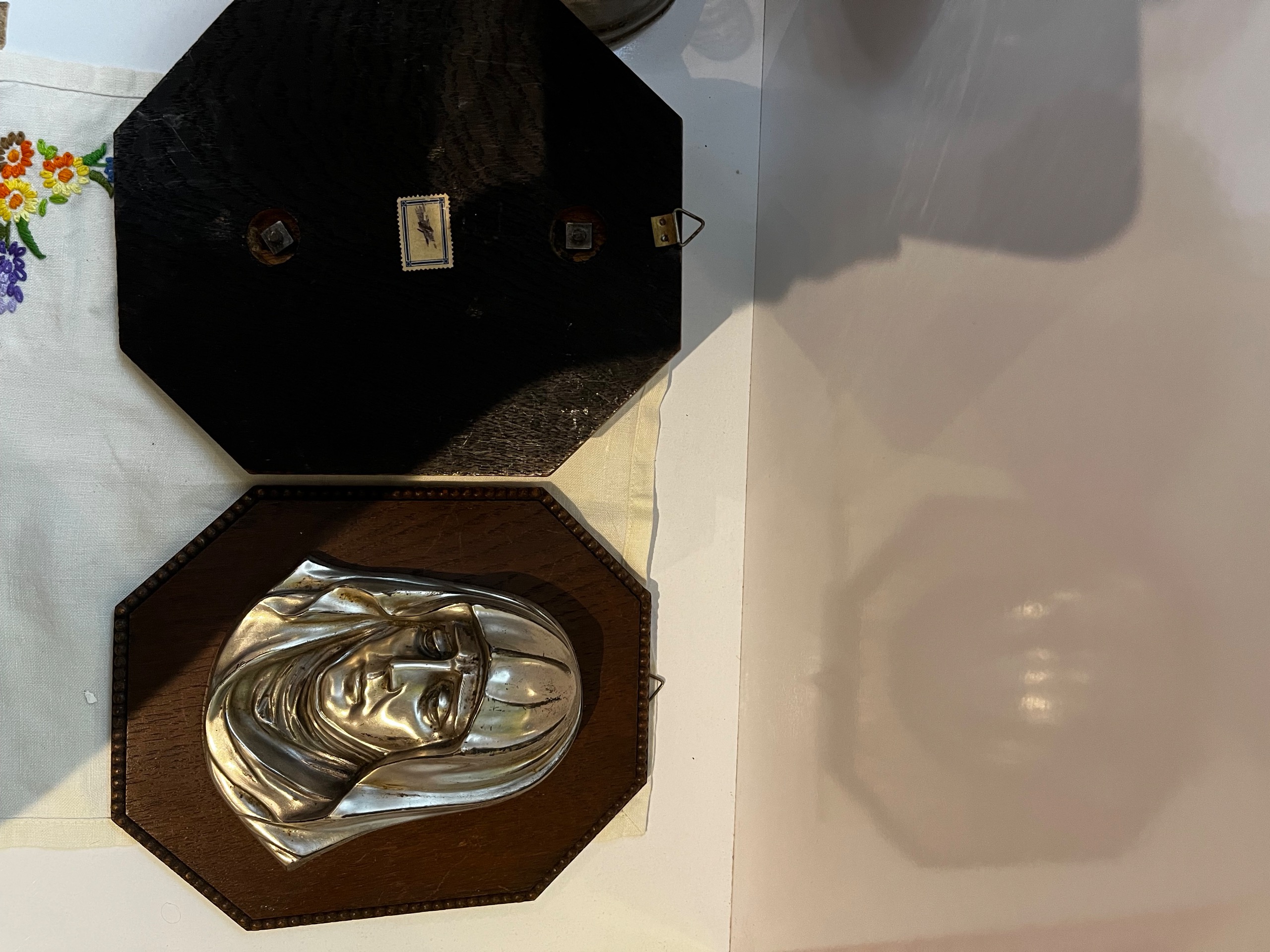ست کم یاب قابهای برجسته مسیحیت ترکیب قاب چوبی با نقش برجسته از قلع و سرب ساخت ایتالیا در عکس شمعدان و بقیه آیتم ها به عنوان بکگراند در عکس هستند