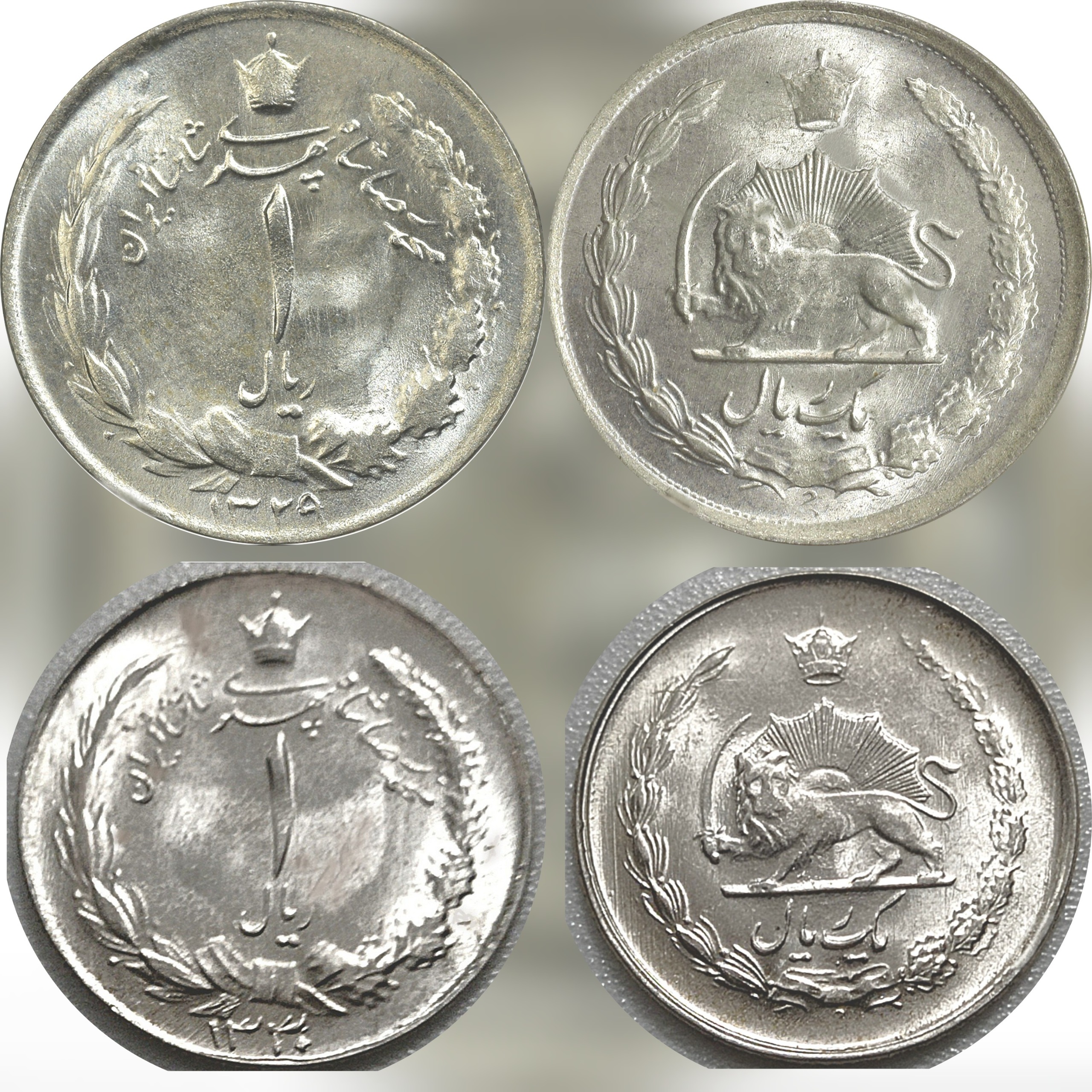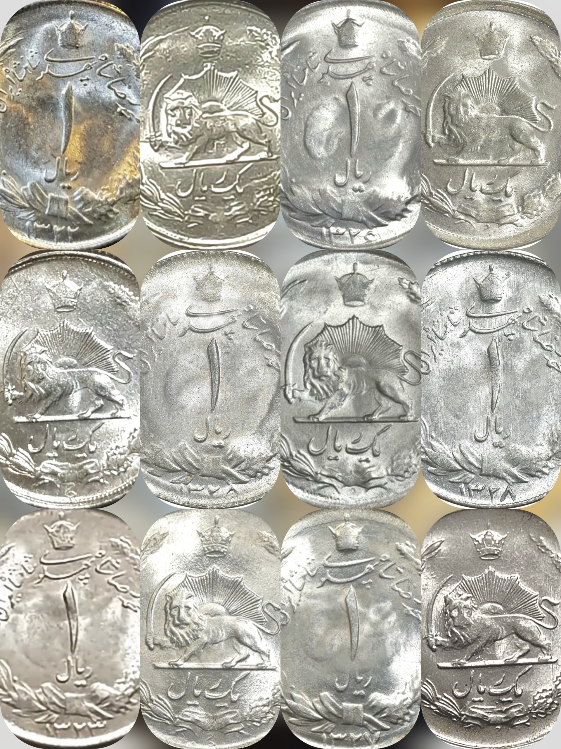 مجموعه فوق شامل تمامی سکه های نقره 1 ریال محمد رضا پهلوی پهلوی از سال 1322 الی 1330 به صورت کامل و تمامی سالها میباشد