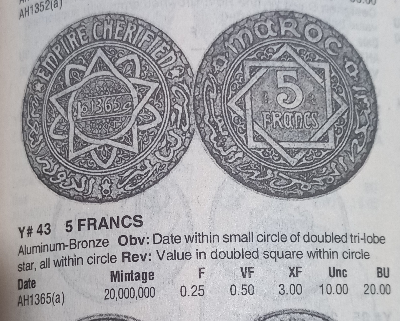 سکه سایز بزرگ آلومینیم برنز 5 فرانک 1365 هجری قمری 1945 میلادی مغرب / مراکش ، کمیاب قیمت 1 میلیون .