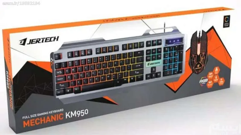 معرفی محصــول Jertech KM950 Keyboard and Mouse کیبورد و ماوس گیمینگ JERTECH مدل KM950 با طراحی بسیار زیبا و کیفیت ساخت بالا به بازار عرضه شده است. کیبورد گ دارای 104 کلید استاندارد بوده، صفحه زیر کلید ها در KM950 فلزی طراحی شده تا از مقاومت و زیبایی بالایی برخوردار باشد. در KM950 چندین چراغ LED با نور دهی بسیار بالا طراحی شده است که با زدن کلید Scroll Lock میتوانید نور پس زمینه کلید ها را خاموش و روشن نمایید. همچنین در KM950 کلید های مولتی مدیا و میانبر بر روی کلید F1 تا F12 برای راحتی کارکرد طراحی شده که با نگه داشتن کلید FN و زدن این کلید ها میتوانید از آنها بهره ببرید. JERTECH KM950 به همراه یک ماوس گیمینگ البته با کیفیت معمولی میباشد، ماوس از نوع مخصوص بازی بوده که دارای LED های چند رنگ با نور دهی بسیار بالا و تعویض رنگ اتوماتیک میباشد. ماوس دارای 4 کلید بوده و برای کاربران چپ دست نیز مناسب میباشد. همچنین حسگر ماوس از نوع اپتیکال و دارای کلید Dpi یا همان کلید تنظیم سرعت و دقت ماوس تا 3200Dpi میباشد. هر دو محصول موجود در بسته بندی بوسیله پورت USB به دستگاه مورد نظر متصل میگردد.