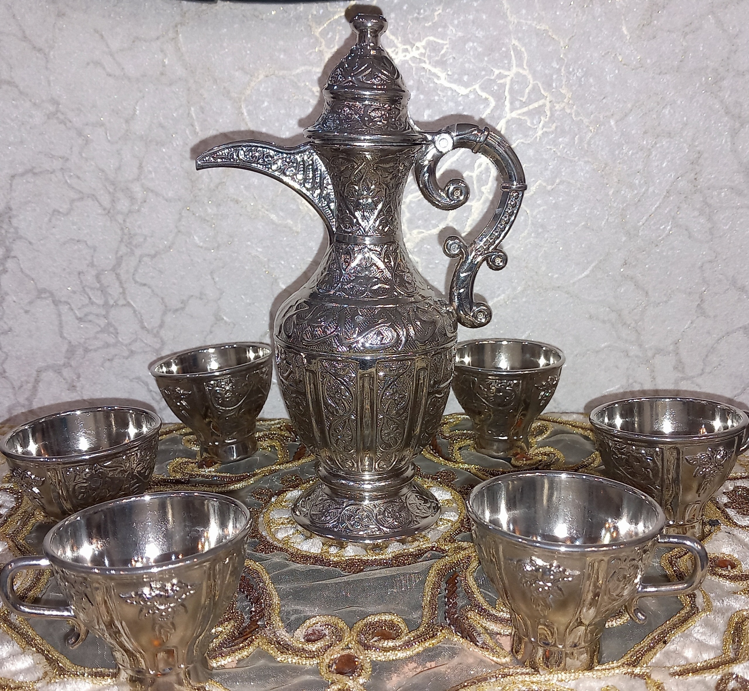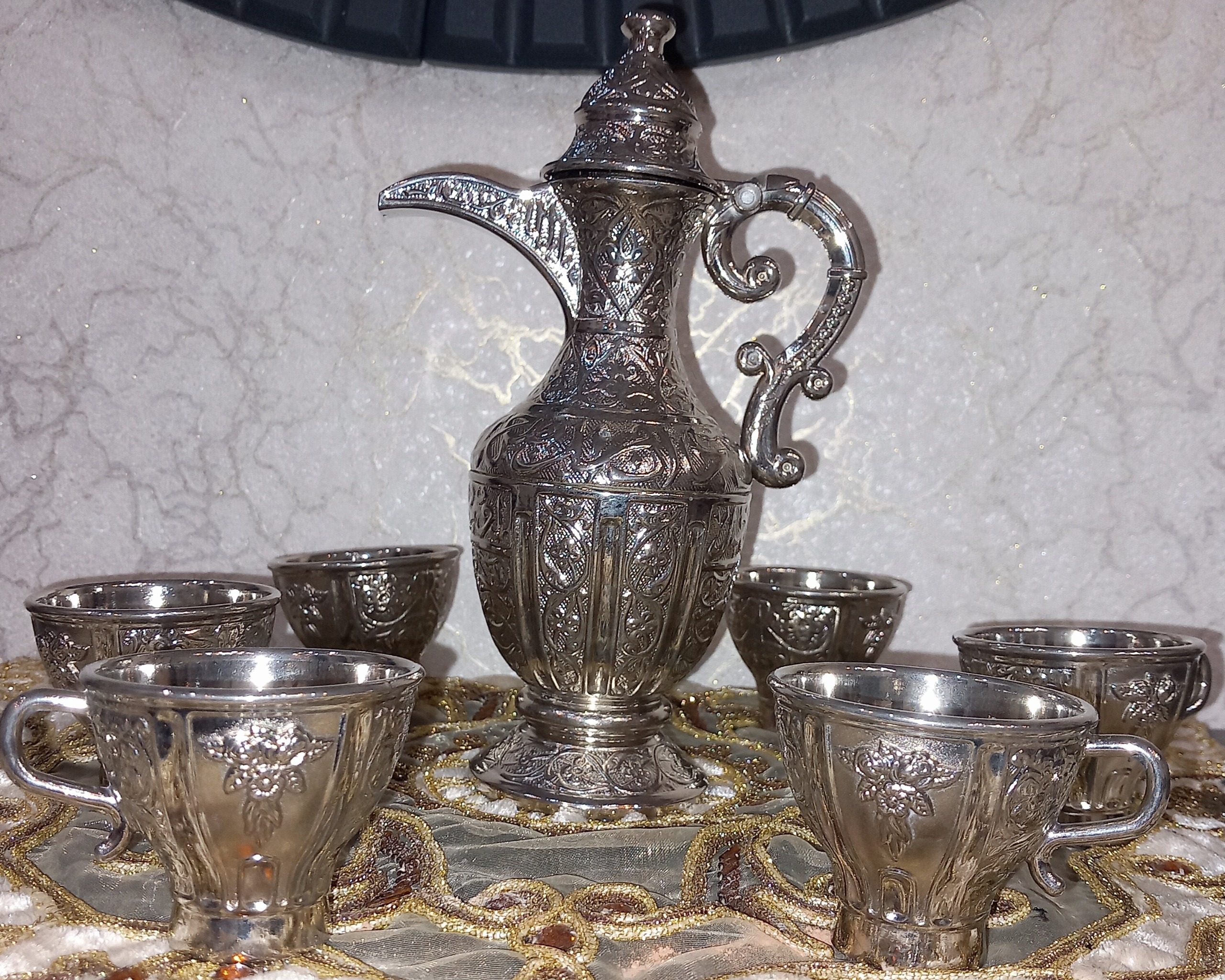 یکی از زیباترین کالای کلکسیونی و دکوری ترک که یک عدد جام شربت ریز و 6 عدد گیلاس خوری سلطنتی که تماما نقش و نگاری شده کاملا نو نو میباشد من خودم از ترکیه آوردم نام دار و فوقالعاده جذاب است